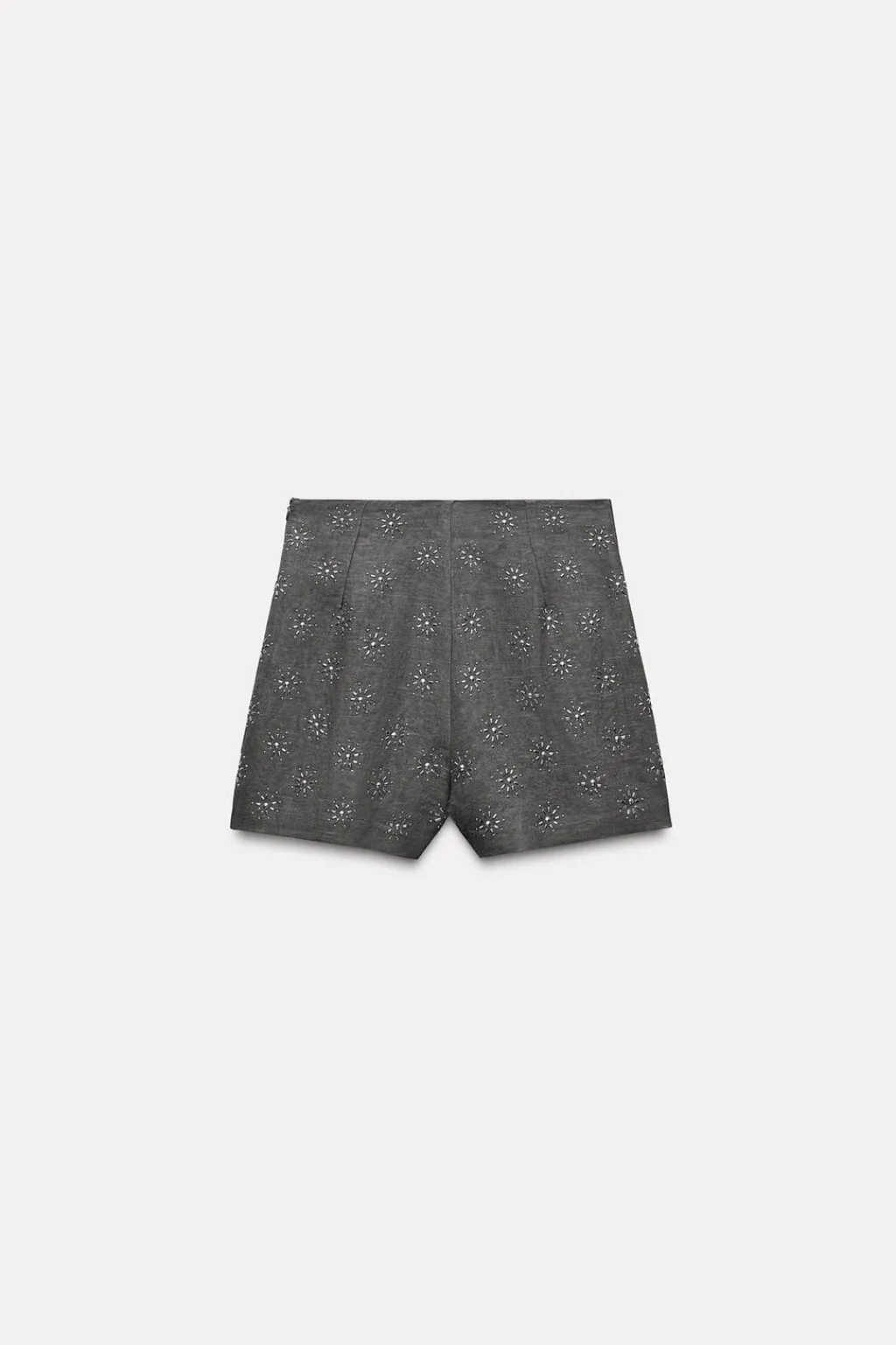 Shorts de tiro alto confeccionados en hilatura con mezcla de lino. Detalle de bordados con aplicación de abalorios. Cierre lateral con cremallera oculta en costura.