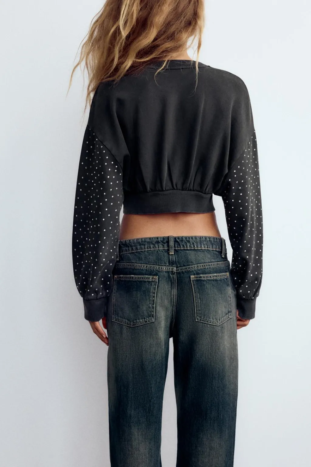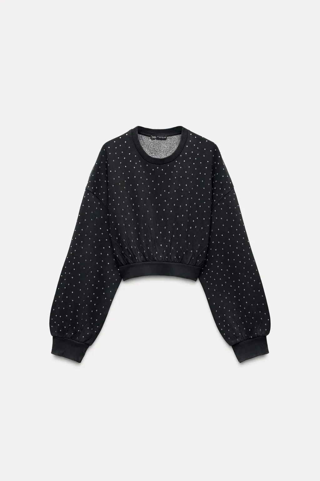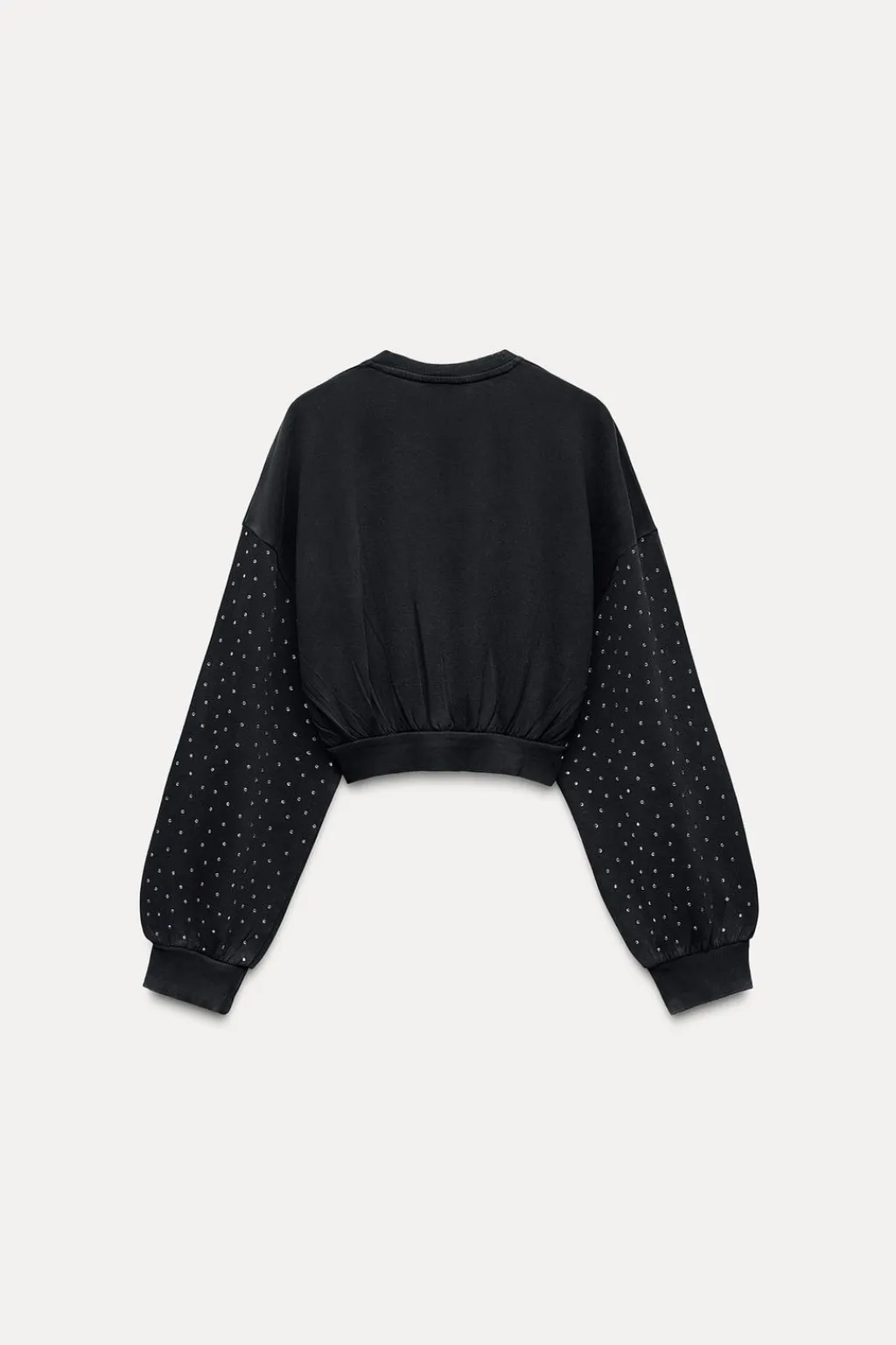 Sudadera crop de cuello redondo y manga larga. Acabados en rib. Detalle de joyas.