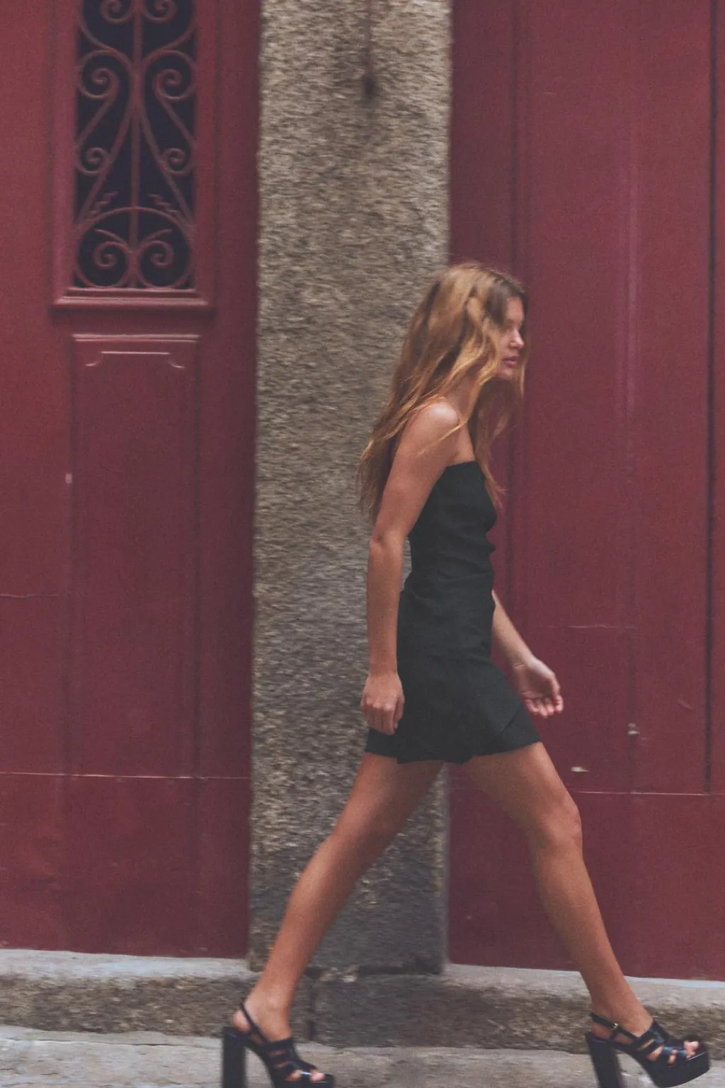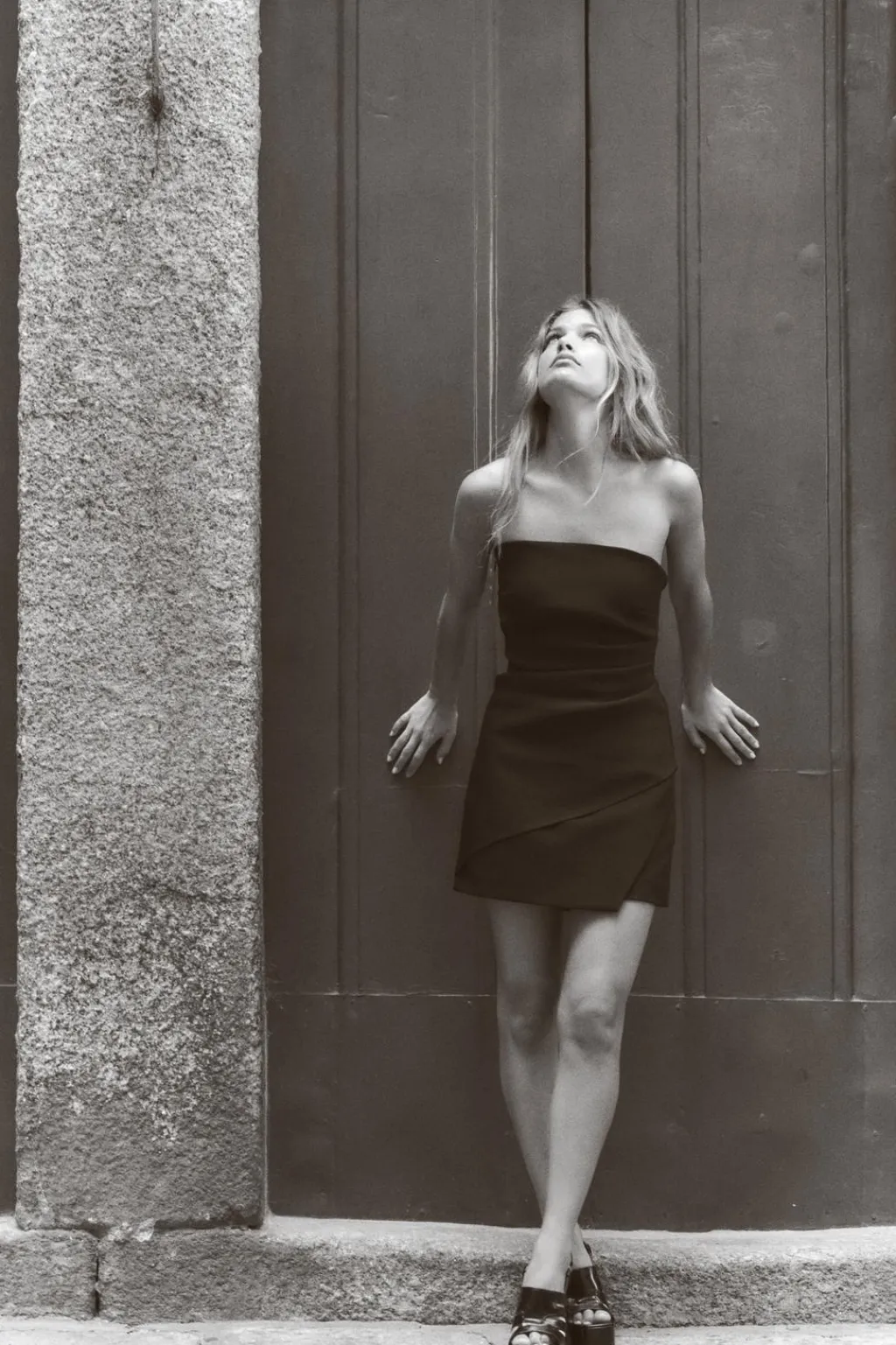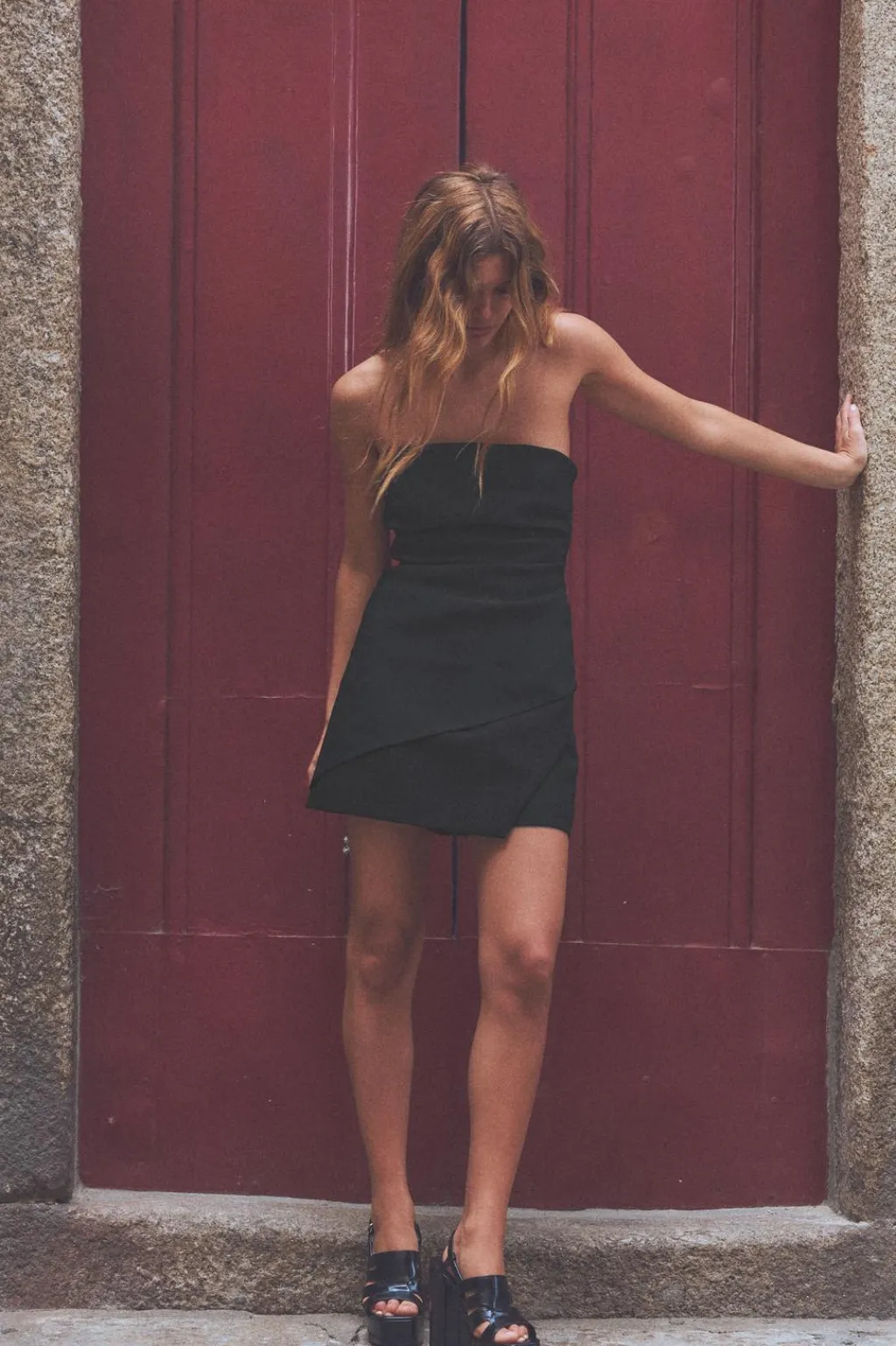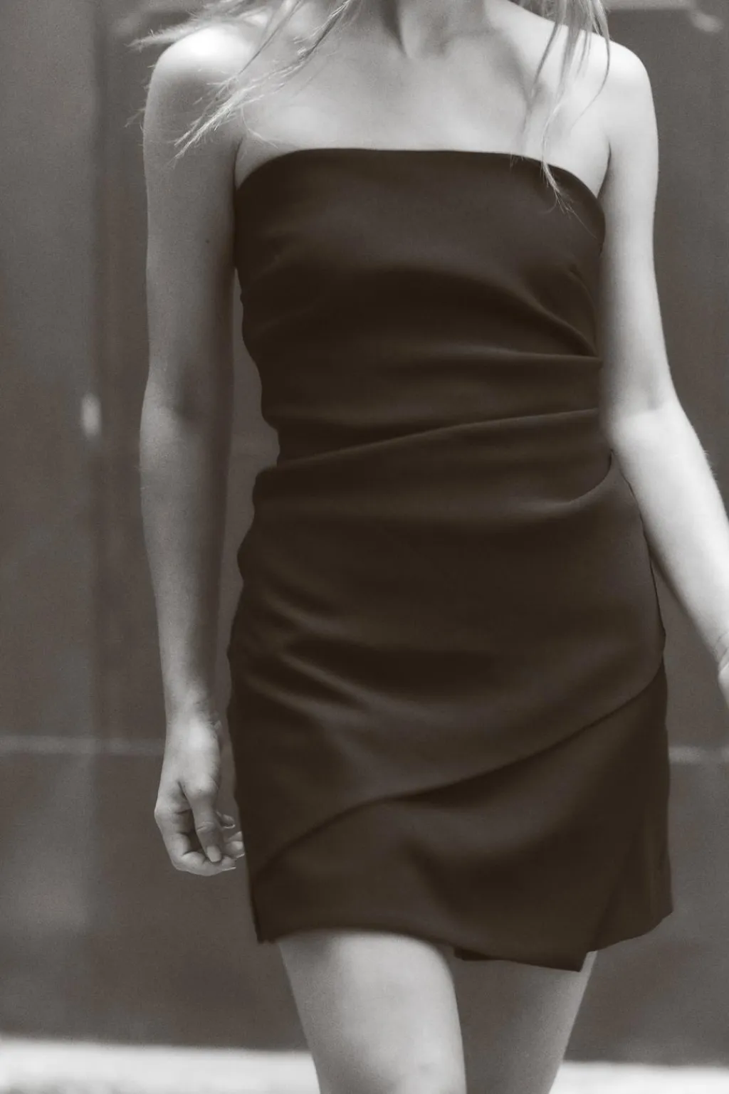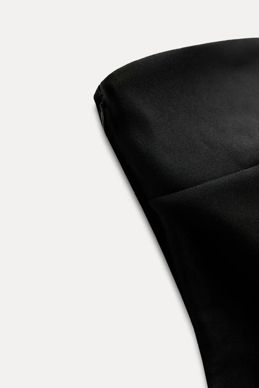 Top confeccionado en tejido elástico. Escote recto y hombros descubiertos. Detalle de frunces. Bajo acabado asimétrico. Cierre lateral con cremallera oculta en costura.