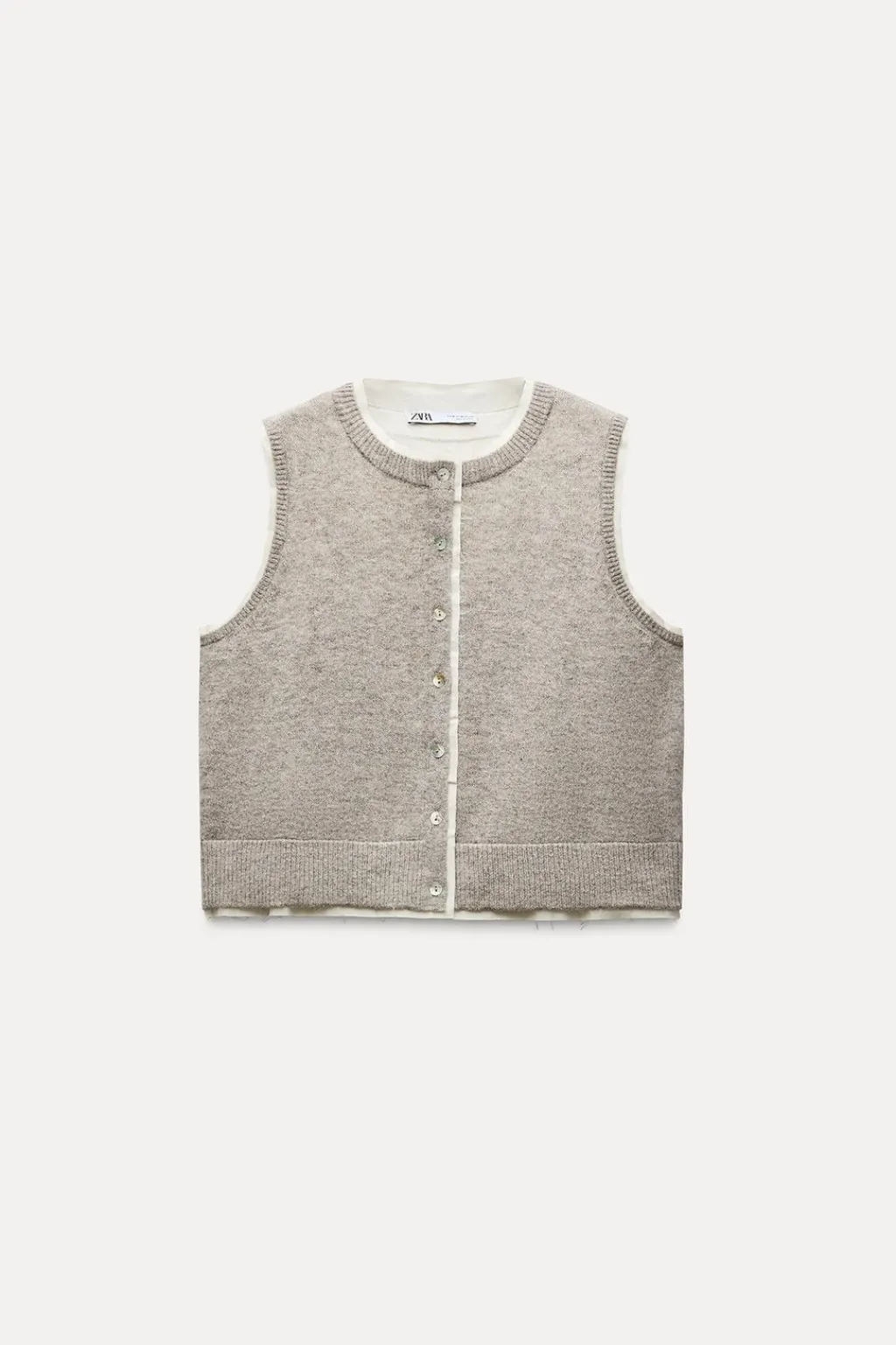 Top chaleco de cuello redondo y manga sisa. Detalle de tejido interior combinado. Cierre frontal con botones.