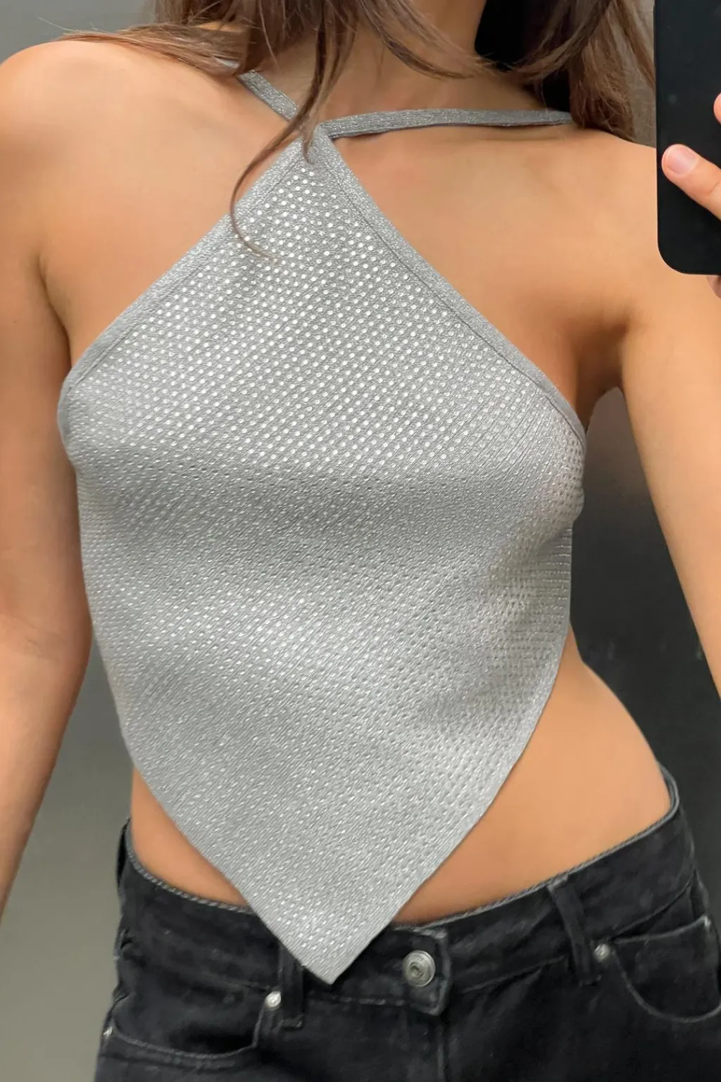 Top de cuello halter con brillos delanteros. Detalle de espalda abierta con tiras finas anudadas.
