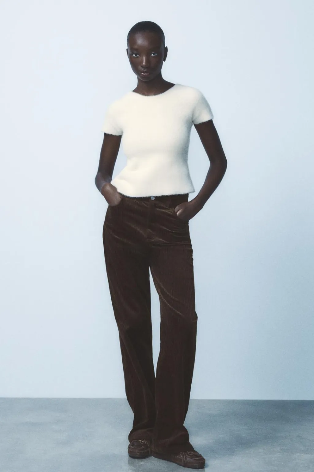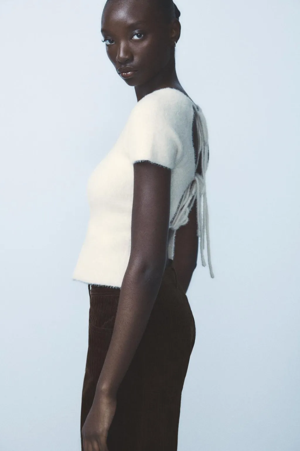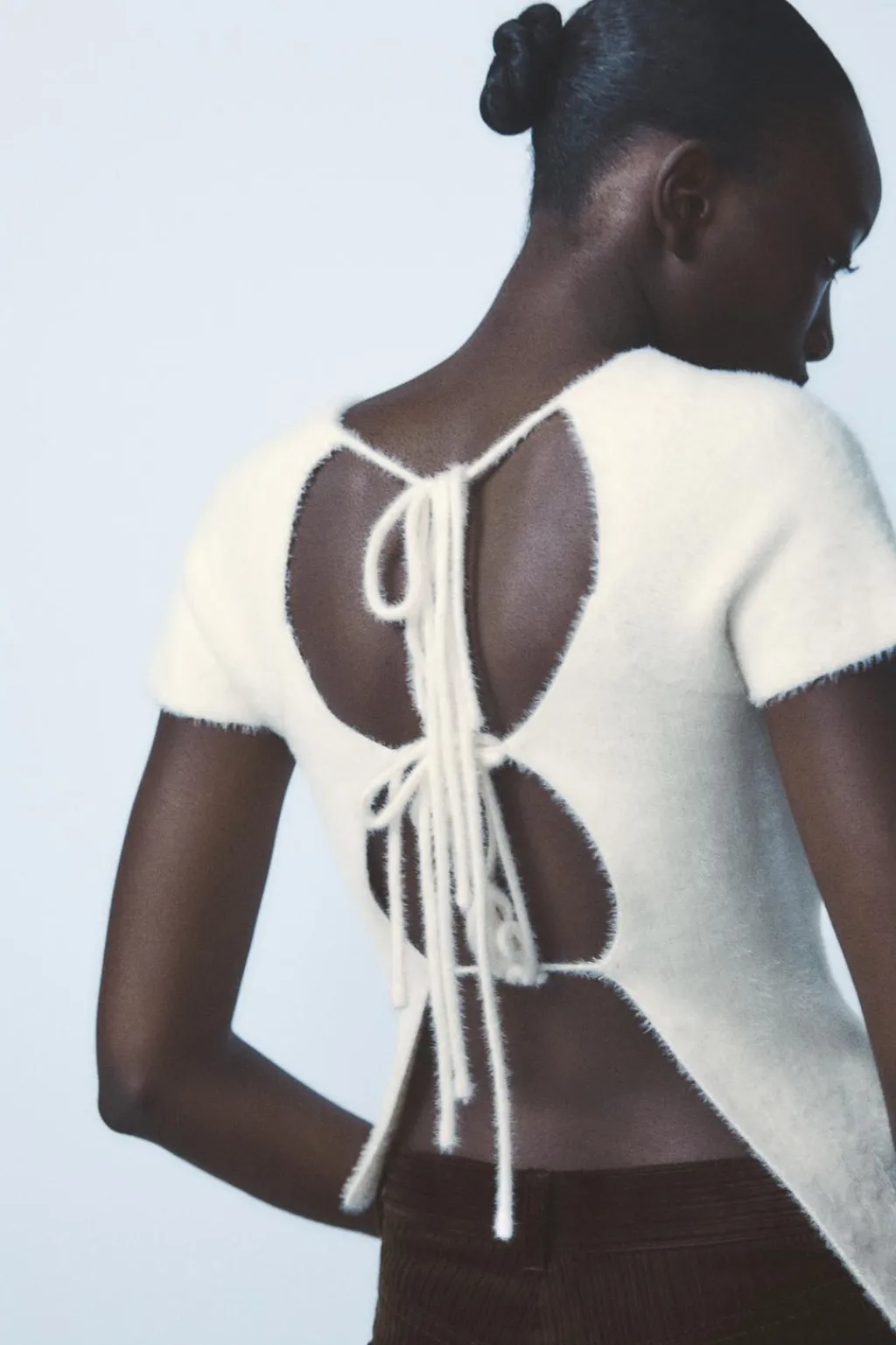 Top de cuello redondo y manga corta. Tejido tacto suave. Bajo acabado asimétrico. Espalda descubierta y cierre con lazadas en mismo tejido.