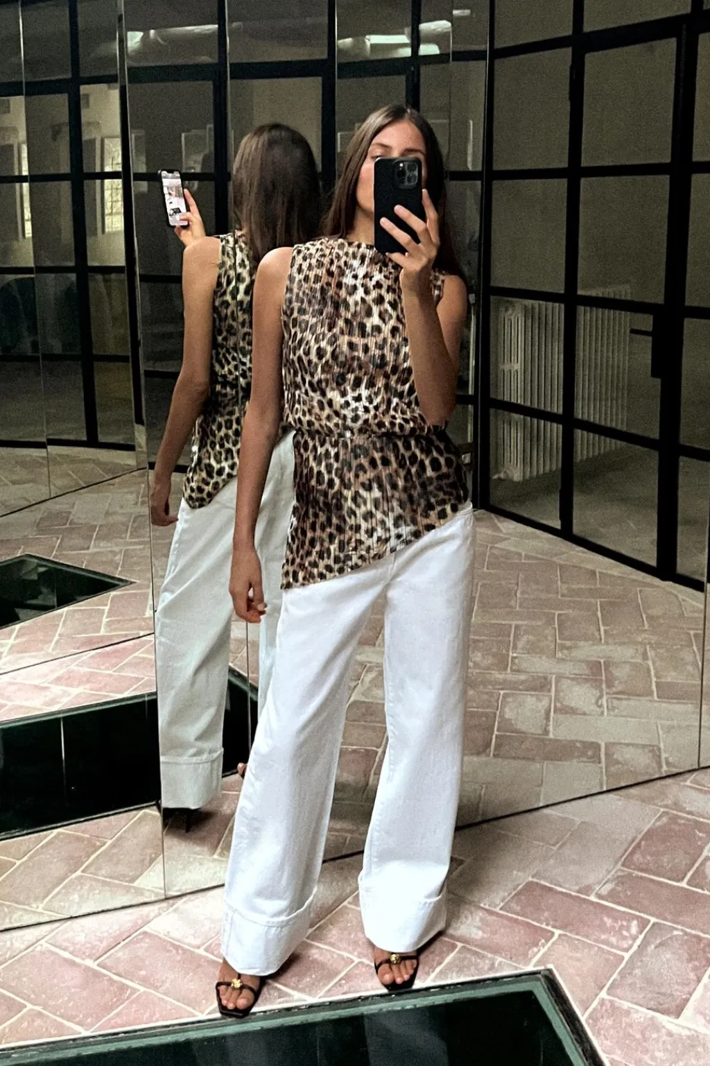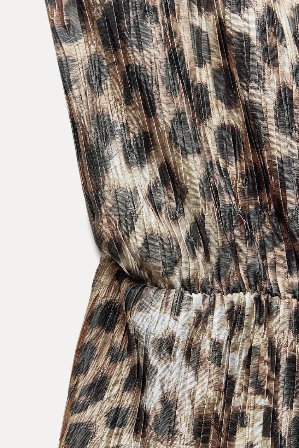 Top de cuello redondo y manga sisa. Detalle de tejido plisado y elástico en cintura. Bajo asimétrico.