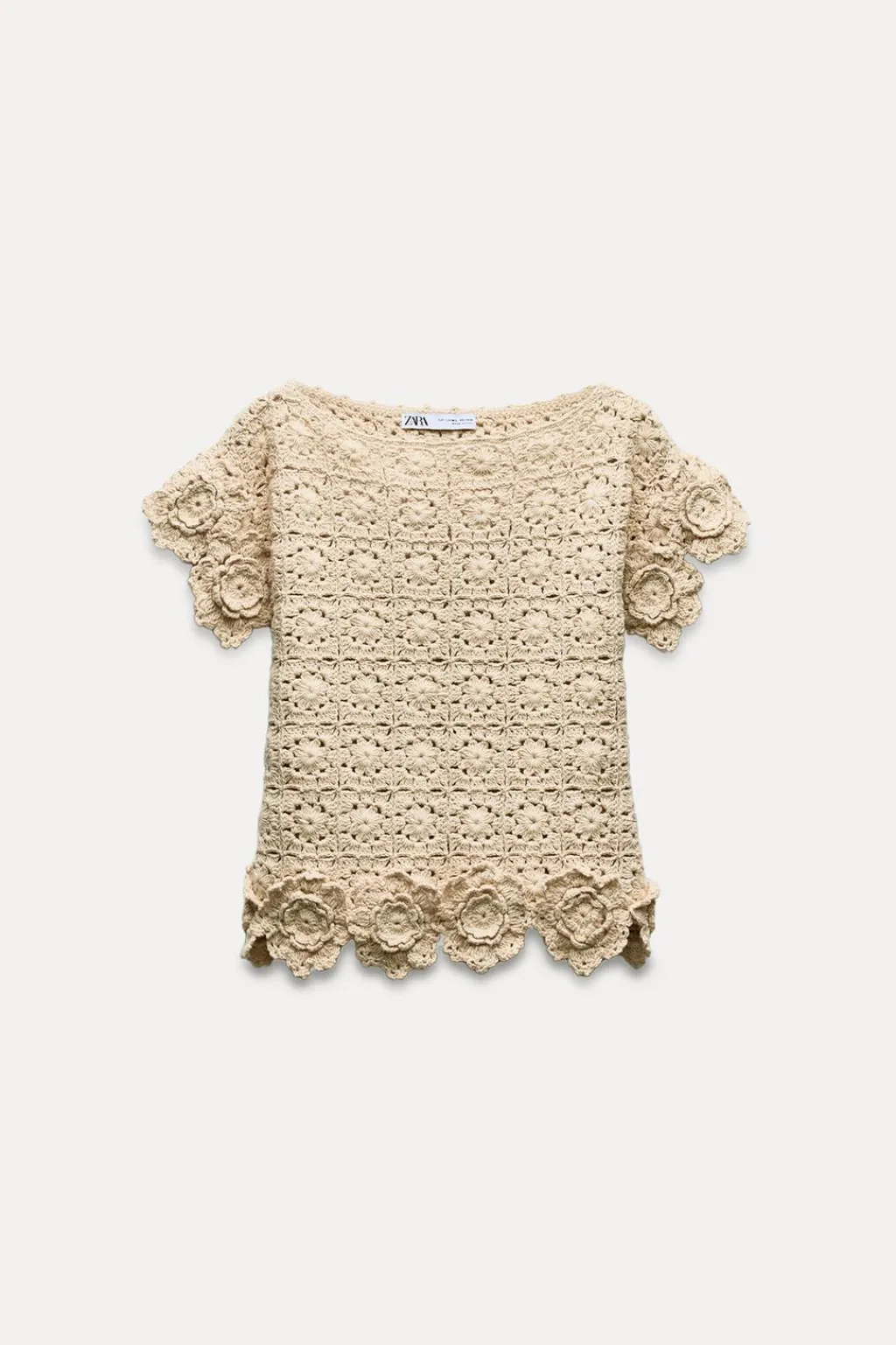 Top de cuello redondo amplio y manga corta. Detalle de acabados con tejido en estructura en forma de flor.