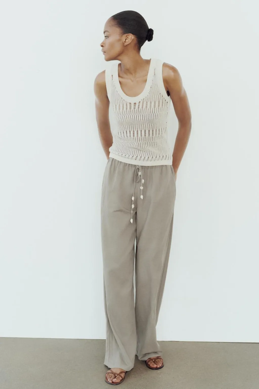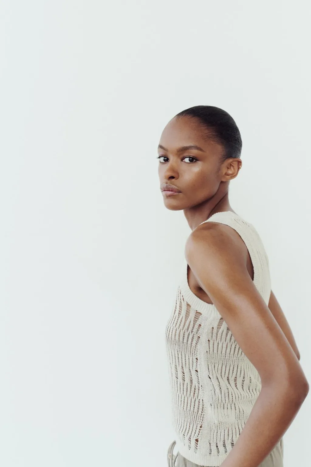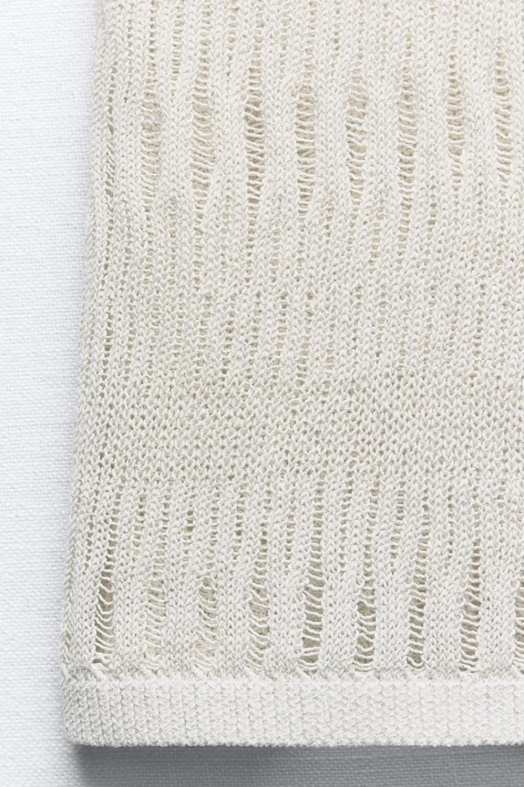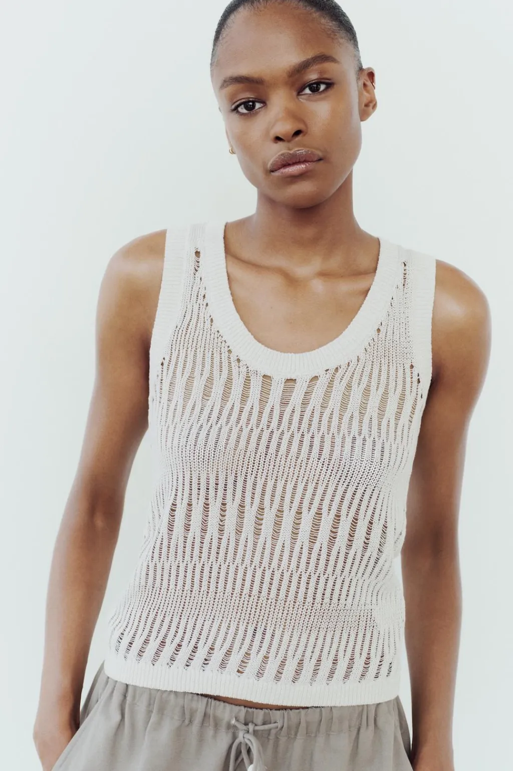 Top de escote redondo y manga sisa. Detalle de tejido con aberturas e hilo metalizado.