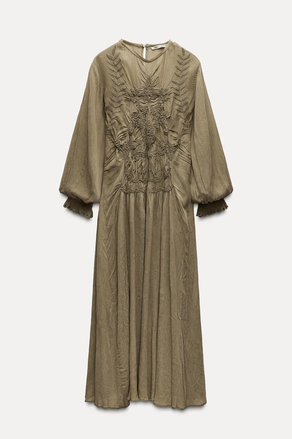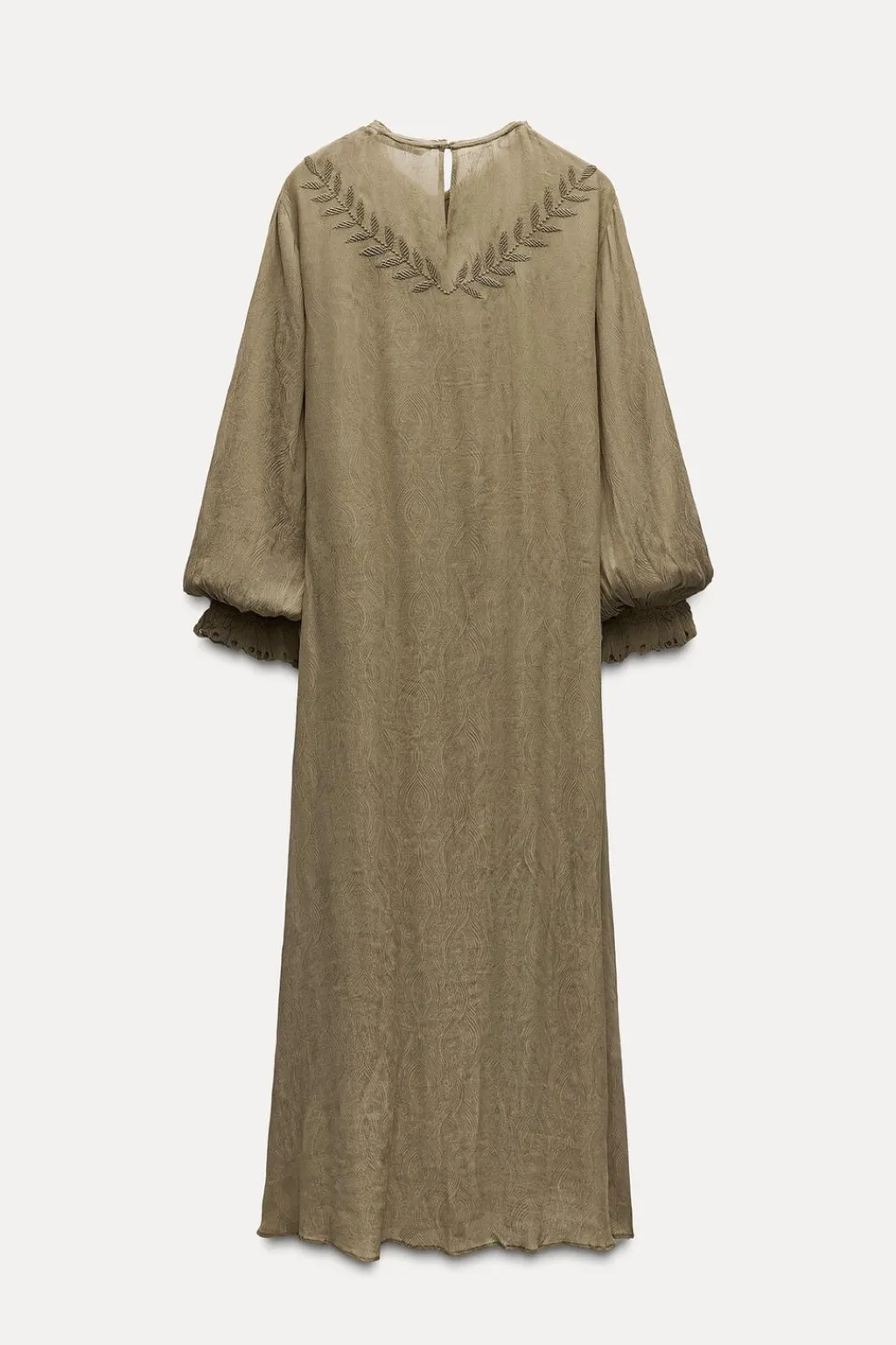Vestido midi confeccionado en hilatura con viscosa. Cuello redondo y manga larga abullonada acabada en volante. Detalle de bordado delantero y tejido en jacquard. Cierre en espalda con abertura y botón.