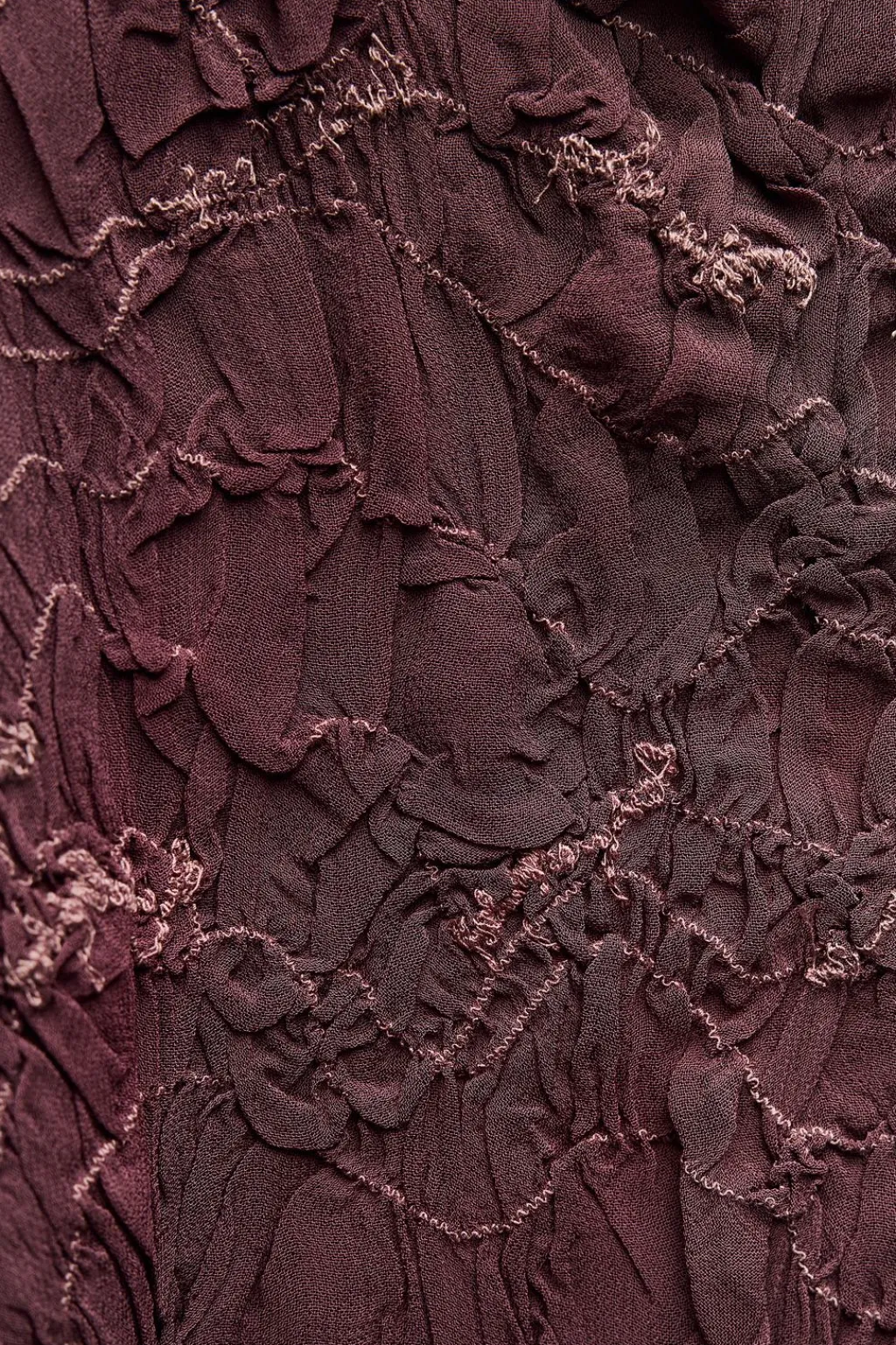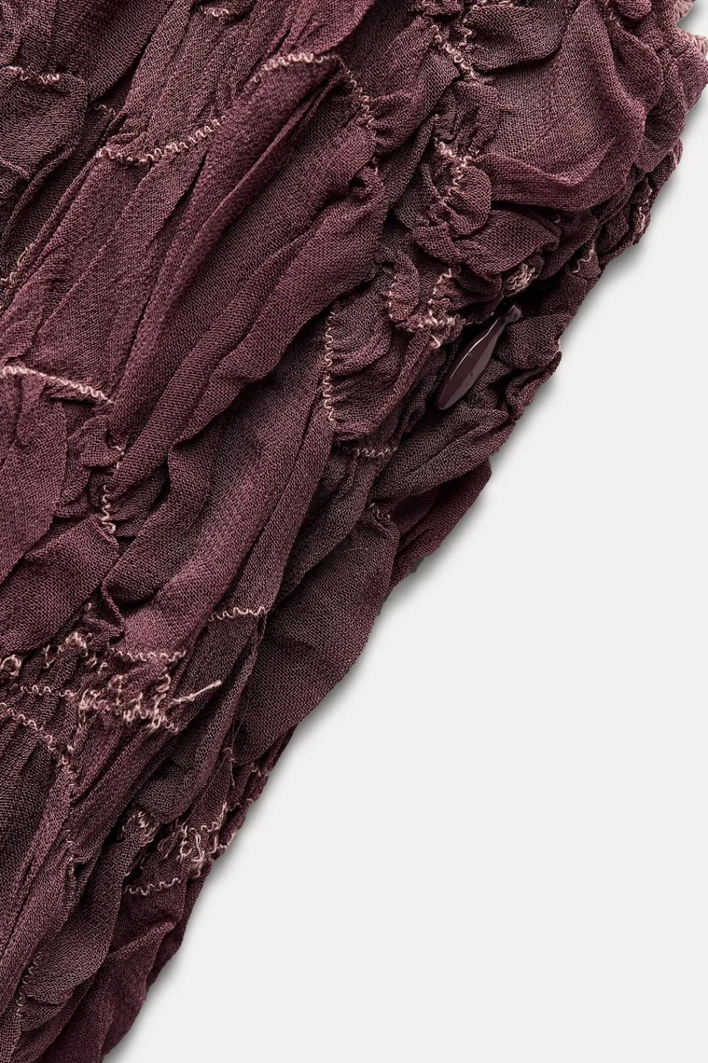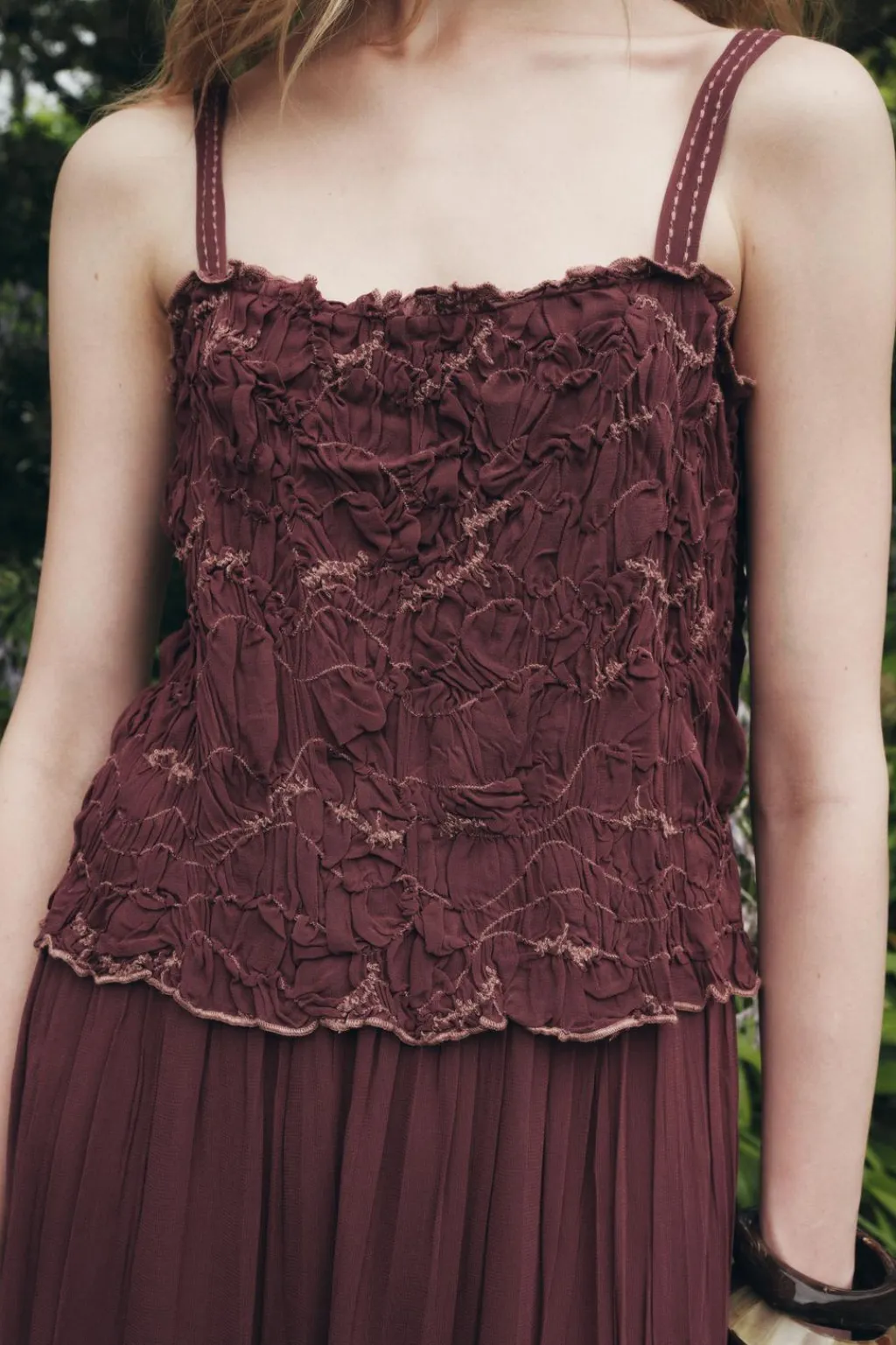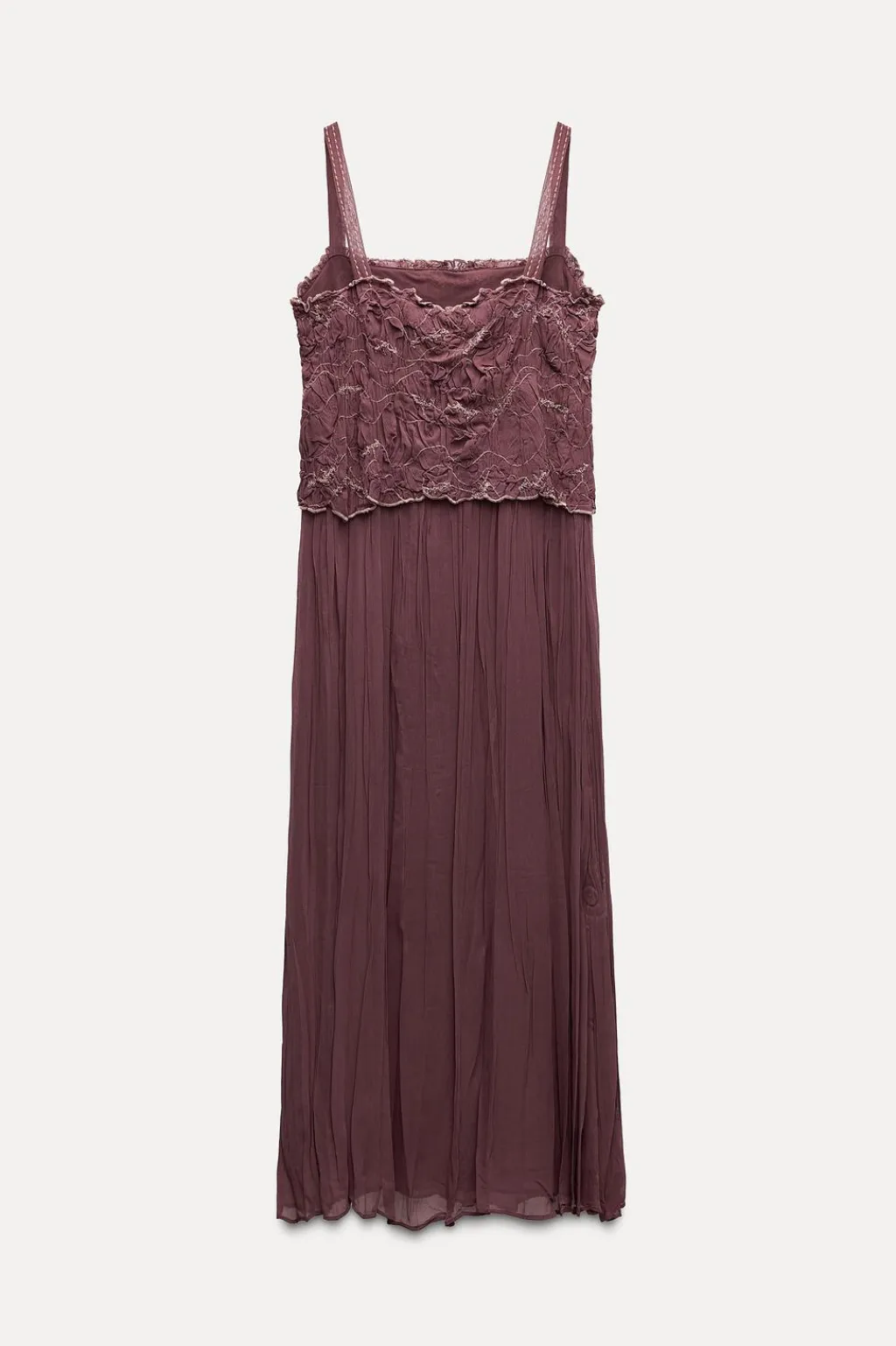 Vestido midi confeccionado en hilatura de viscosa. Escote recto y tirantes finos. Detalle de bordados a contraste y tejido arrugado.