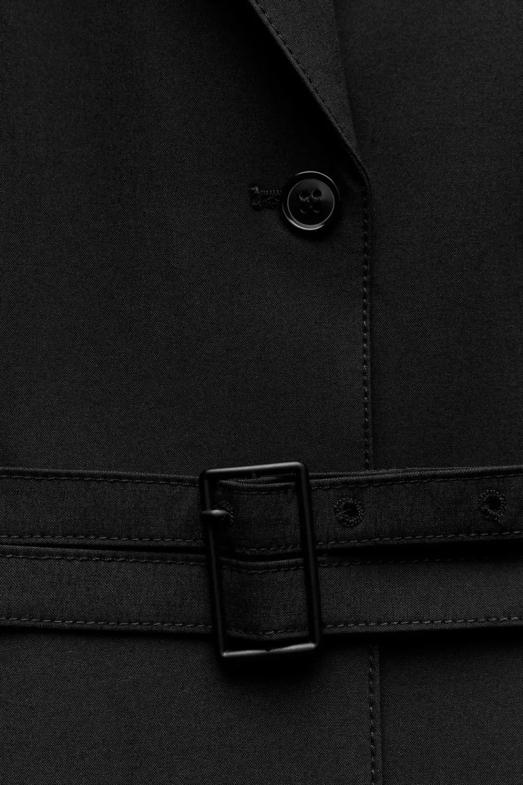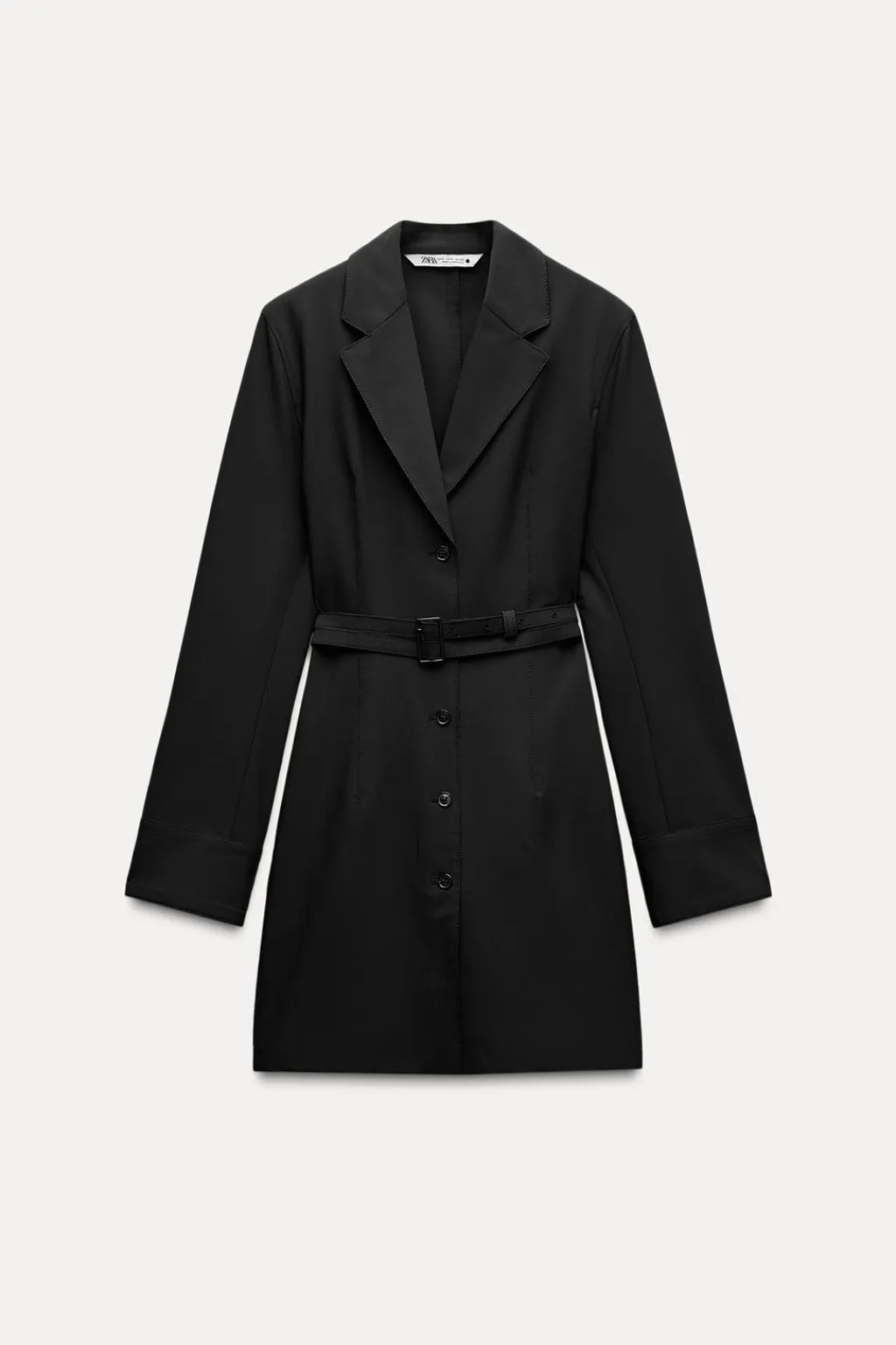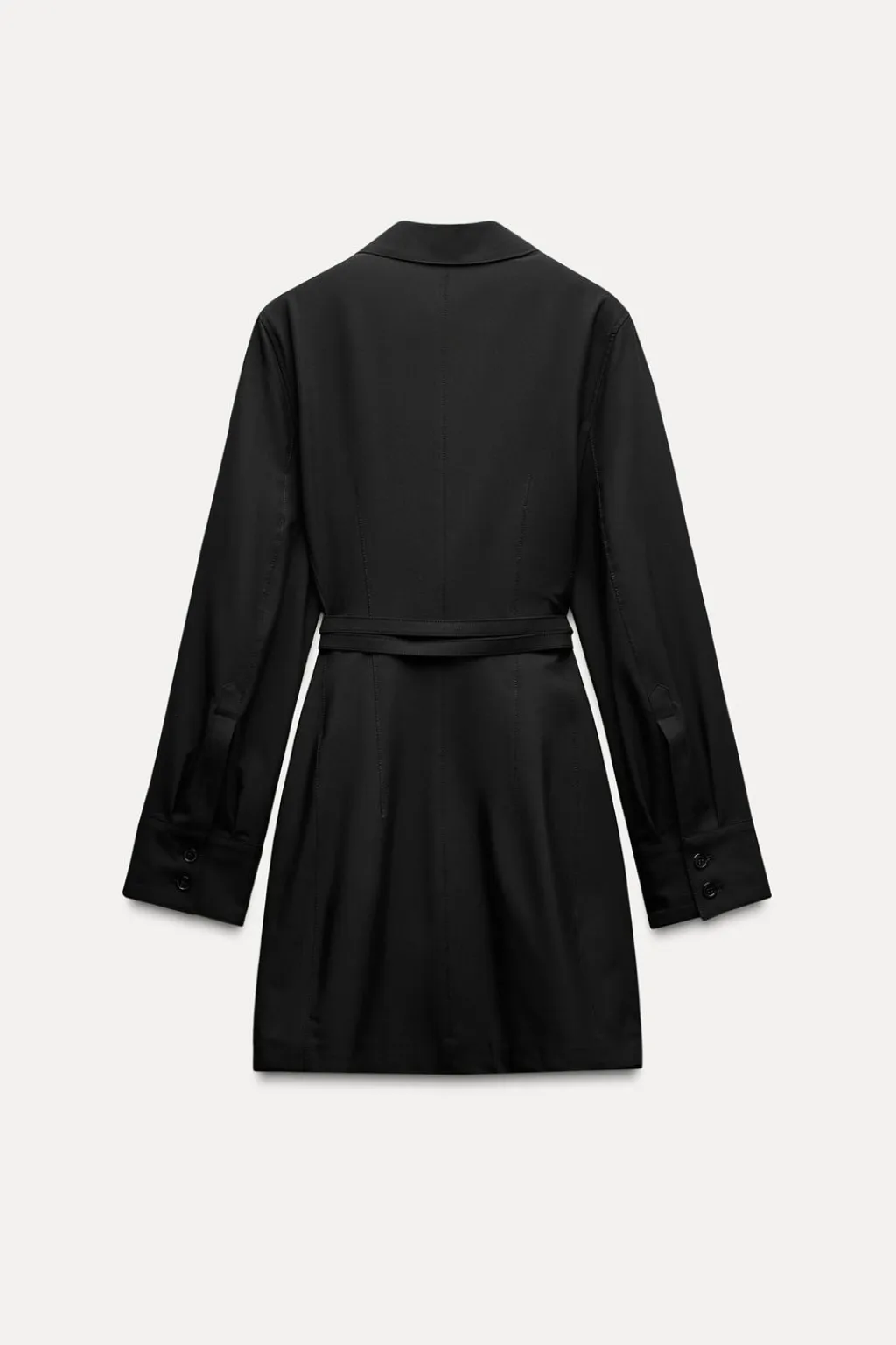 Vestido corto con cuello solapa de muescas y manga larga acabada en botones. Cinturón en mismo tejido ajustable con hebilla metálica. Cierre frontal con botones.