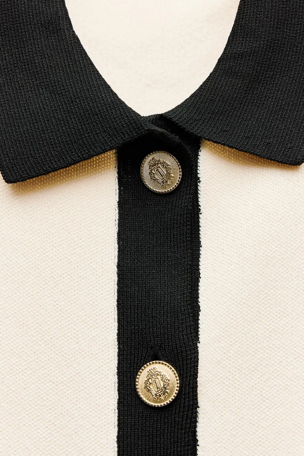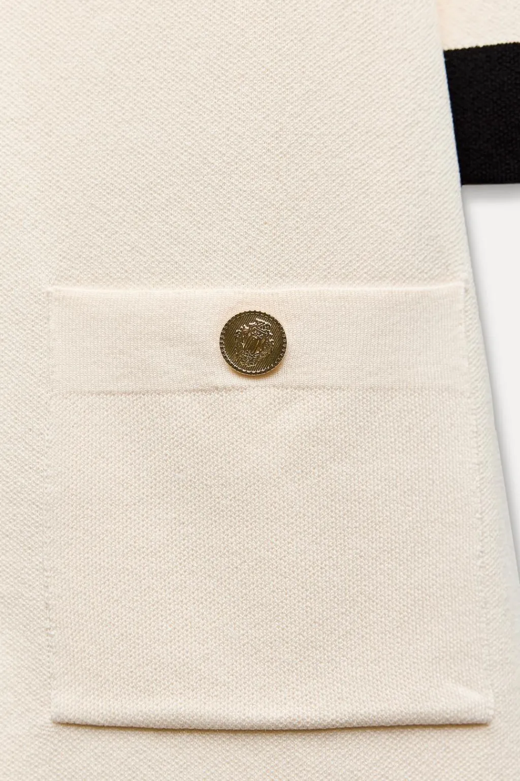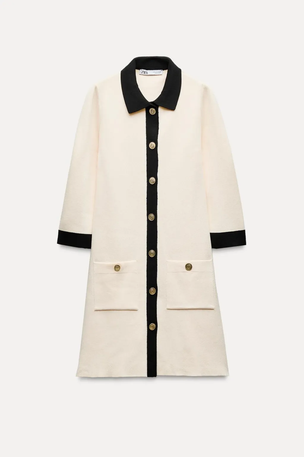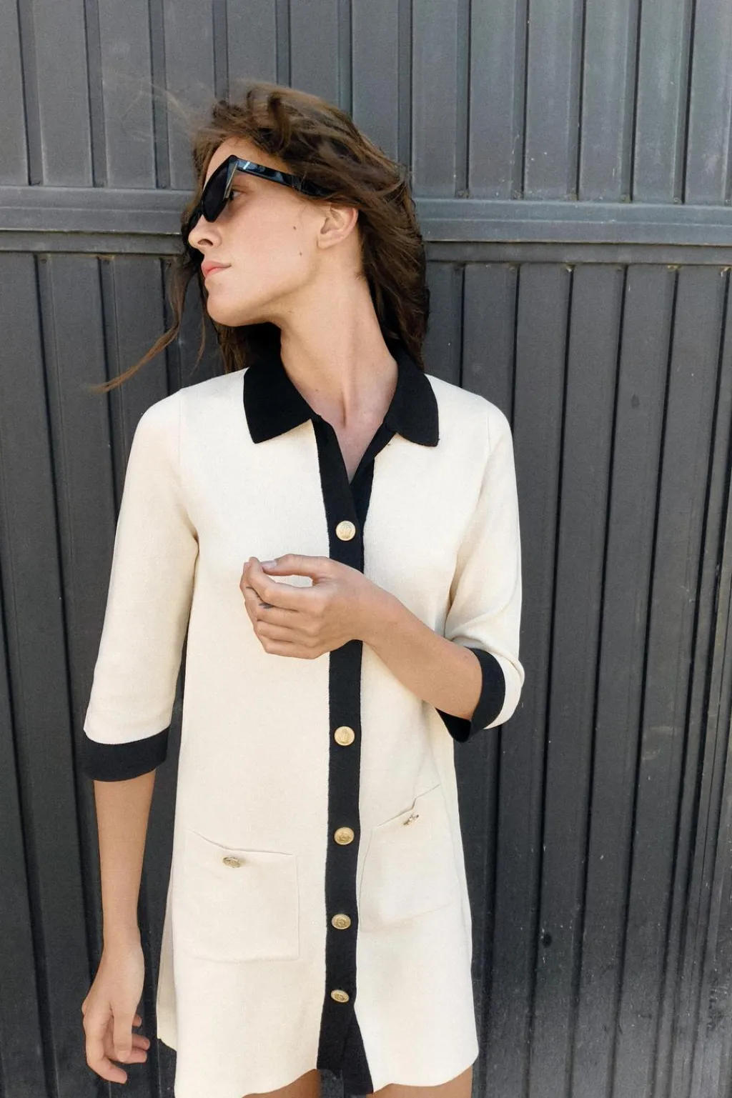 Vestido de cuello solapa y manga por debajo del codo. Bolsillos delanteros de plastrón. Cierre frontal con botones dorados con relieve.