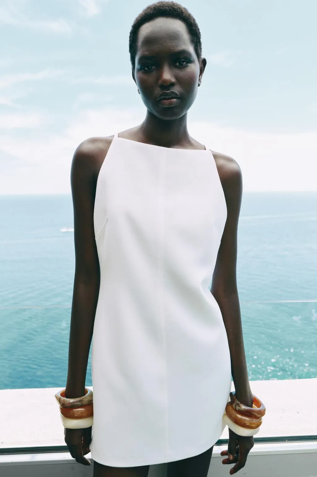 Vestido corto de cuello halter. Detalle de pespuntes marcados combinados a tono. Cierre en espalda con cremallera oculta en costura.