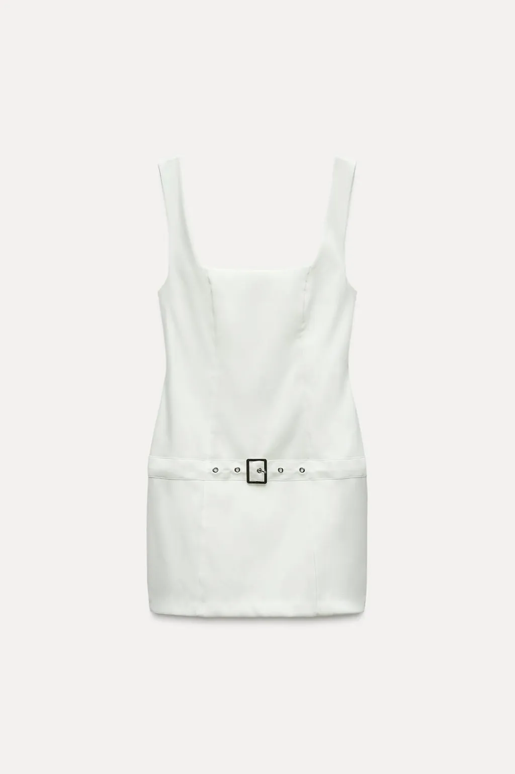 Vestido entallado de escote cuadrado y tirantes. Detalle aplicación cinturón en mismo tejido con hebilla metálica.