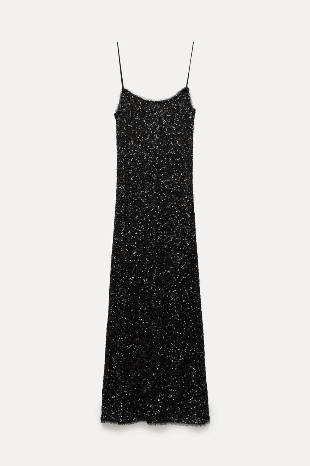 Vestido midi de escote redondo y tirantes finos. Detalle de aplicación de lentejuelas. Forro interior a contraste.
