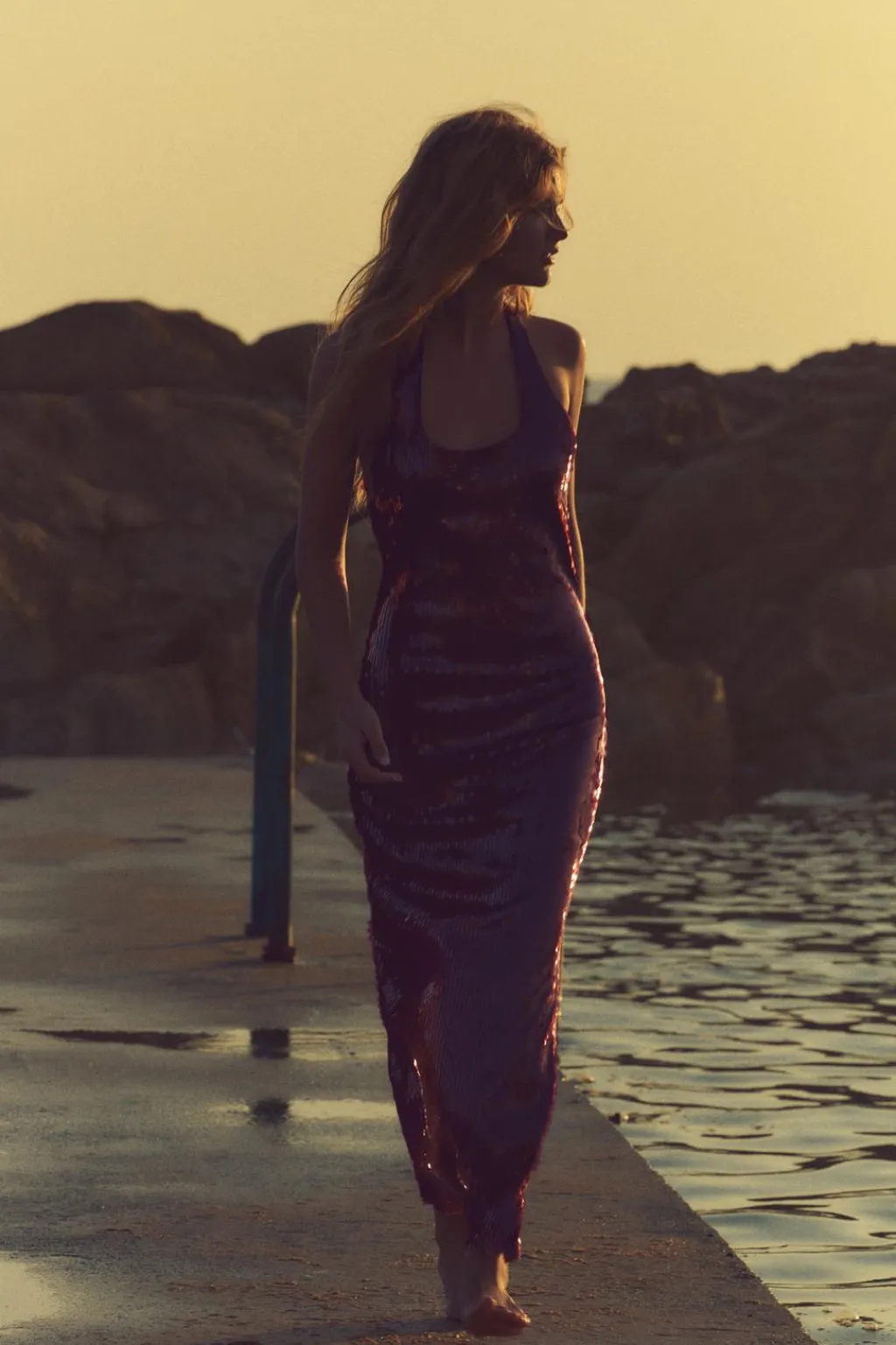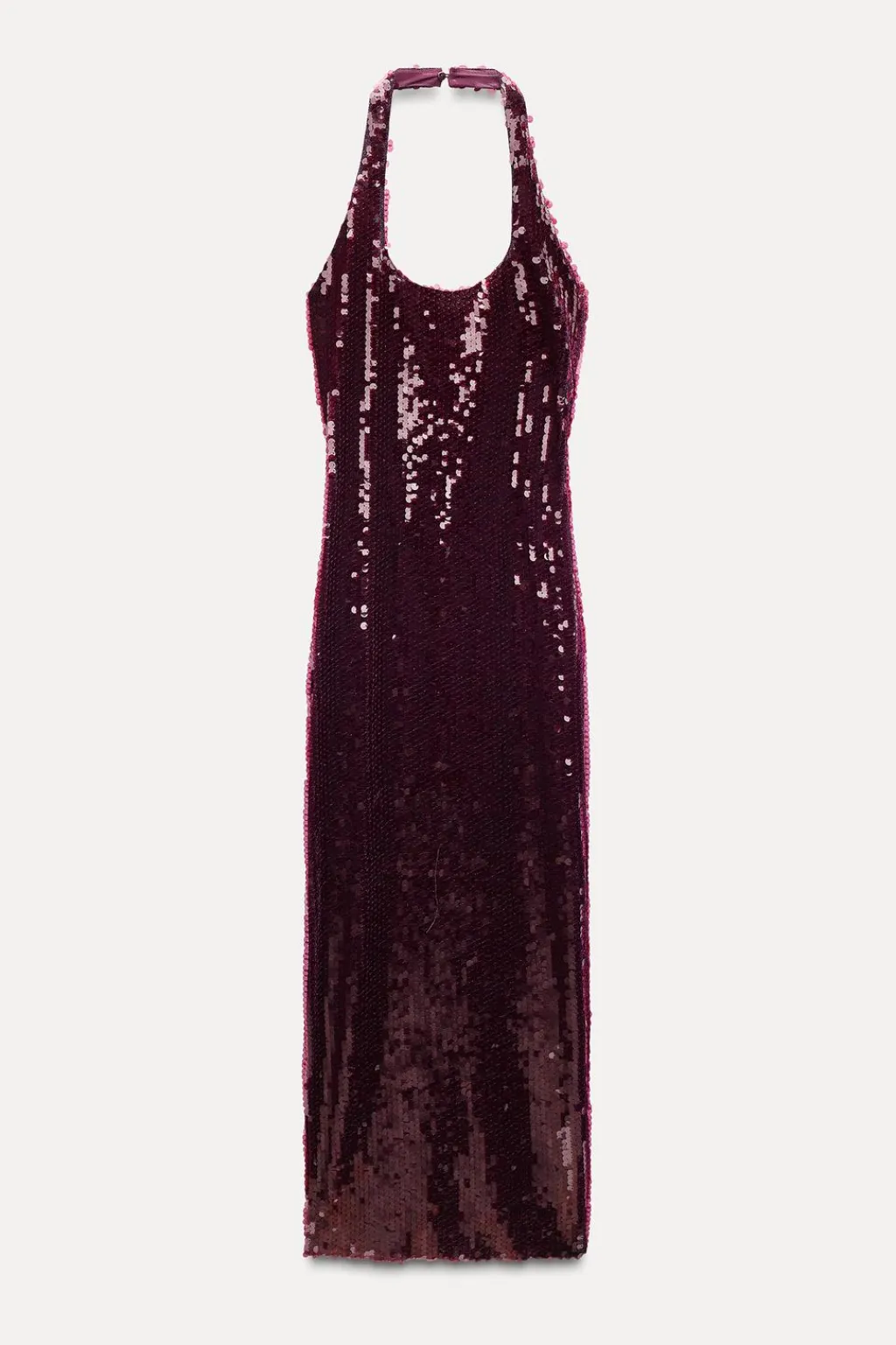 Vestido midi de cuello halter y escote redondo. Espalda descubierta. Detalle aplicación lentejuelas. Cierre en cuello con botones.