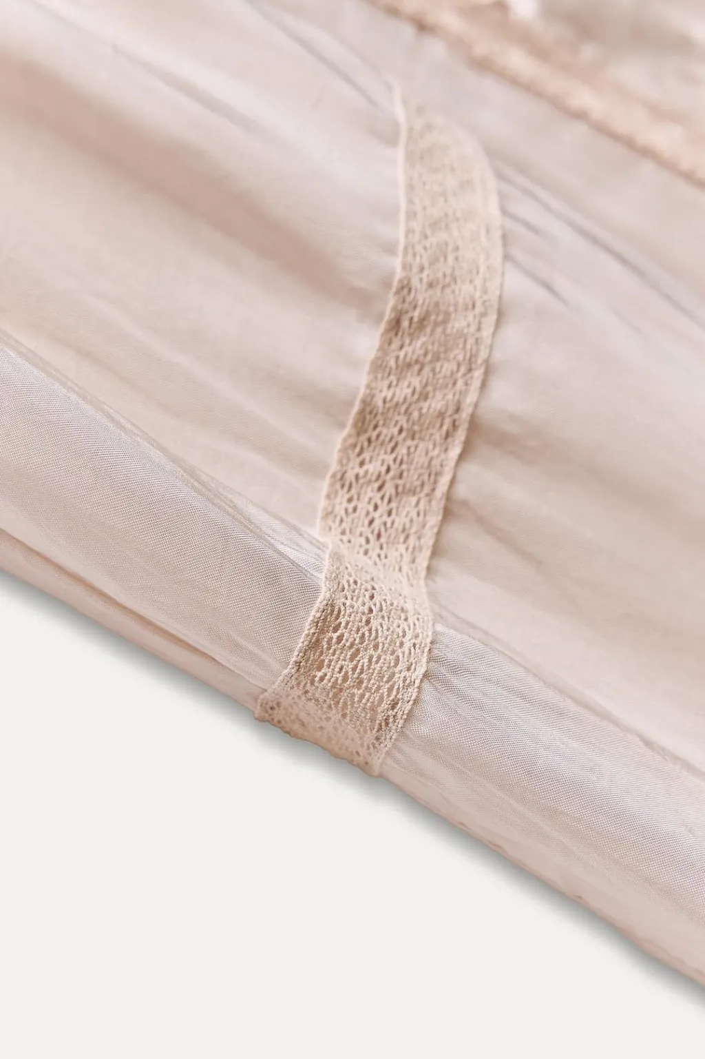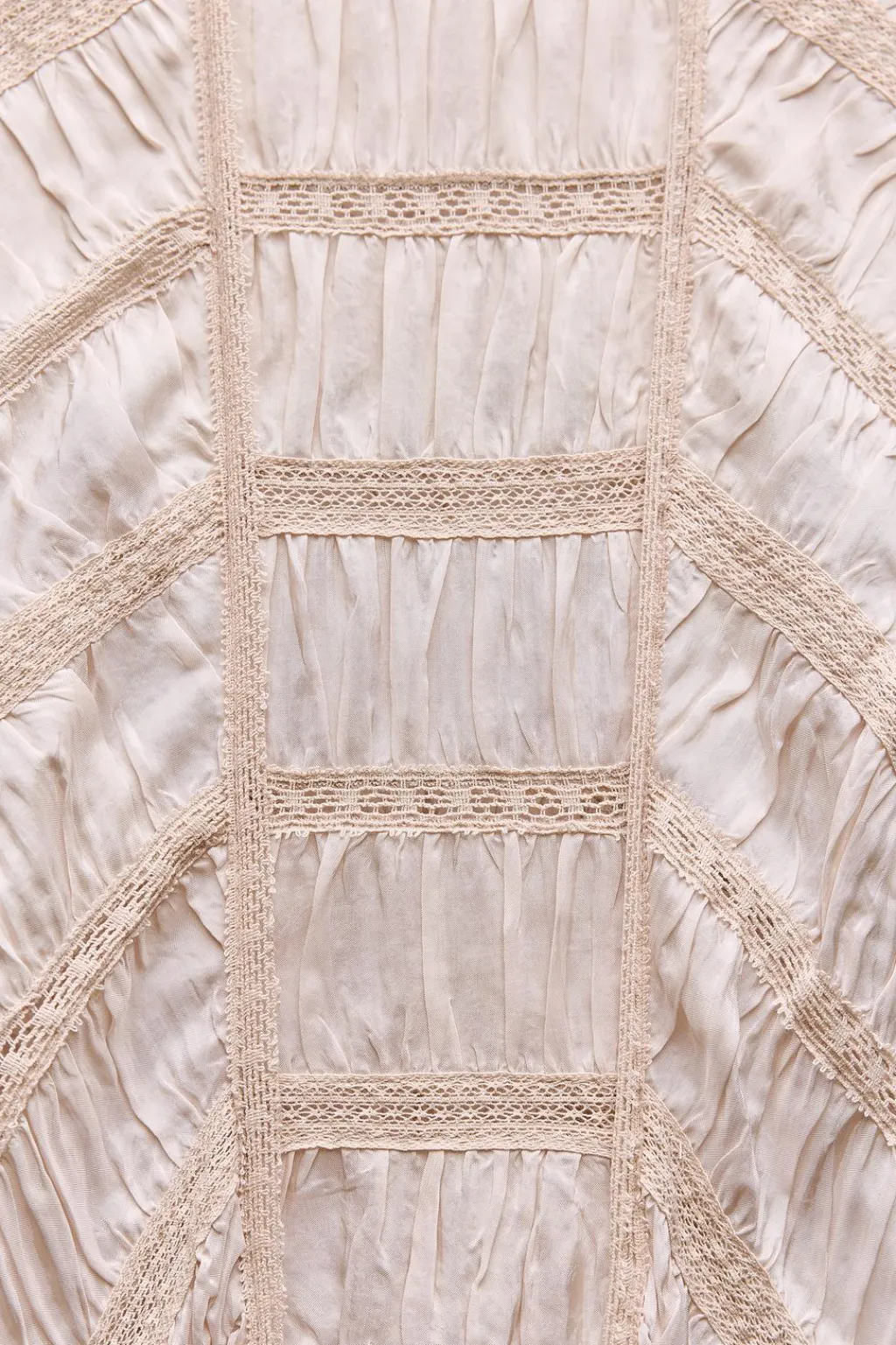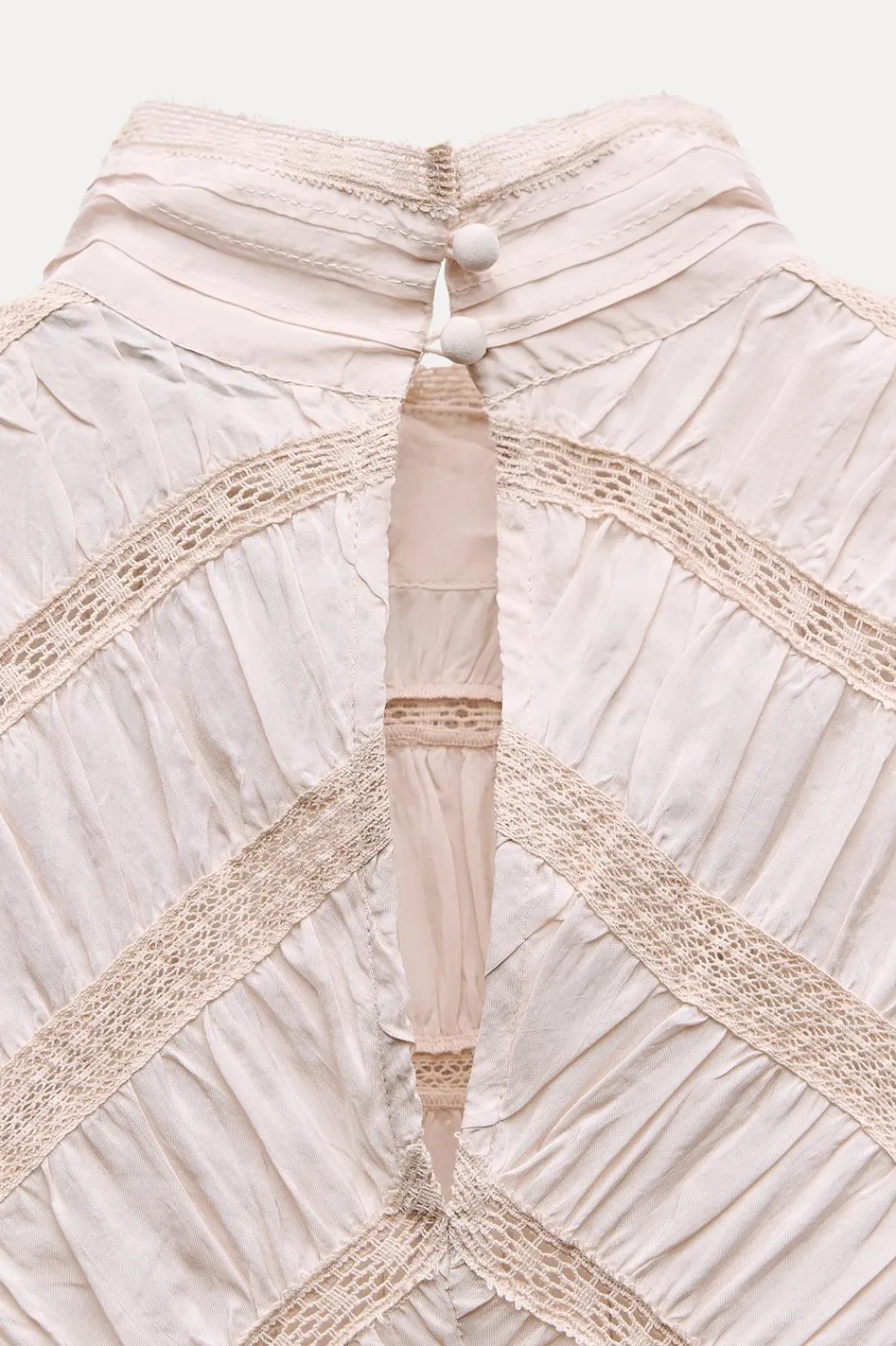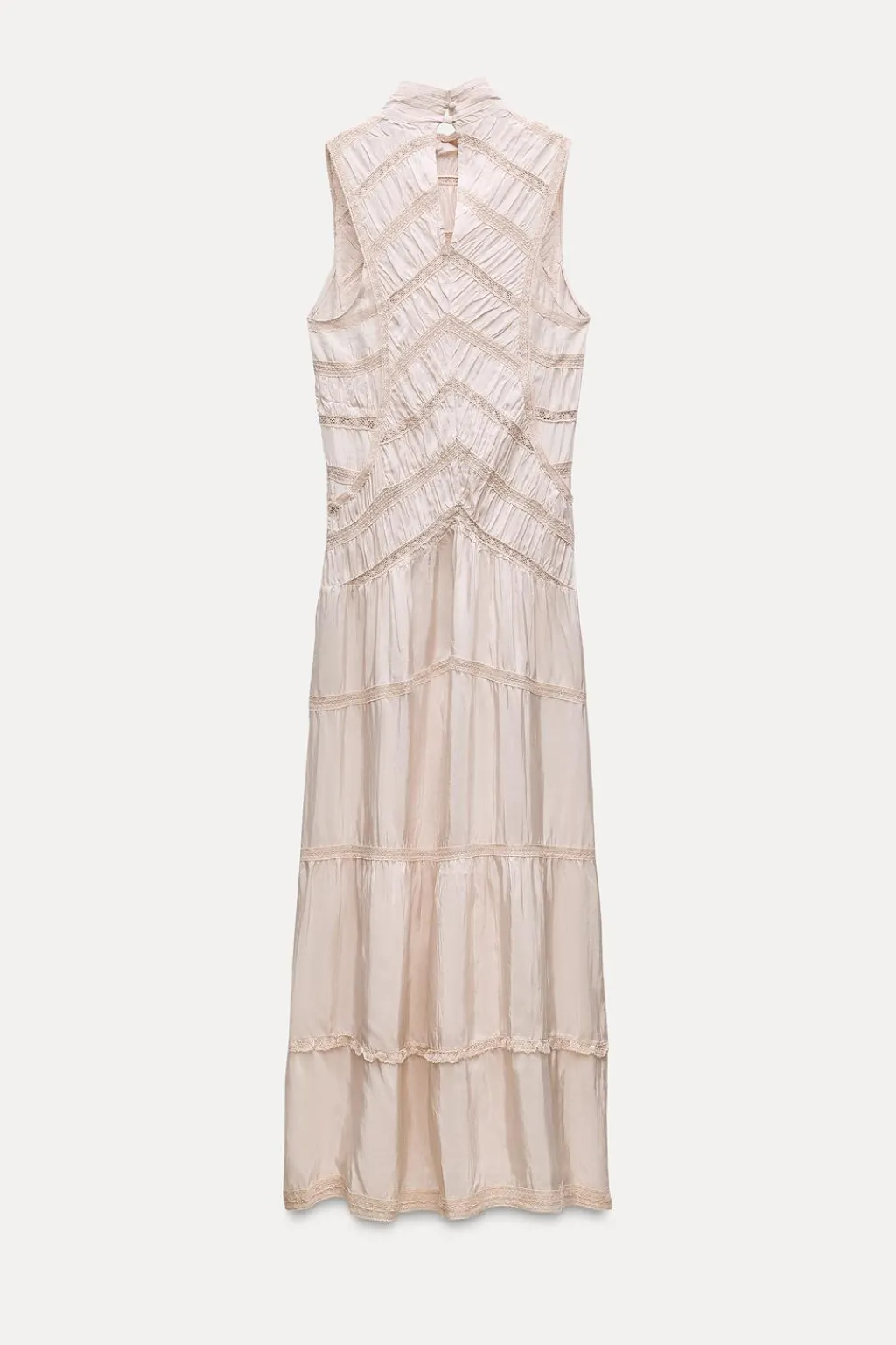 Vestido largo de cuello perkins y manga sisa. Detalle de aplicación de encaje a tono y tejido arrugado. Cierre en espalda con abertura y botón.