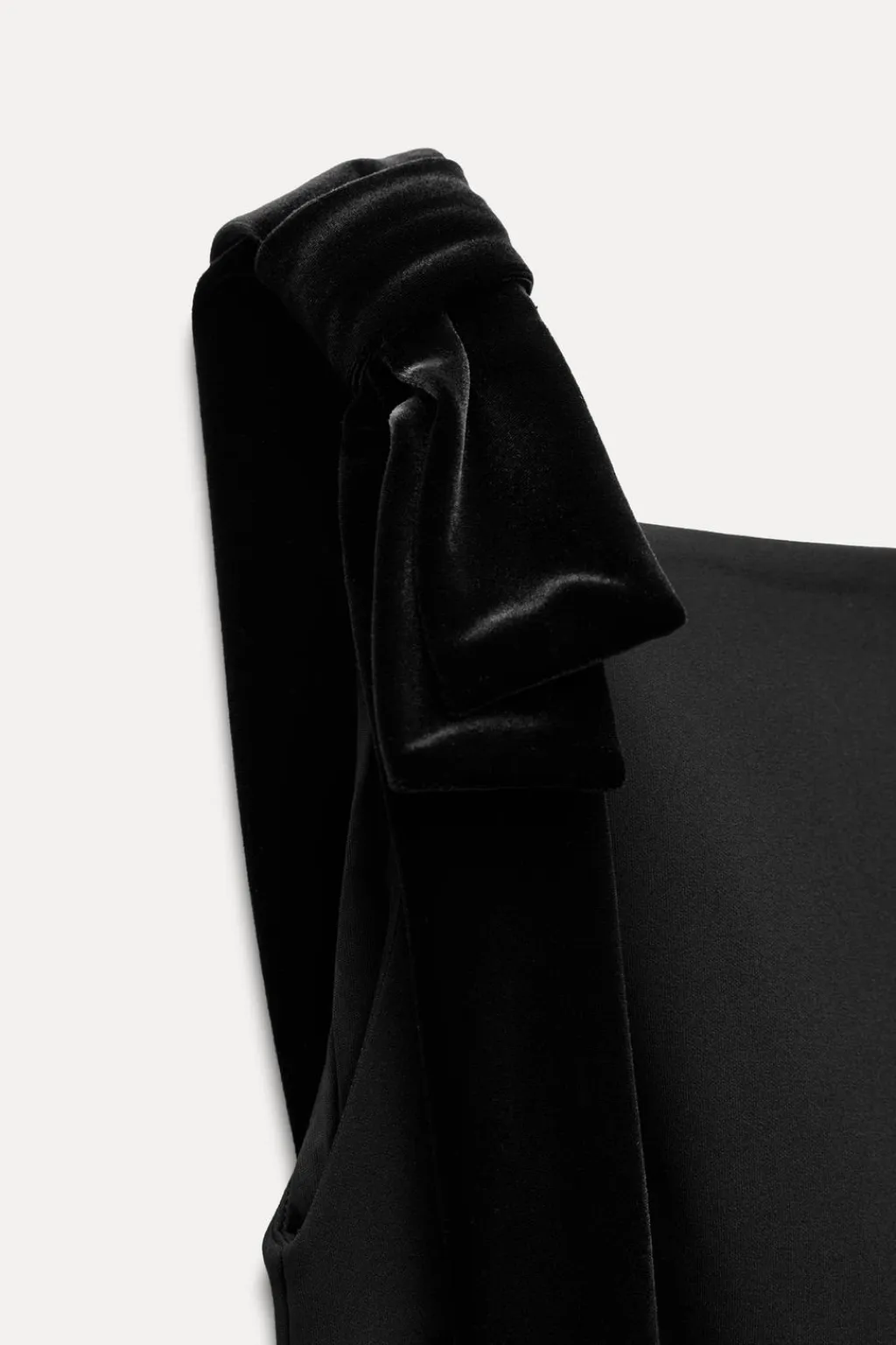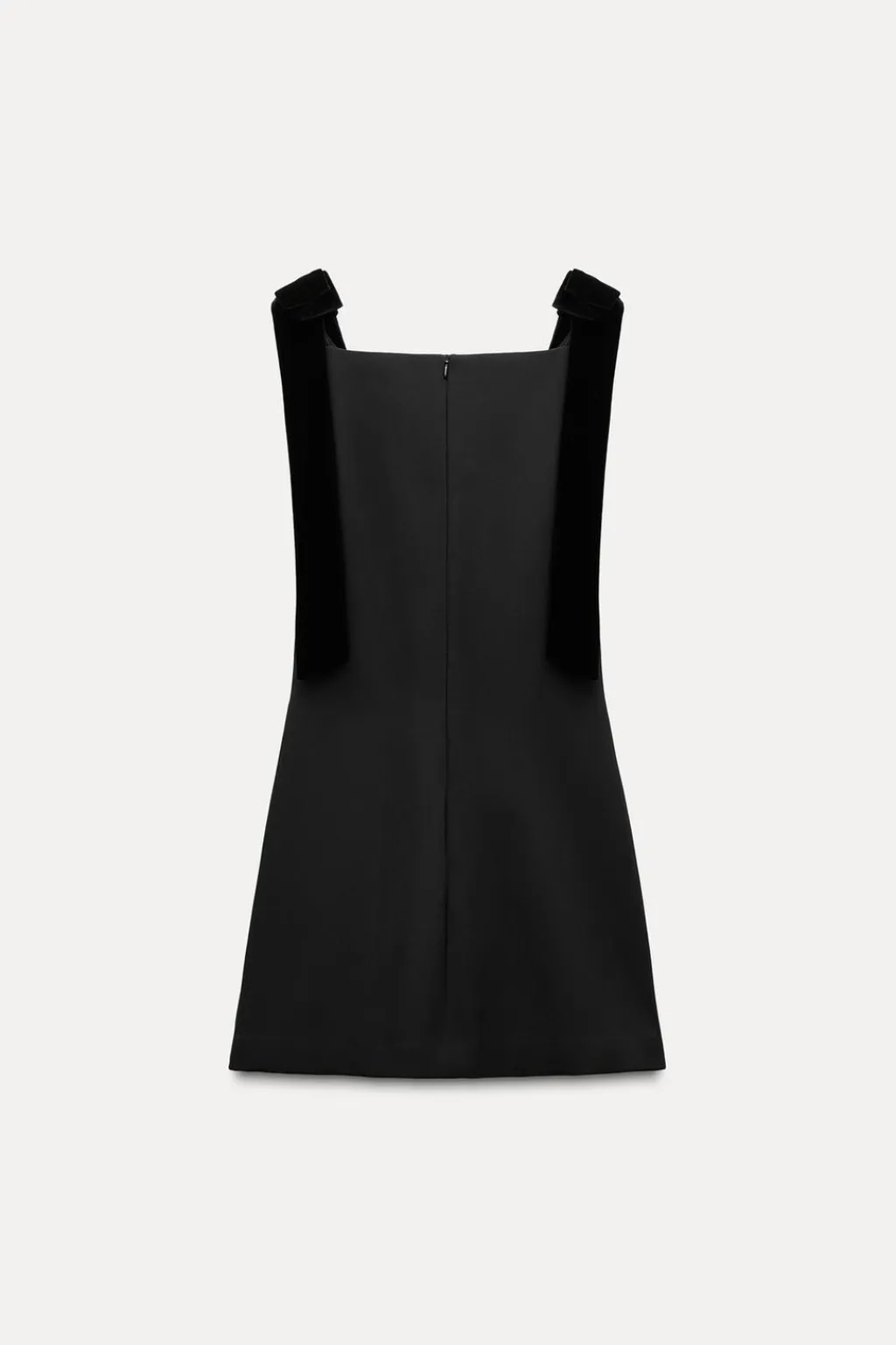 Vestido corto de escote recto y tirantes con lazo en terciopelo combinado. Forro interior. Cierre en espalda con cremallera oculta en costura.