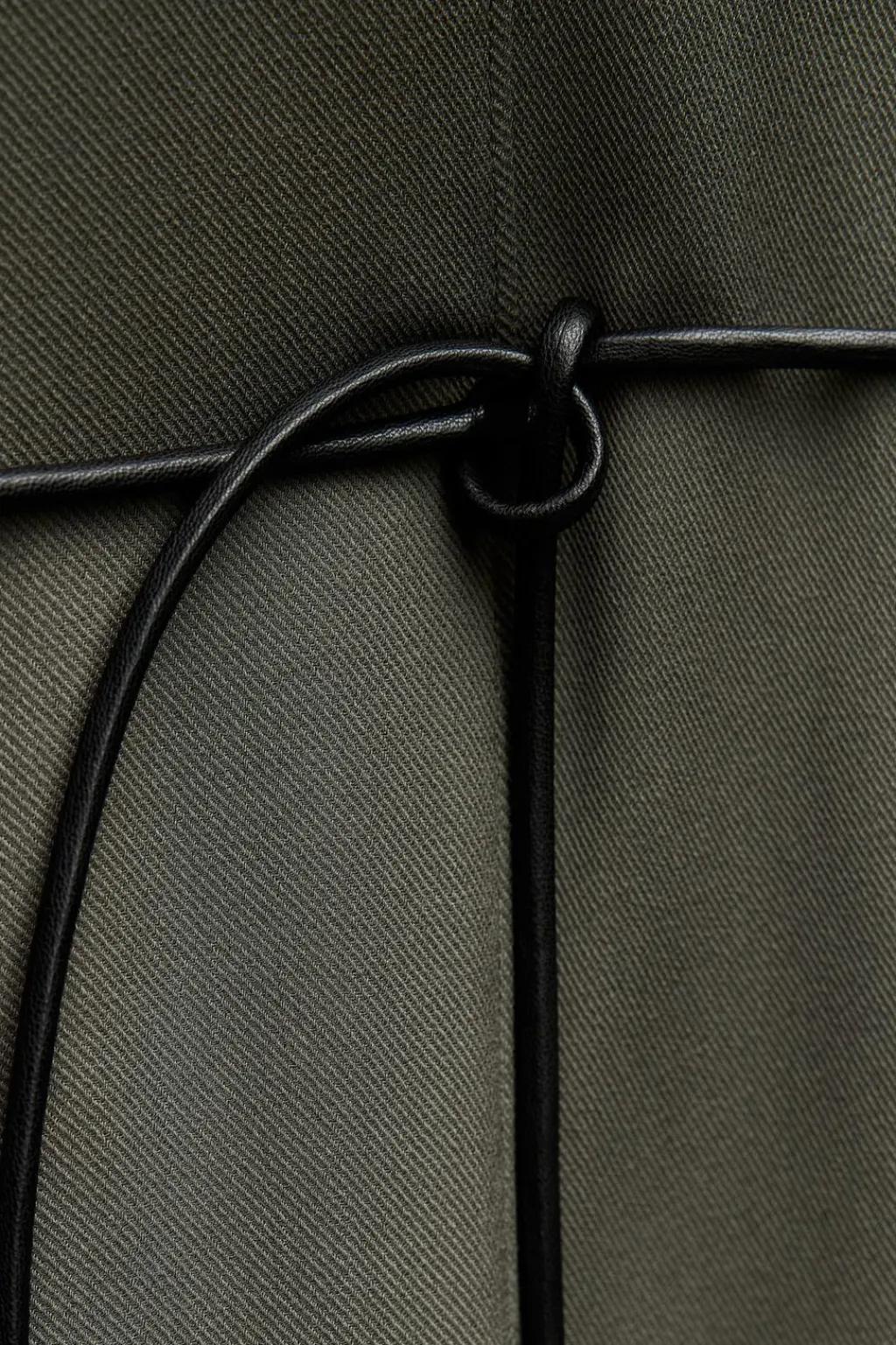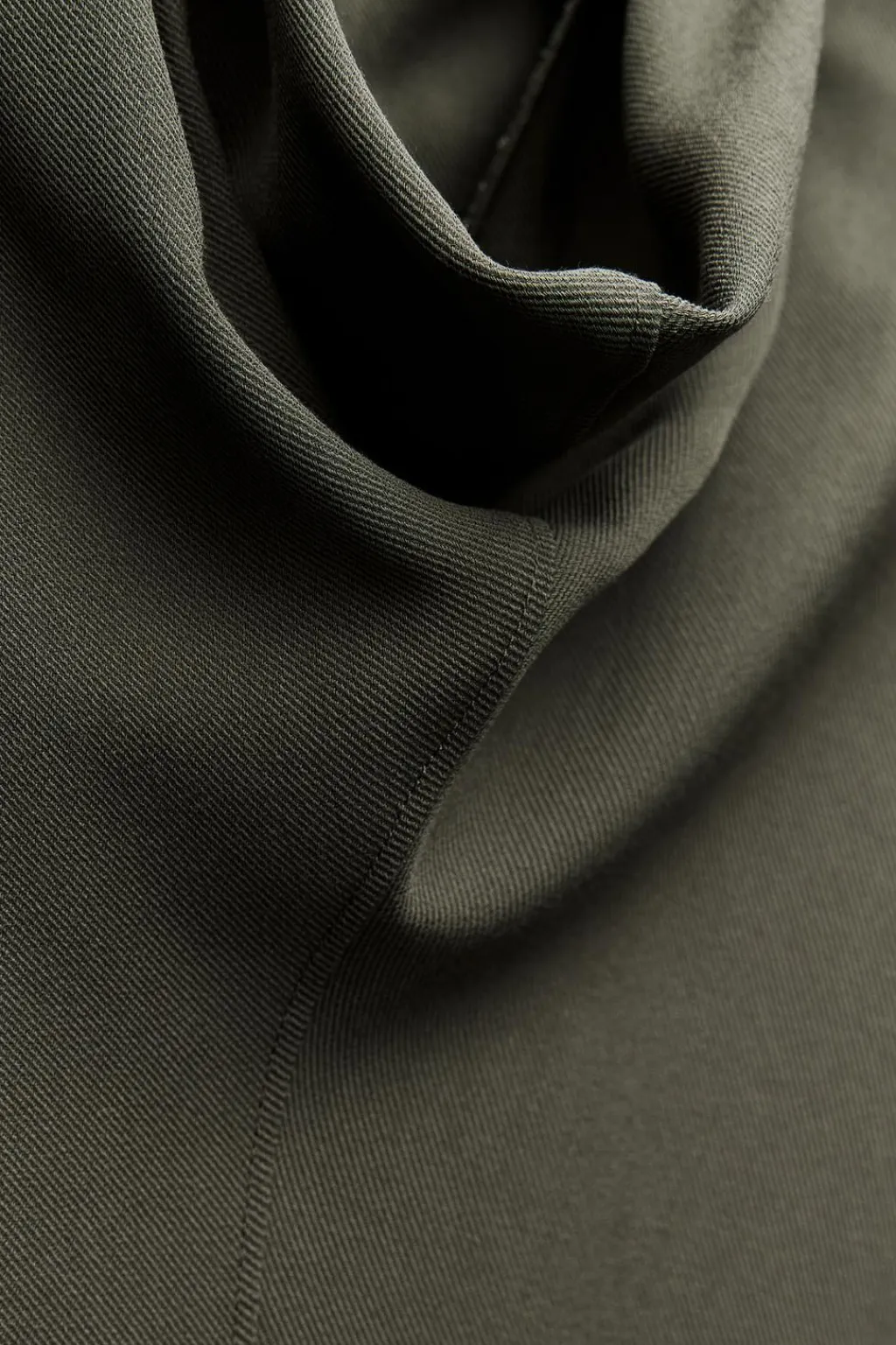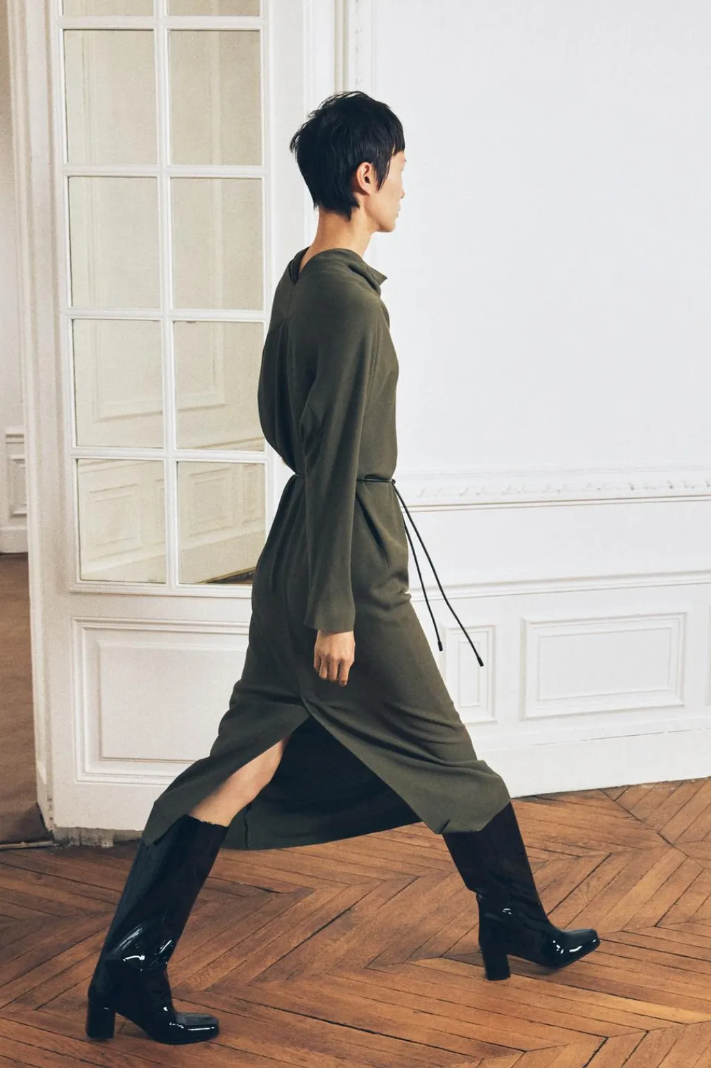 Vestido midi confeccionado en hilatura de viscosa. Cuello fluido drapeado y manga larga. Cinturón ajustable con lazadas. Bajo acabado en abertura.