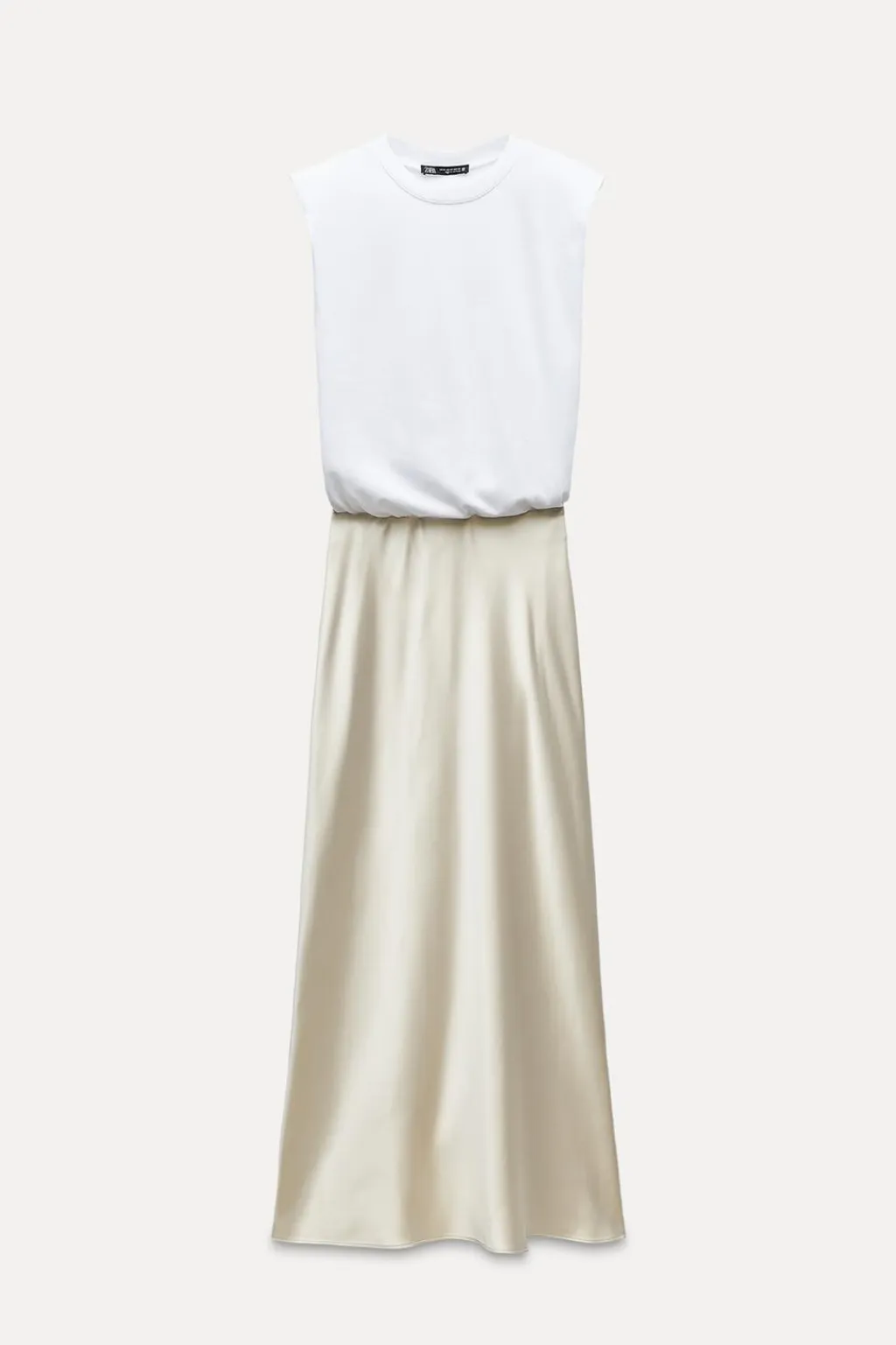 Vestido de cuello redondo y manga sisa con hombros marcados. Detalle de falda con tejido combinado satinado.