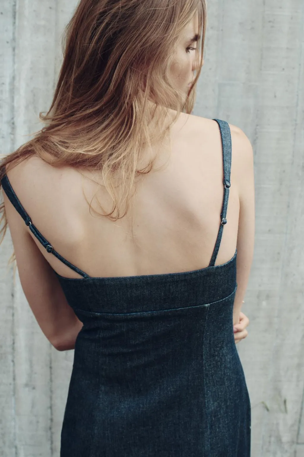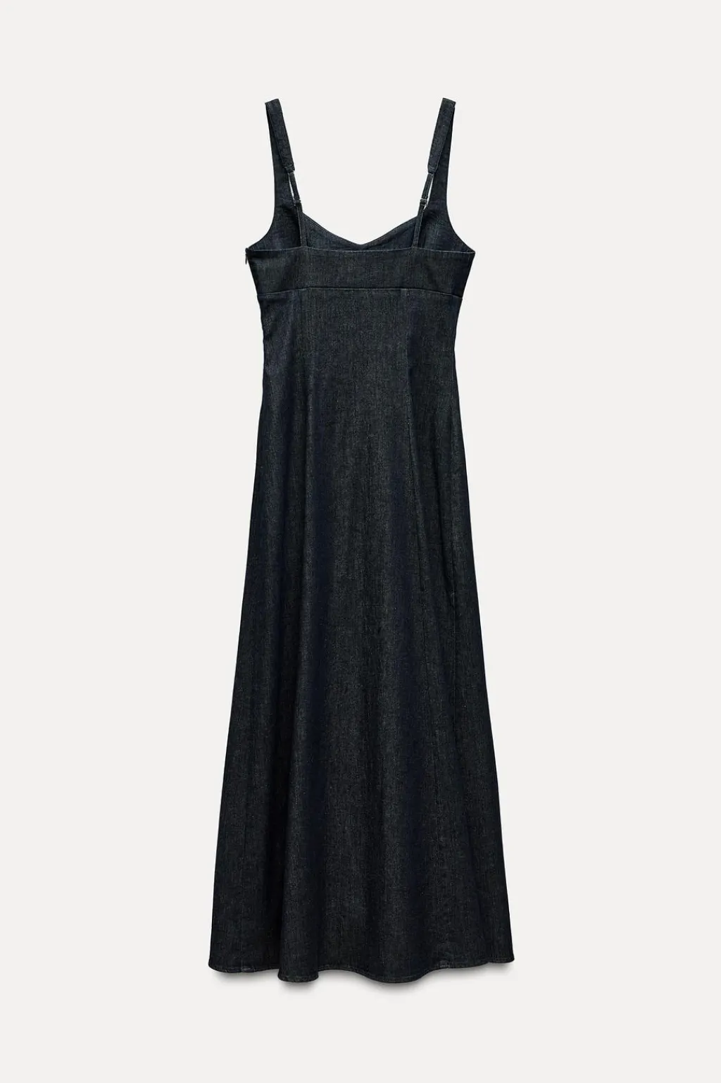 Vestido midi de escote pico y tirantes finos ajustables. Bajo con abertura lateral. Cierre lateral con cremallera oculta en costura.