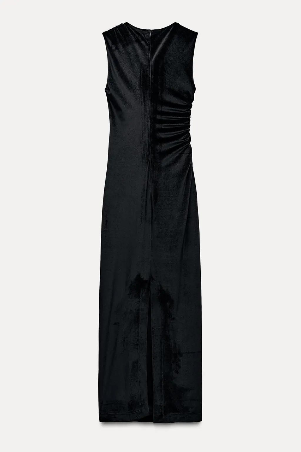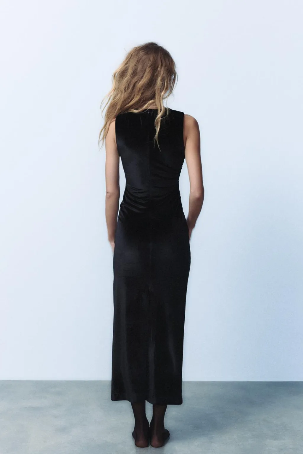 Vestido midi de cuello redondo y manga sisa. Detalle de tejido drapeado. Bajo con abertura en espalda y cierrecon cremallera oculta en costura.