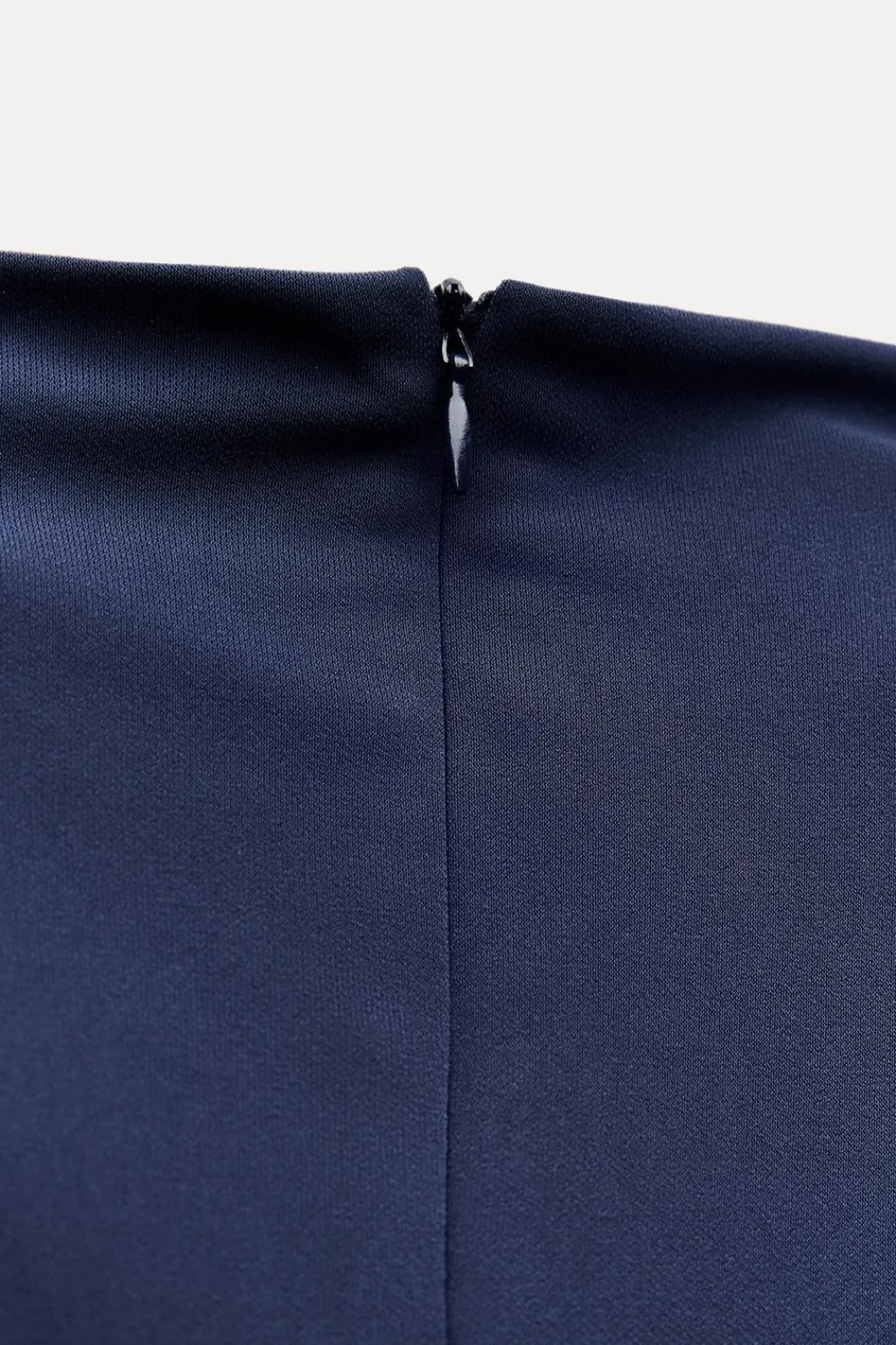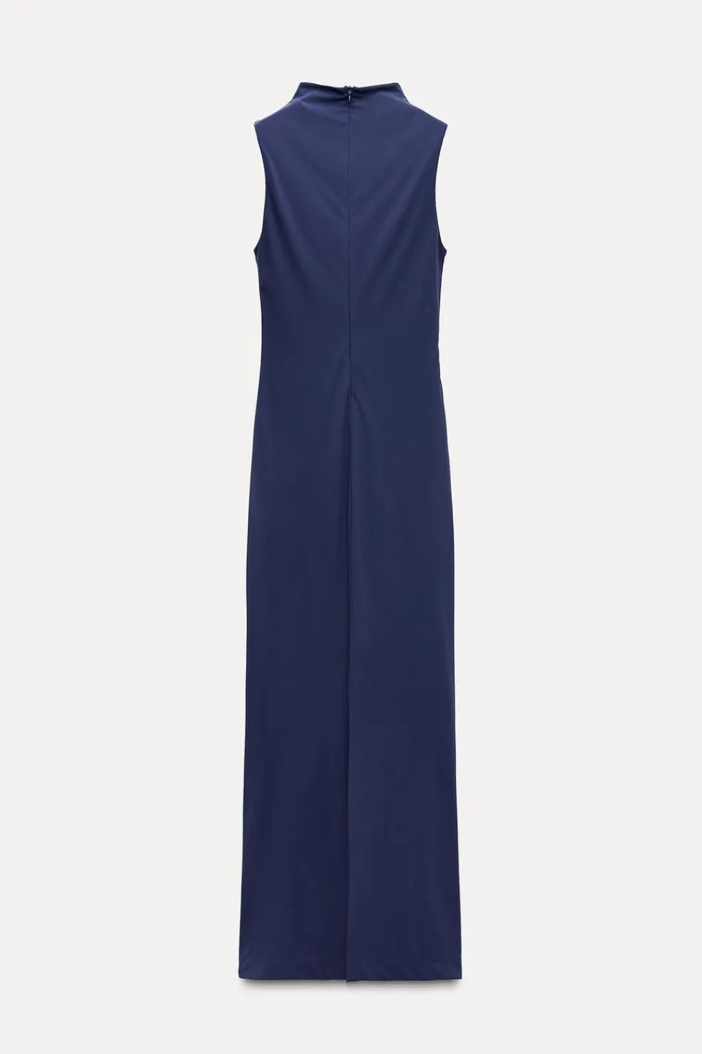 Vestido midi confeccionado en tejido tipo punto. Cuello subido y manga sisa. Detalle de frunce en cintura. Forro interior combinado. Bajo con abertura en espalda y cierre con cremallera oculta en costura.
