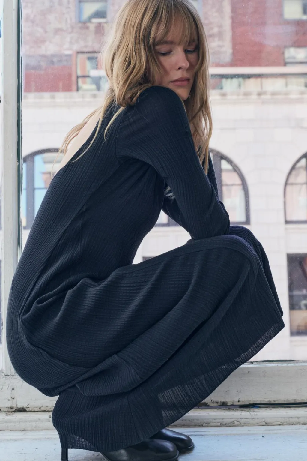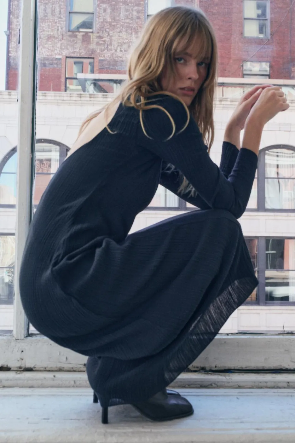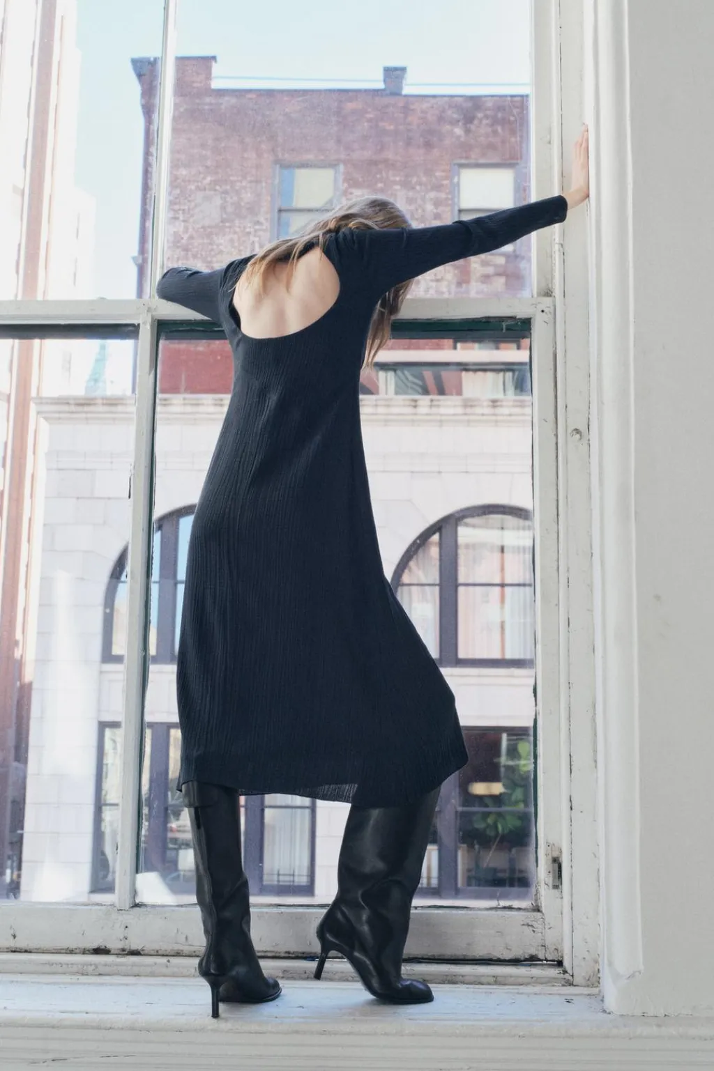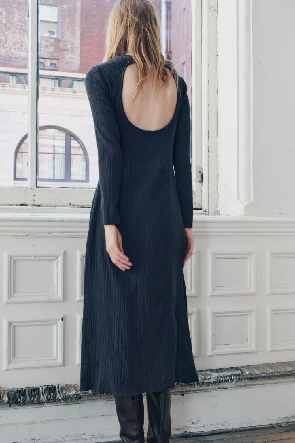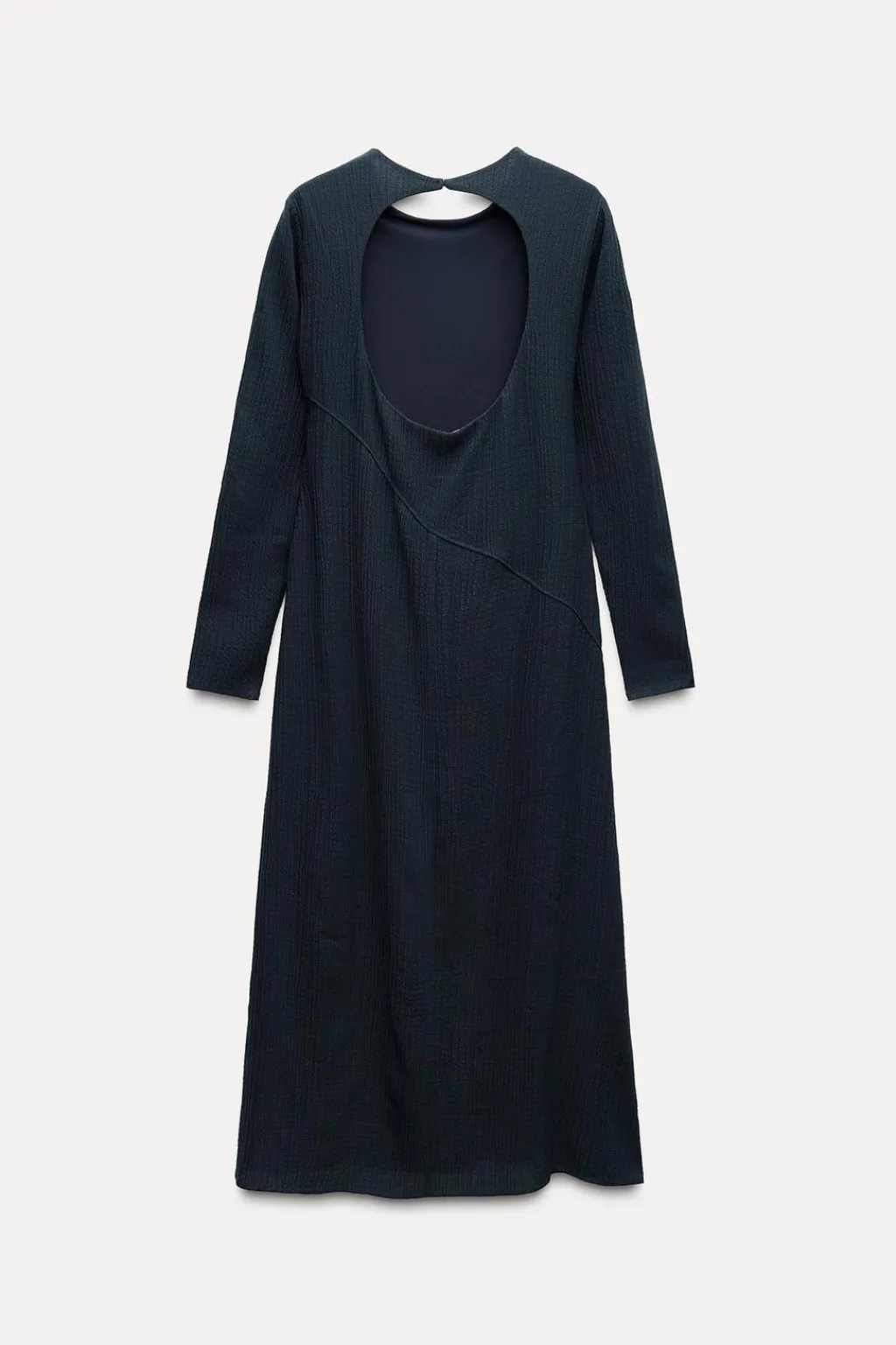 Vestido midi confeccionado en tejido con textura. Cuello redondo y manga larga. Cierre en espalda con abertura y botón.