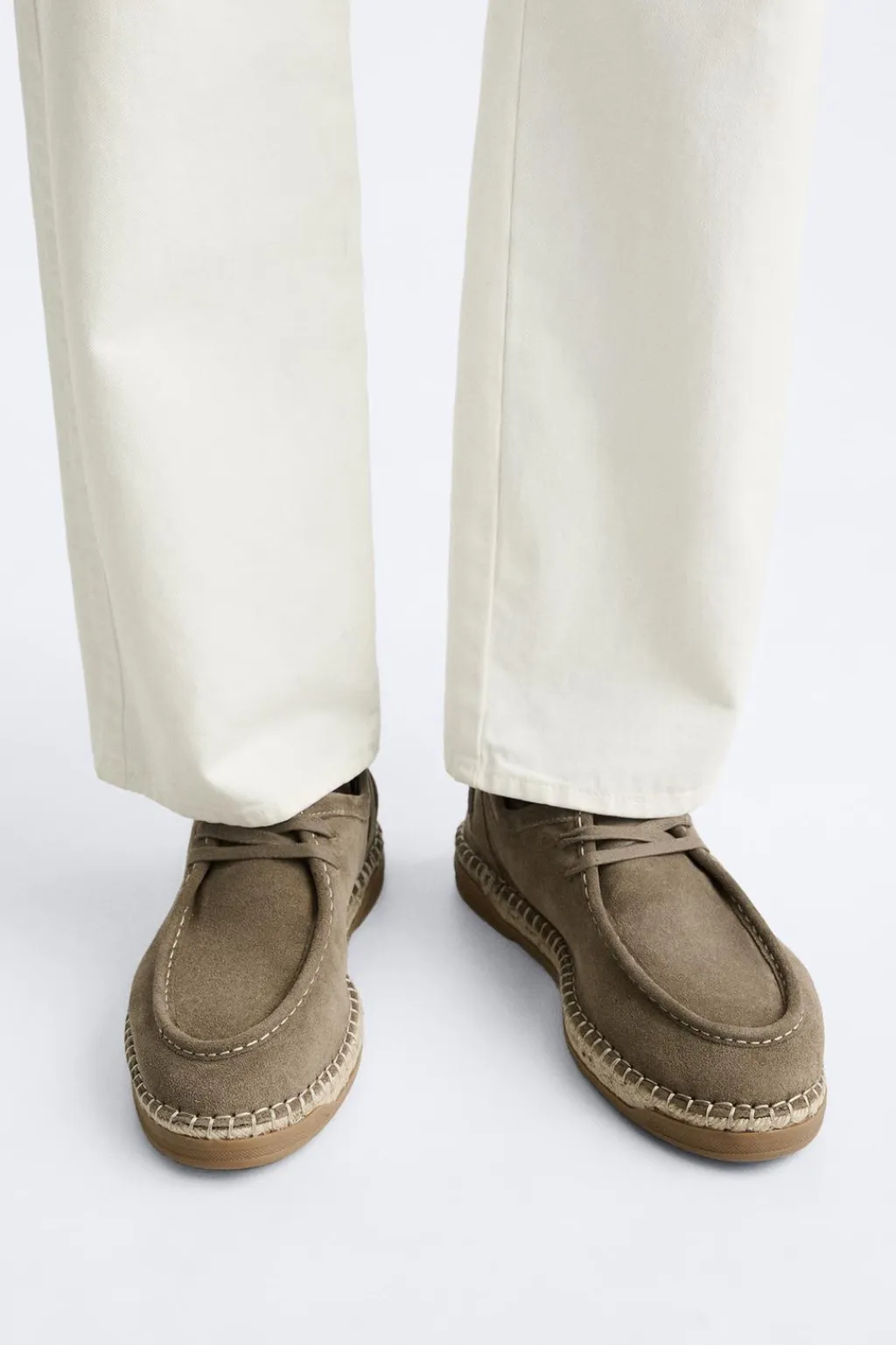 Zapato casual. Parte superior lisa fabricada en piel con acabado serraje. Detalle de bordón con costuras a contraste. Cordonera con dos pasados. Piso recubierto de yute con suela de goma.