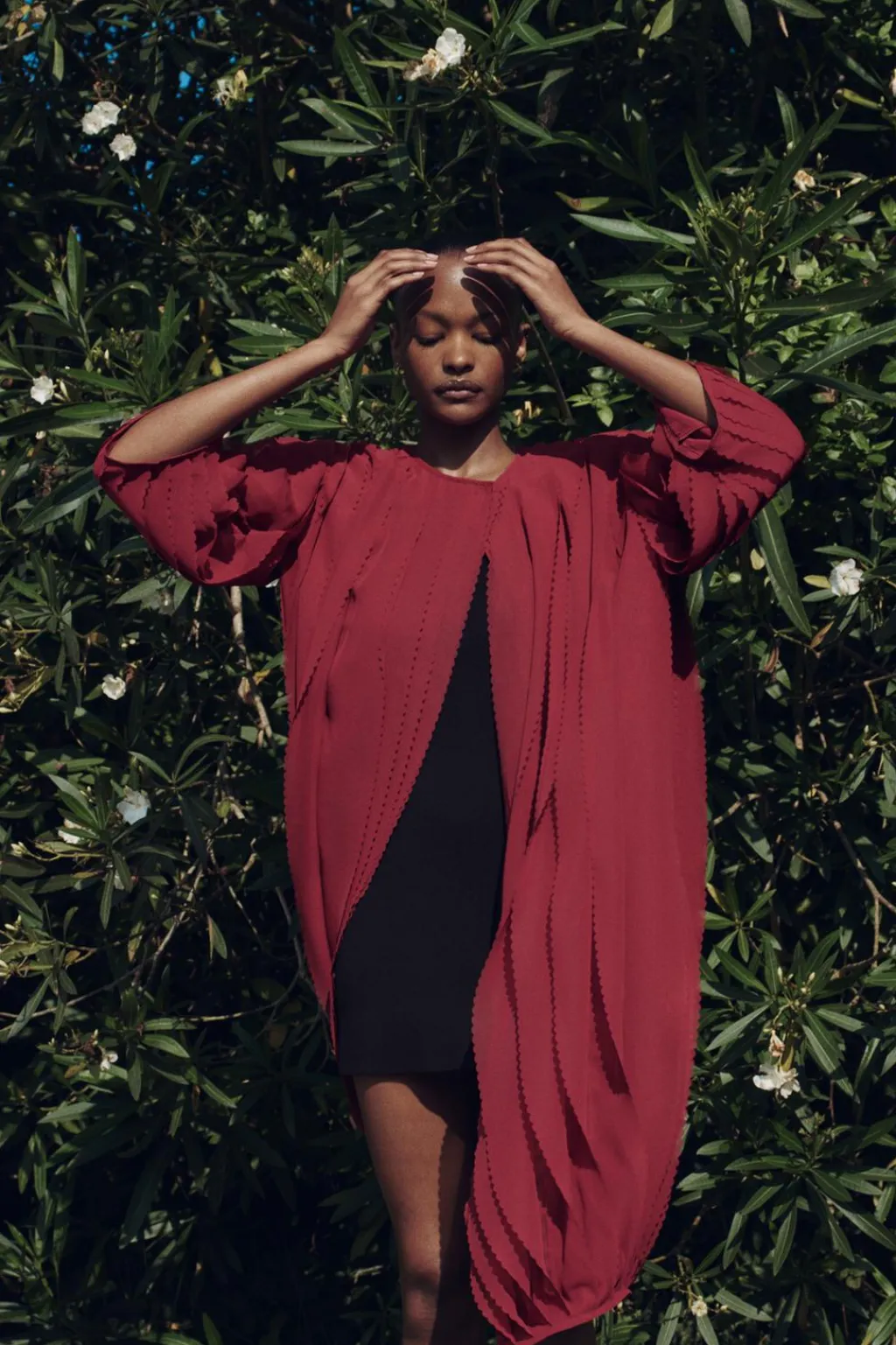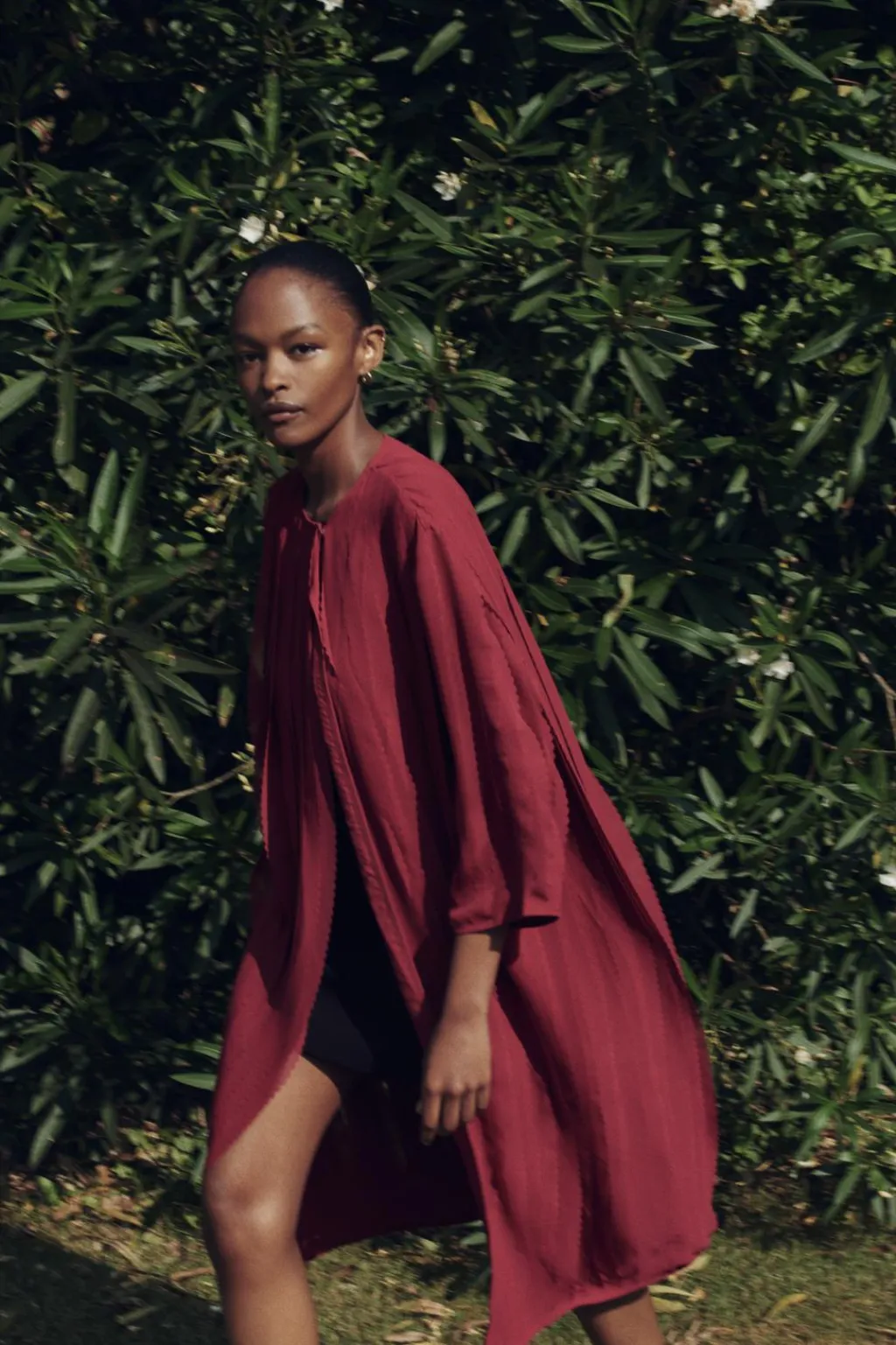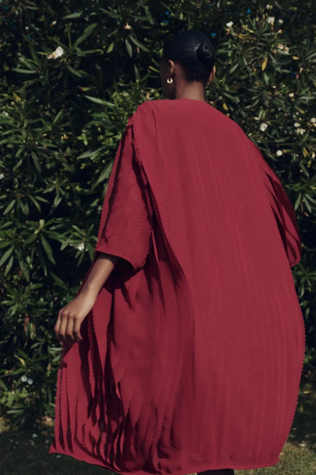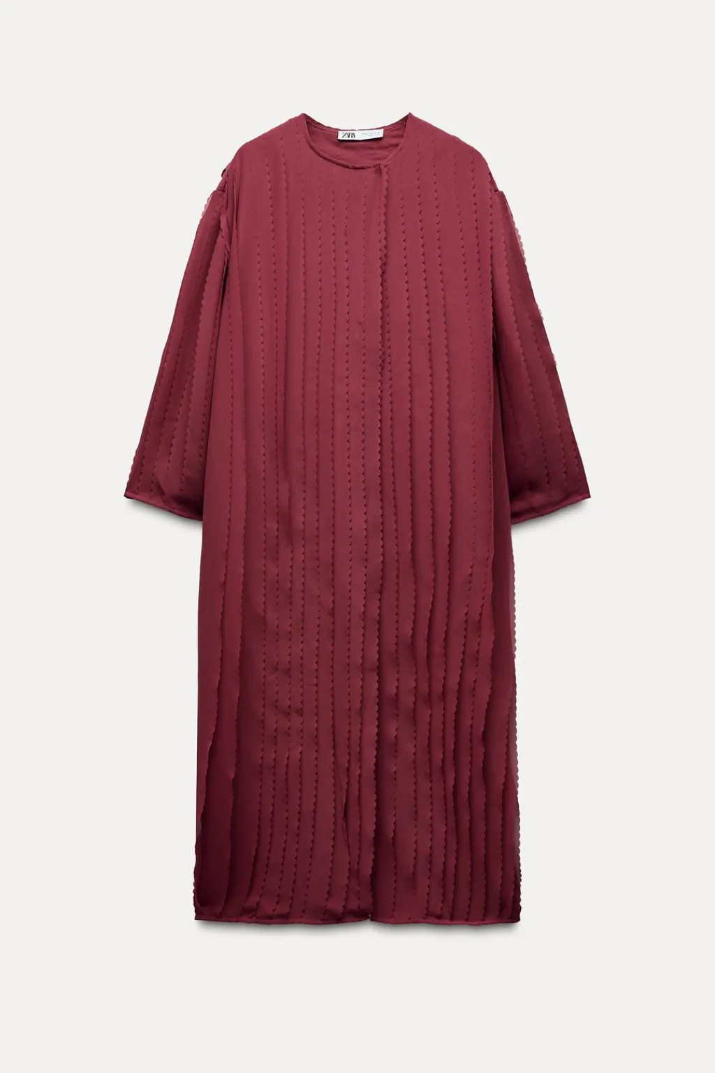 Abrigo de cuello redondo y manga por debajo del codo. Detalle de tejido con volumen. Cierre frontal cruzado con botón a presión.