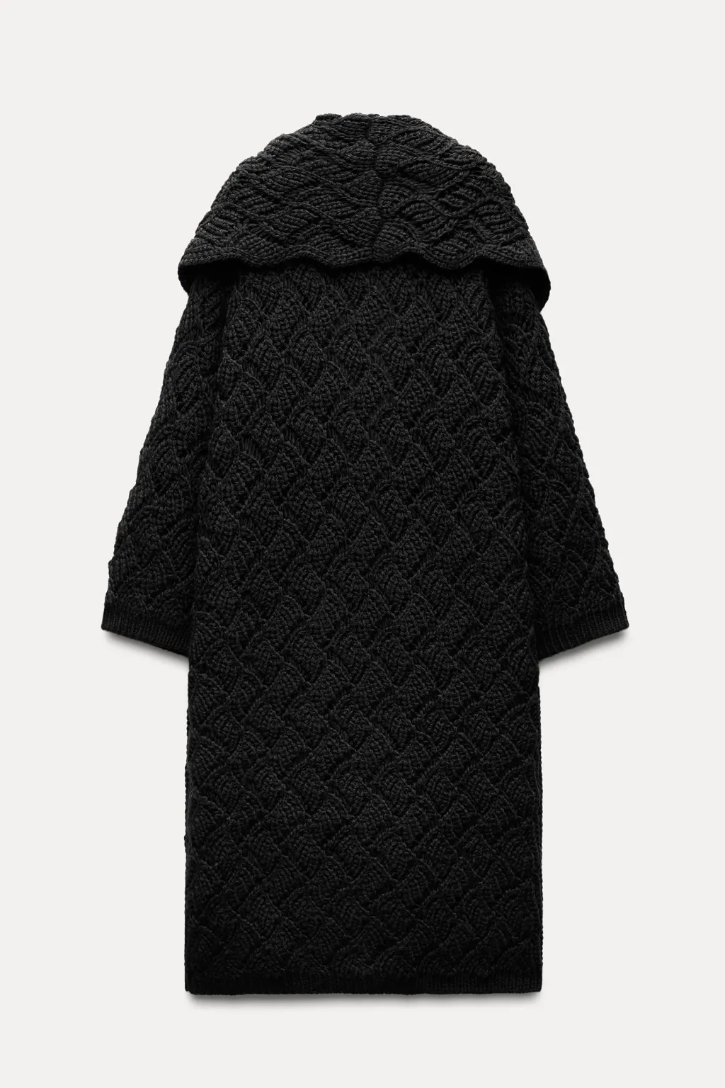 Abrigo abierto de cuello con solapa ancha y manga larga. Detalle de tejido con estructura. Bolsillos delanteros de plastrón.