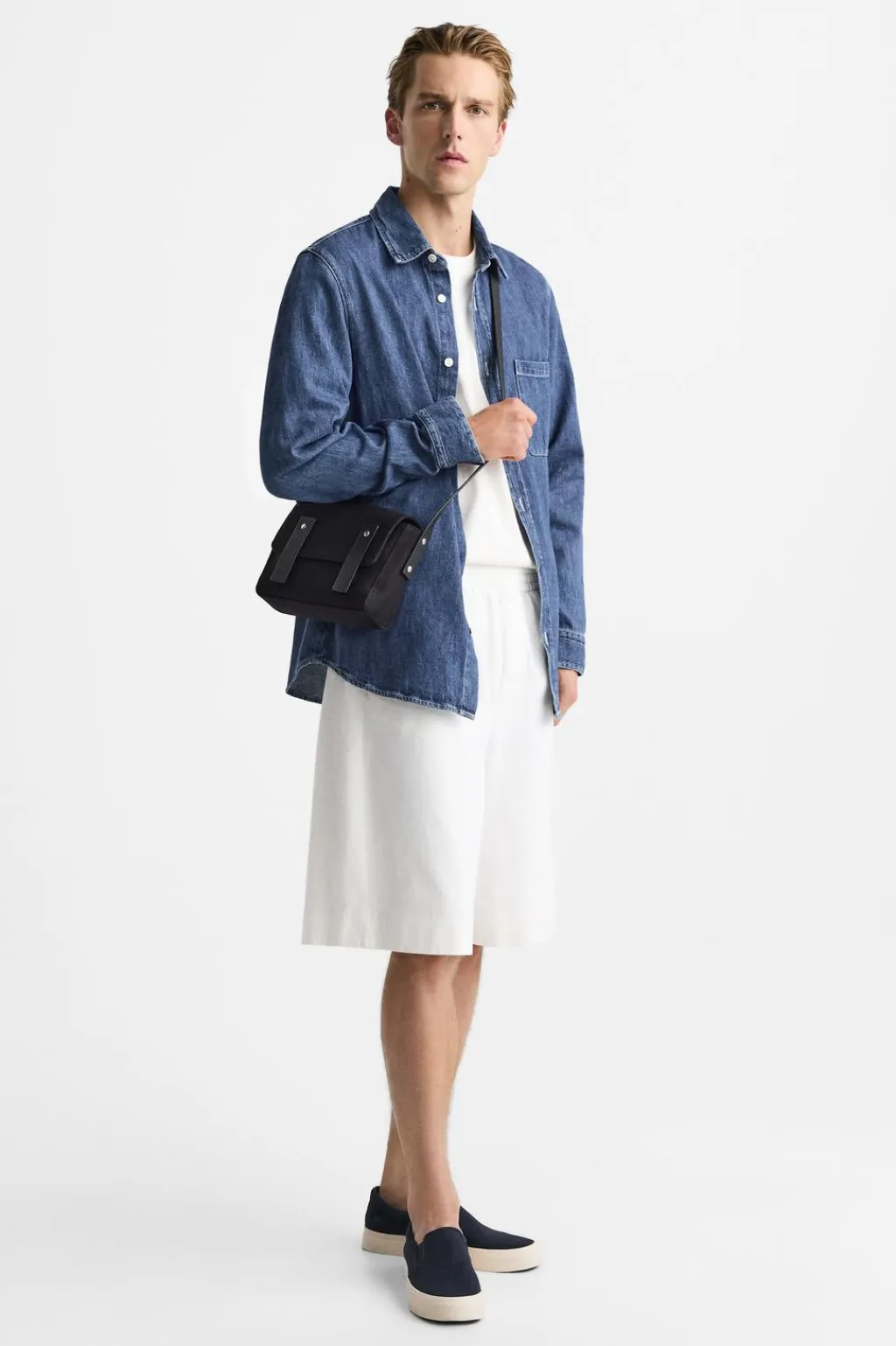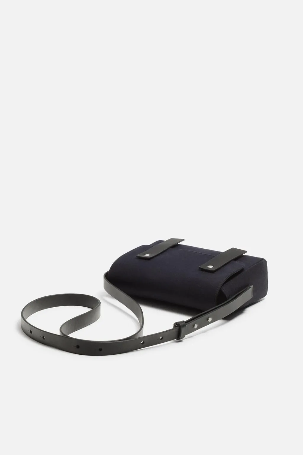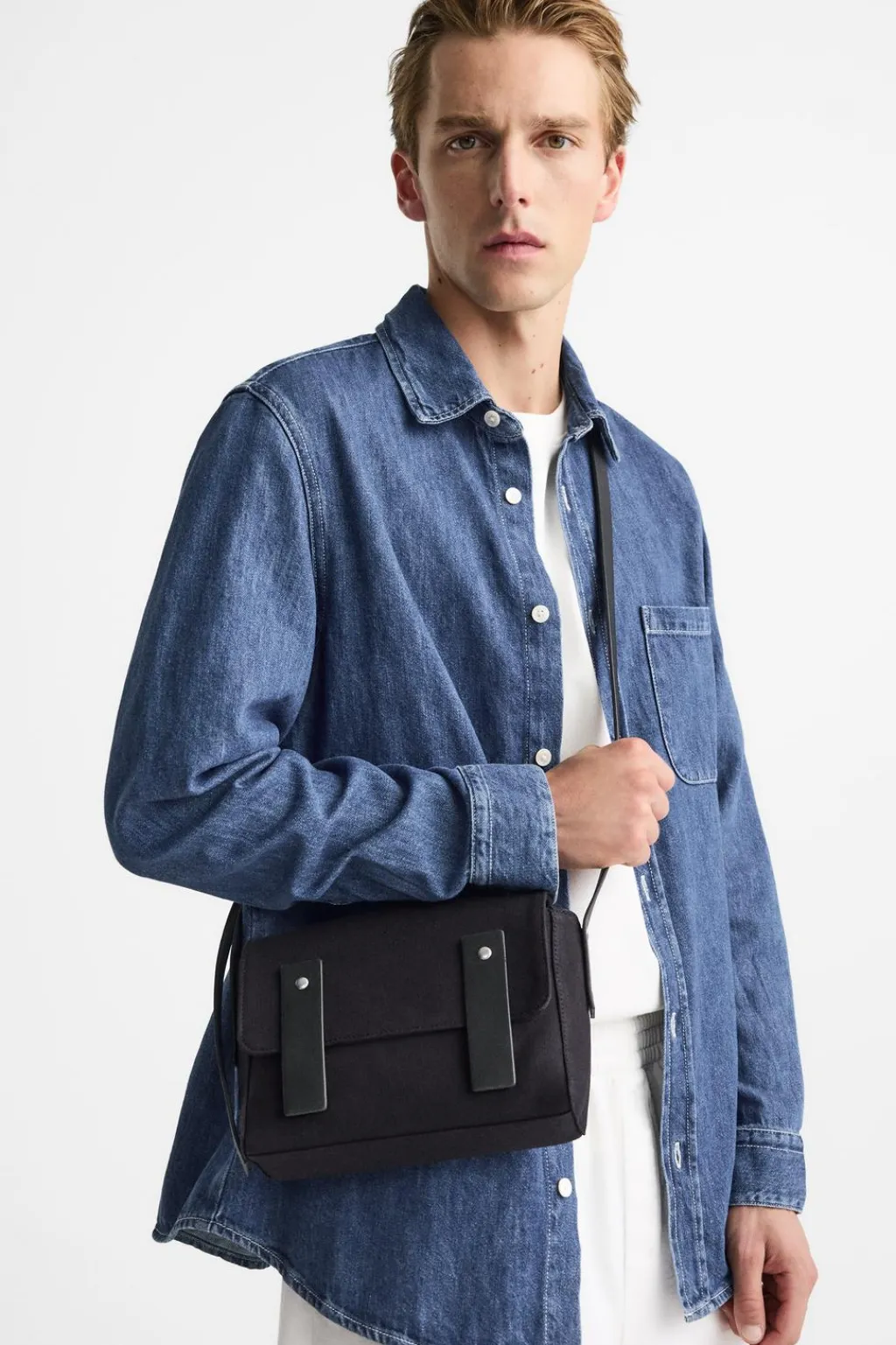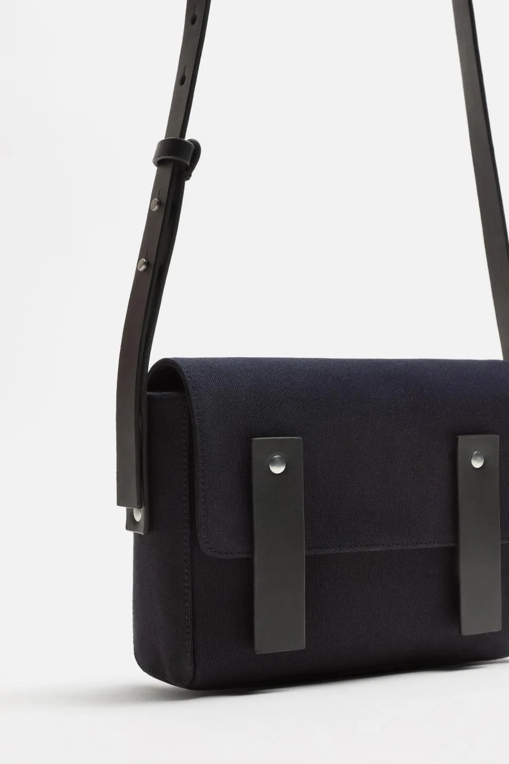 Bolso tipo bandolera. Fabricado en tejido de algodón con detalles en piel. Bolsillo principal con solapa y cierre magnético. El interior cuenta con dos bolsillos pequeños, uno de ellos con cierre mediante cremallera. Asa de hombro ajustable.