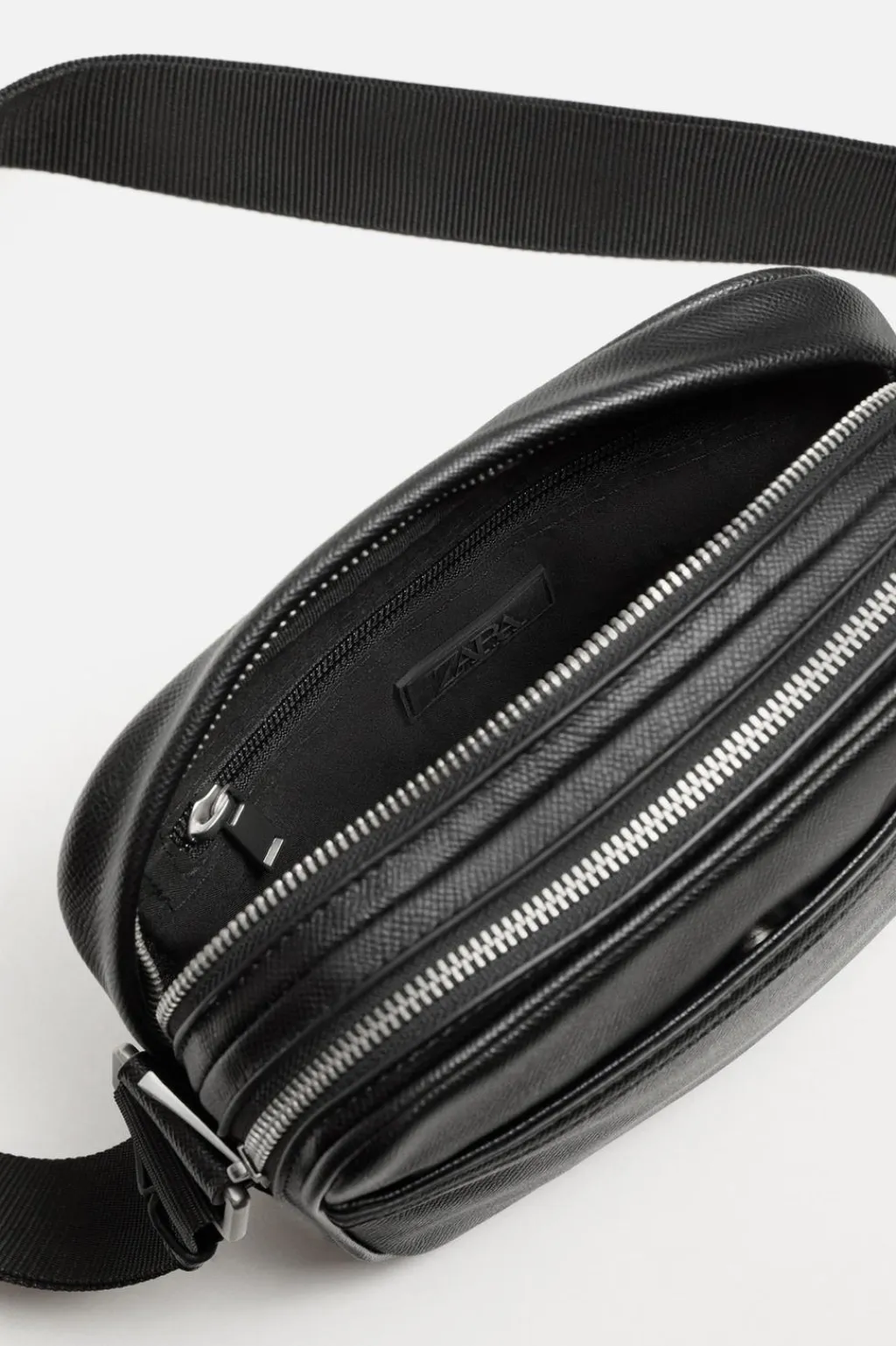 Bandolera grabada. Dos compartimentos principales con cierre de cremallera. Bolsillo interior con cremallera en uno de ellos. Bolsillo plano en ambos frontales con cierre imantado. Asa para hombro ajustable.