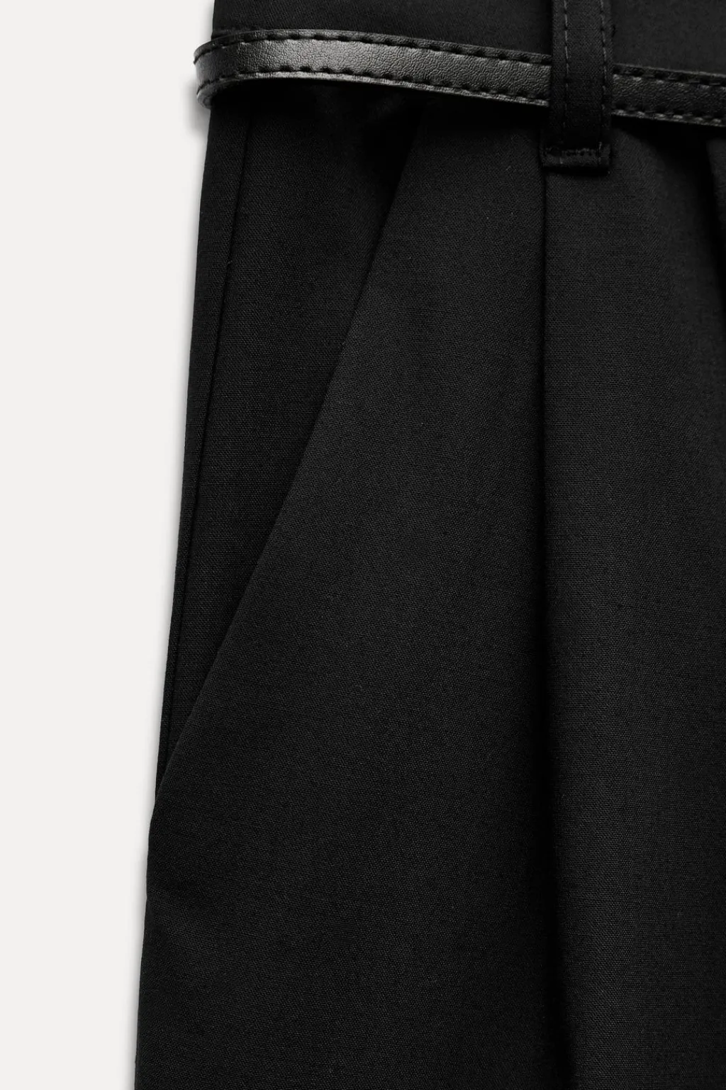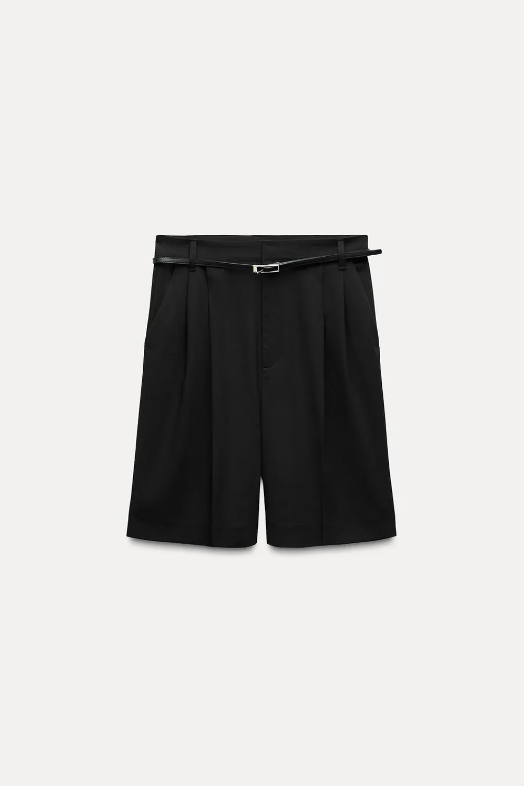 Bermuda de tiro medio con bolsillos laterales y falsos bolsillos de vivo en delantero. Detalle de pliegues en delantero. Cinturón combinado a contraste. Cierre frontal con cremallera , botón interior y gancho metálico.