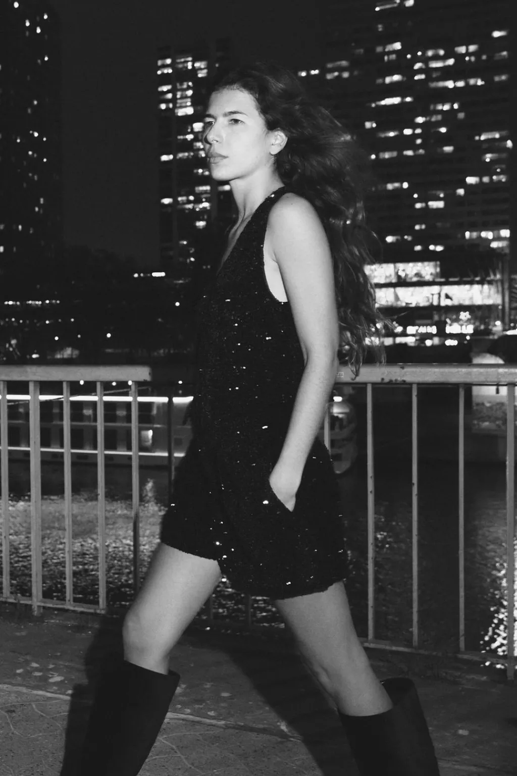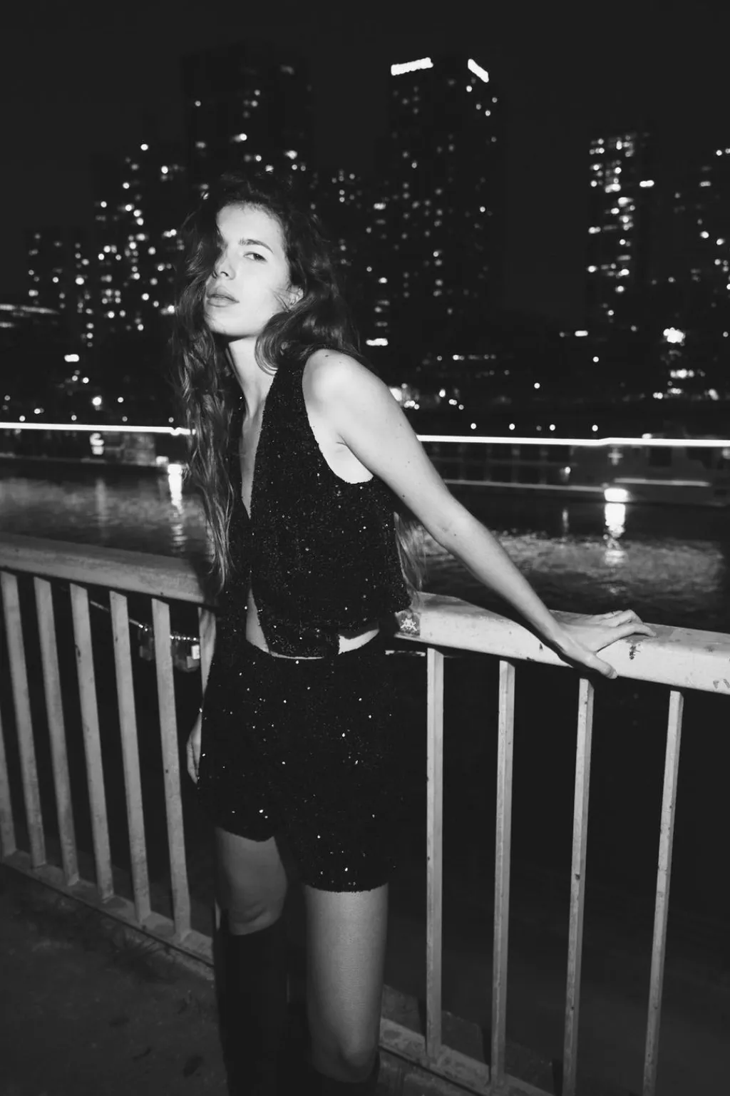 Bermuda de tiro alto con pinzas delanteras. Bolsillos laterales ocultos en costura. Forro interior. Cierre frontal con cremallera, botón interior y gancho. Aplicación de lentejuelas.