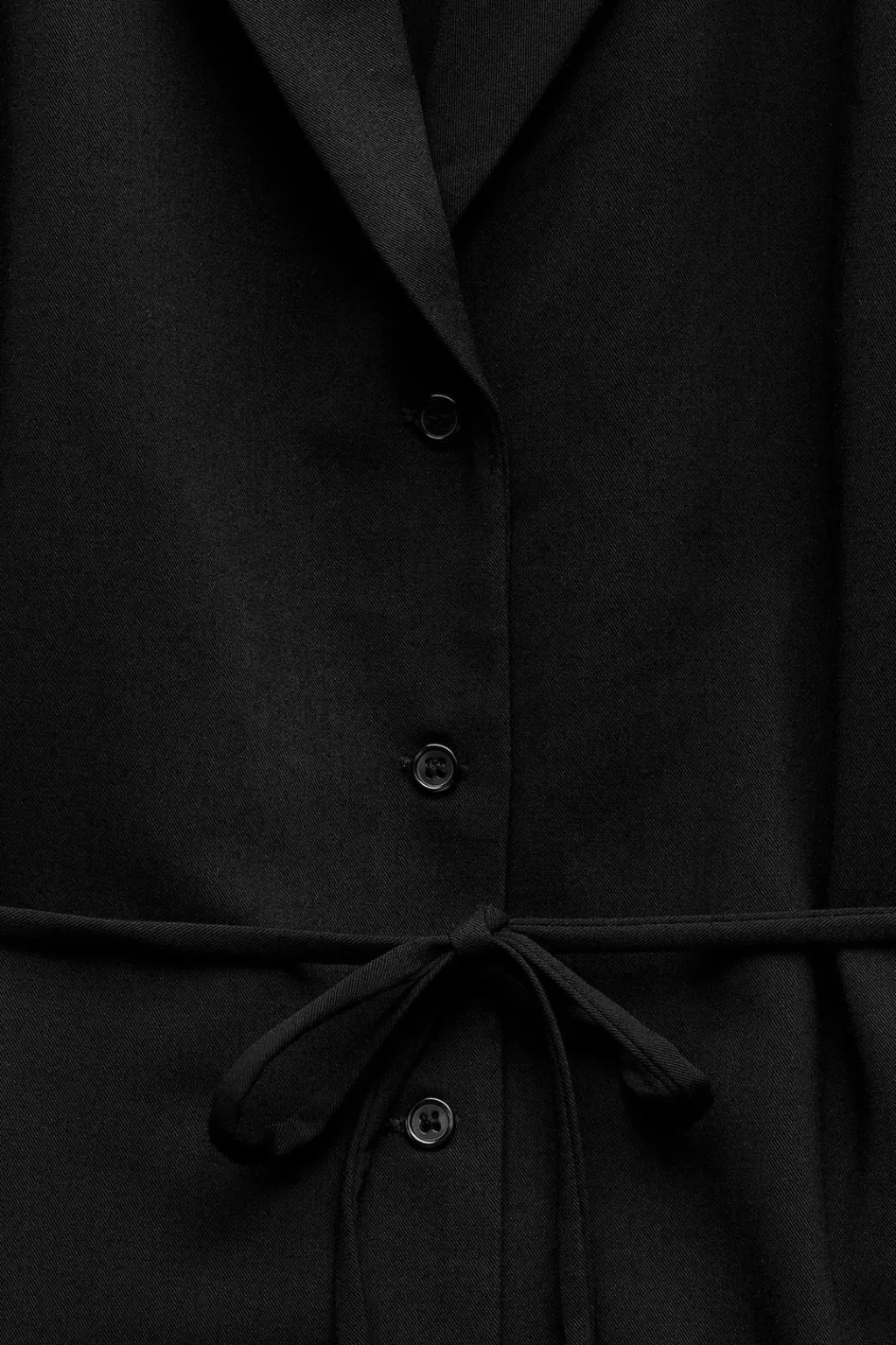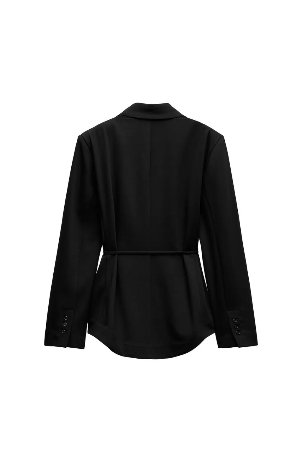 Blazer de cuello solapa y escote pico. Manga larga con hombreras. Cinturón fino con lazada. Cierre frontal con botones.
