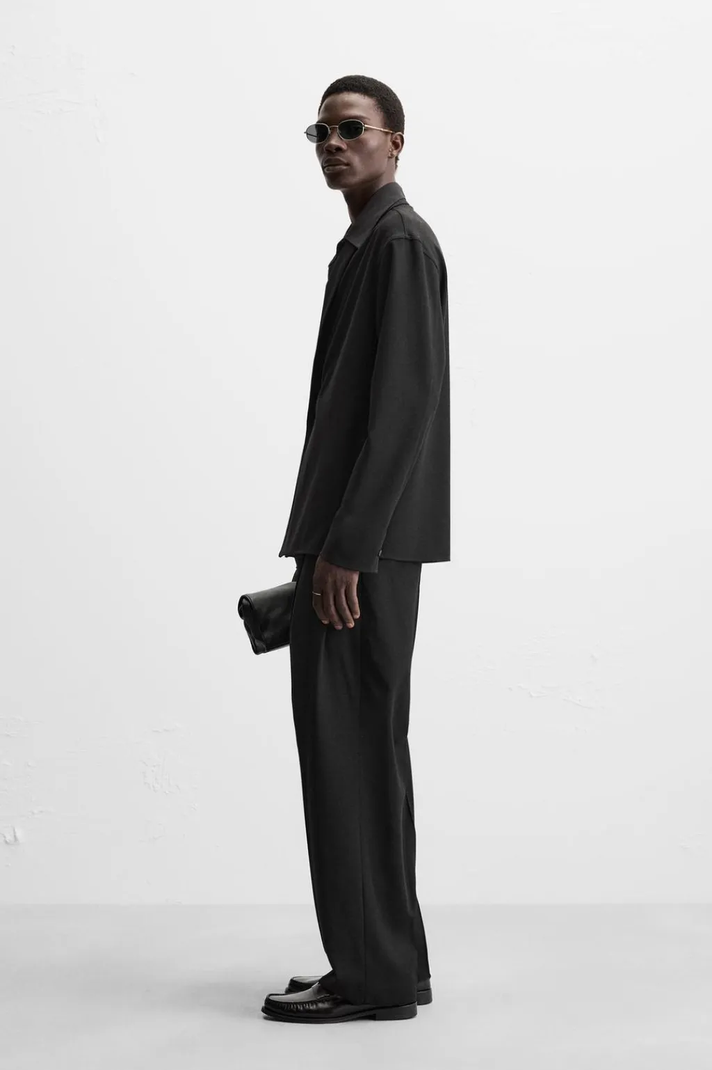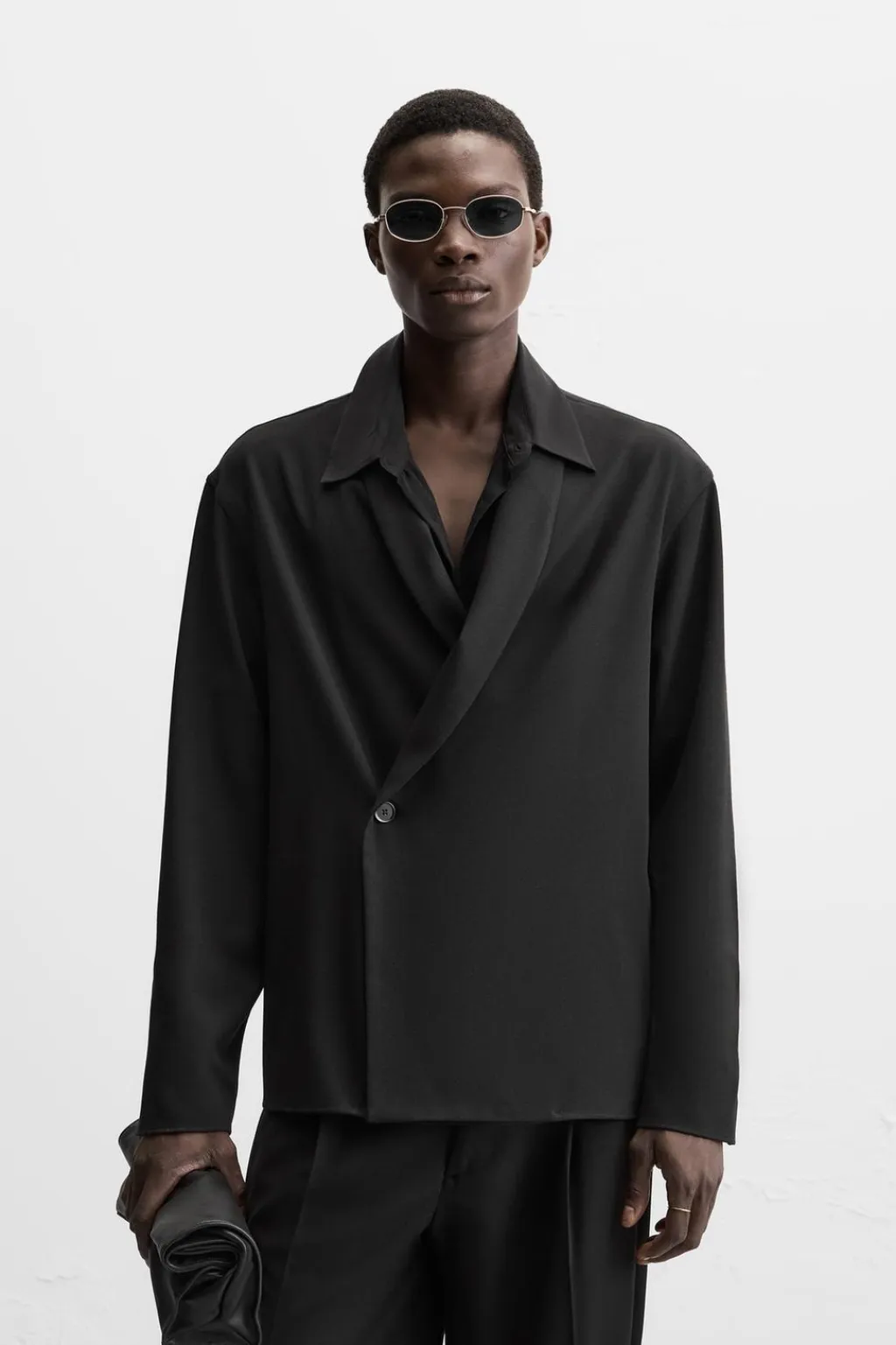 Blazer relaxed fit. Cuello solapa y manga larga acabada en puño con botón. Cierre frontal de botonadura cruzada oculta.