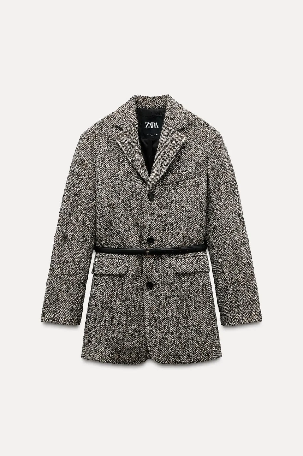 Blazer oversize confeccionada en hilatura con lana 20%. Cuello solapa de muescas y manga larga acabada en abertura y botones. Bolsillos con solapa en delantero y de vivo en pecho. Cinturón ajustable con hebilla metálica. Forro interior a tono. Cierre frontal con botones.