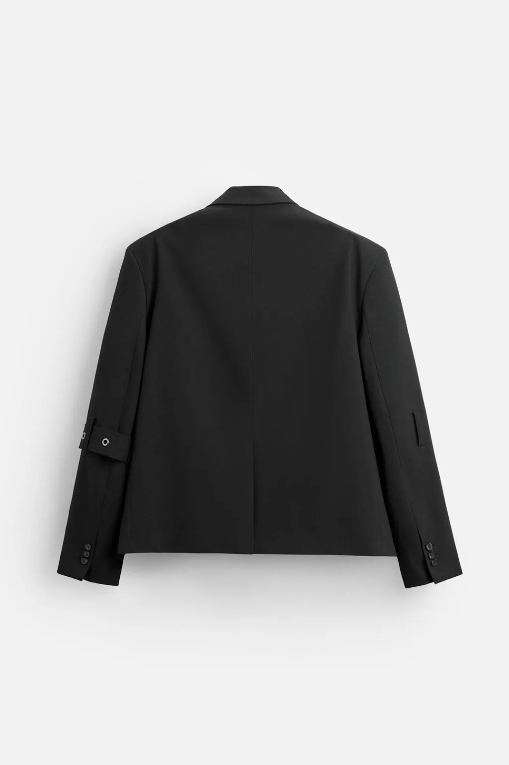 Blazer oversize fit. Cuello con solapas de muesca y aplicación de cremallera. Manga larga acabada en puño con botón y detalle de cinta en el mismo tejido. Bolsillos de solapa en cadera y detalle de bolsillo interior. Bajo con abertura en centro espalda. Cierre frontal de botonadura.