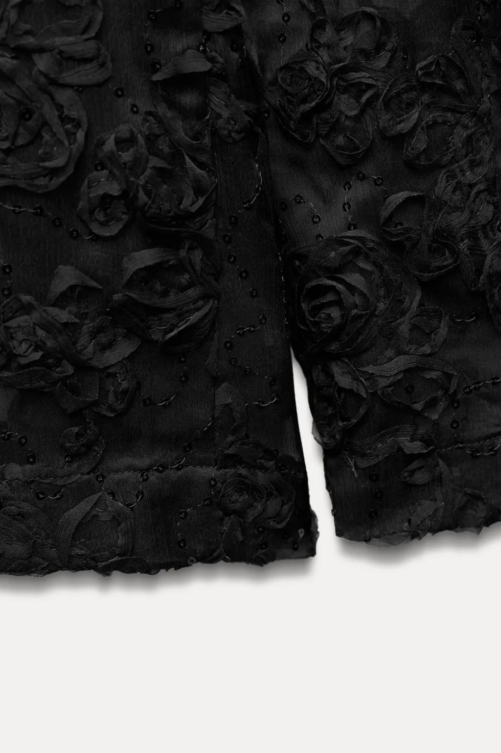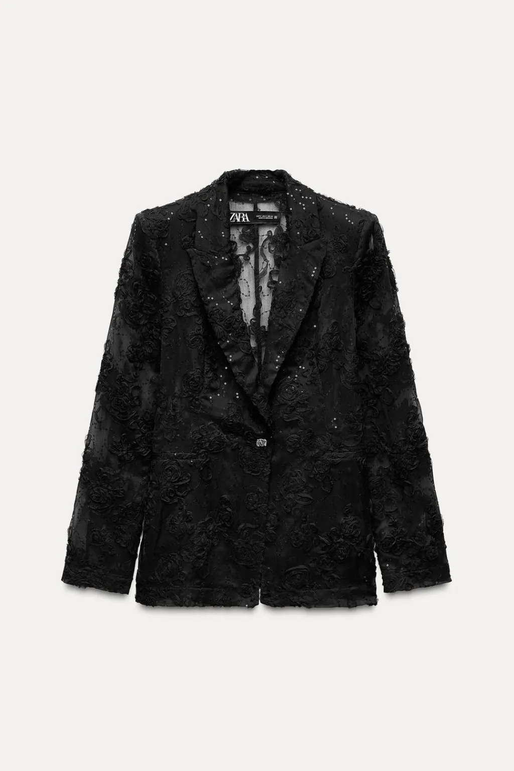 Blazer de cuello solapa y manga larga con hombreras. Detalle de tejido en estructura en forma de flor y lentejuelas. Bolsillos delanteros de vivo. Cierre frontal con botón metálico.