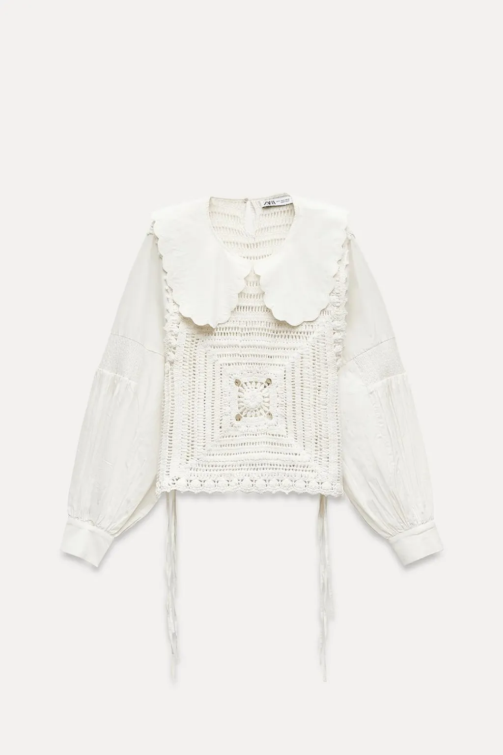 Blusa de cuello bobo y manga larga con tejido combinado. Detalle de cordones laterales. Cierre en espalda con abertura y botón.