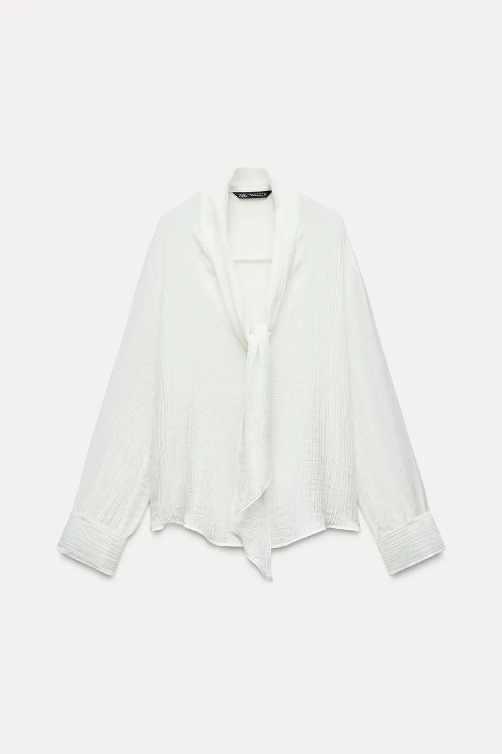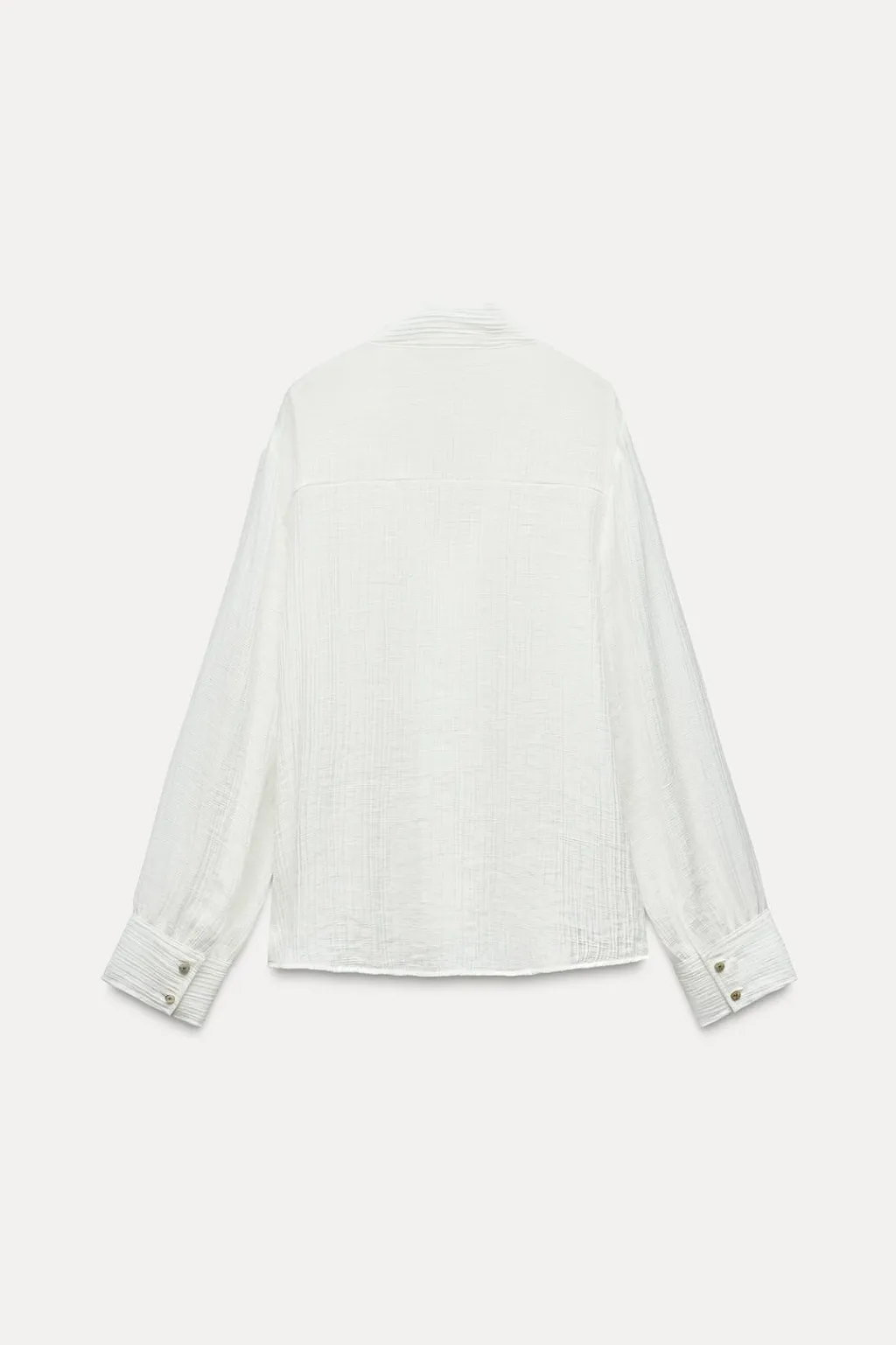 Blusa de escote pico con solapa y lazo. Manga larga. Detalle de tejido efecto arrugado. Cierre frontal con botones.