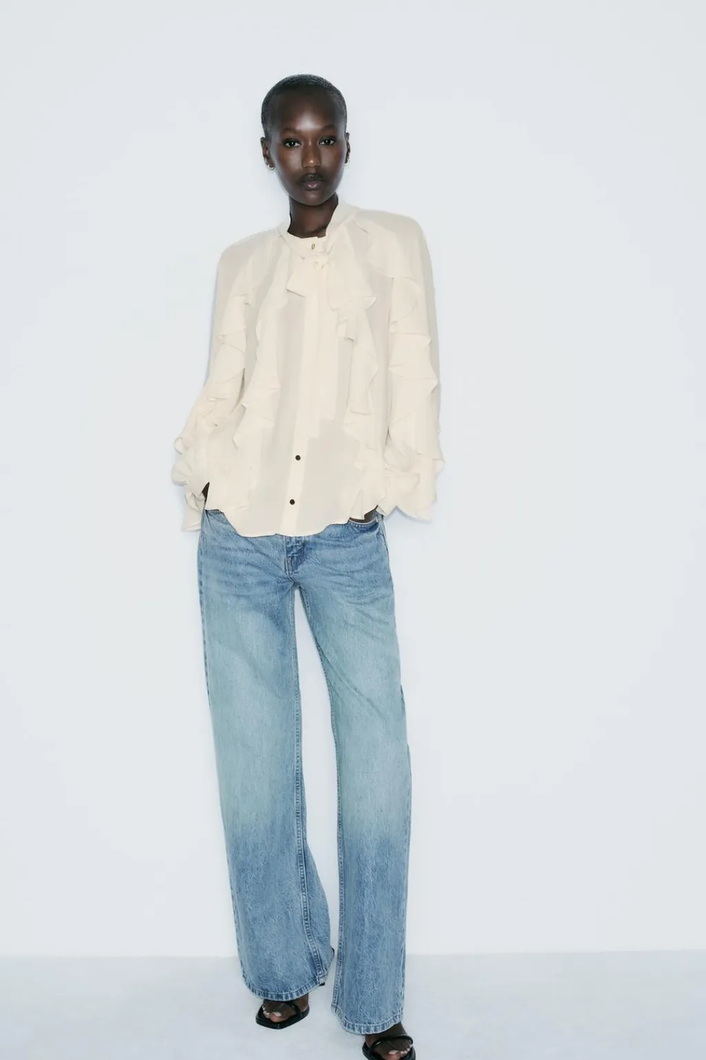 Blusa de cuello subido con lazo y manga larga. Acabados con volantes. Cierre frontal con botones.