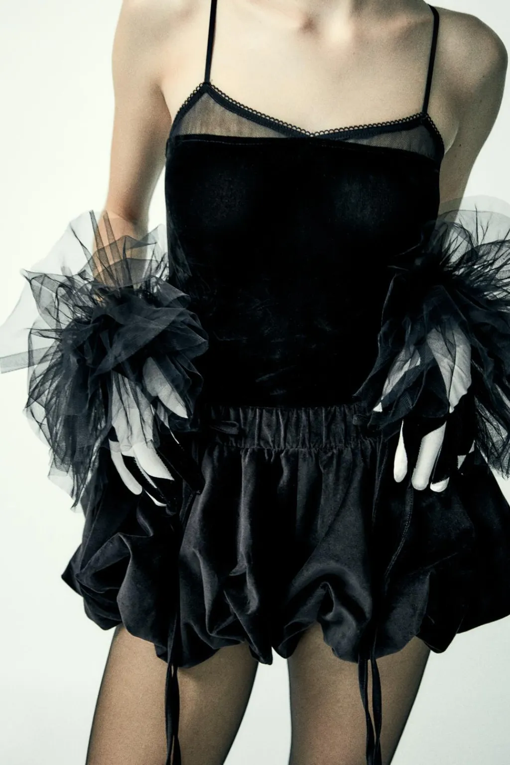 Body entallado confeccionado en terciopelo. Escote pico combinado a tono en encaje. Tirantes finos ajustables. Cierre en bajo con botones a presión.