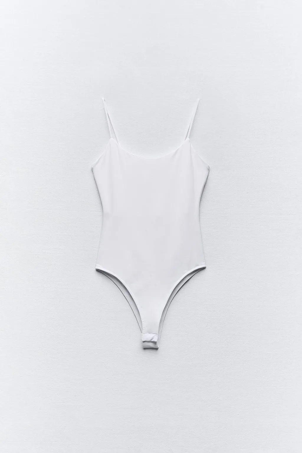Body confeccionado en hilatura con mezcla de poliamida. Escote redondo y tirantes finos. Cierre en bajo con botones a presión.