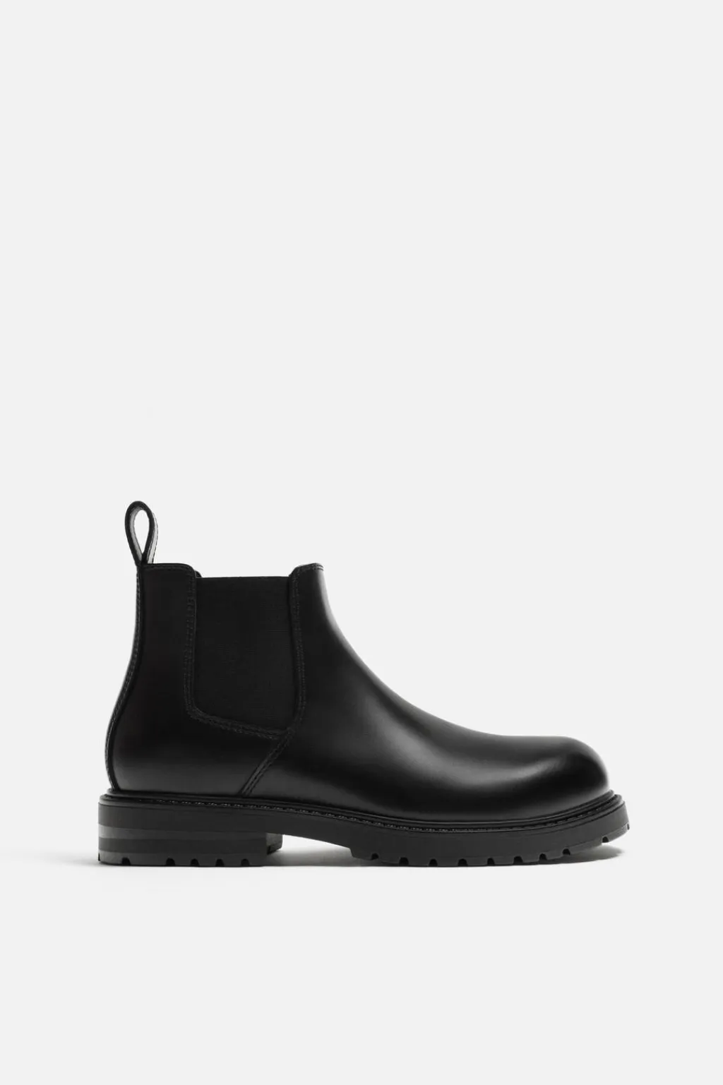 Bota tipo chelsea. Parte superior lisa. Cuenta con dos piezas elásticas laterales y tirador trasero para facilitar el calce. Horma redonda. Suela con volumen y piso track.