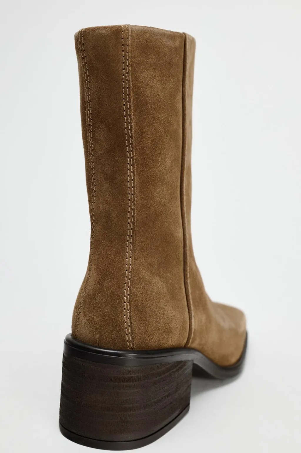 Zapato tipo botín en serraje. Detalle de pespunte en el corte. Tacón ancho. Cierre mediante cremallera lateral. Acabado en punta cuadrada.