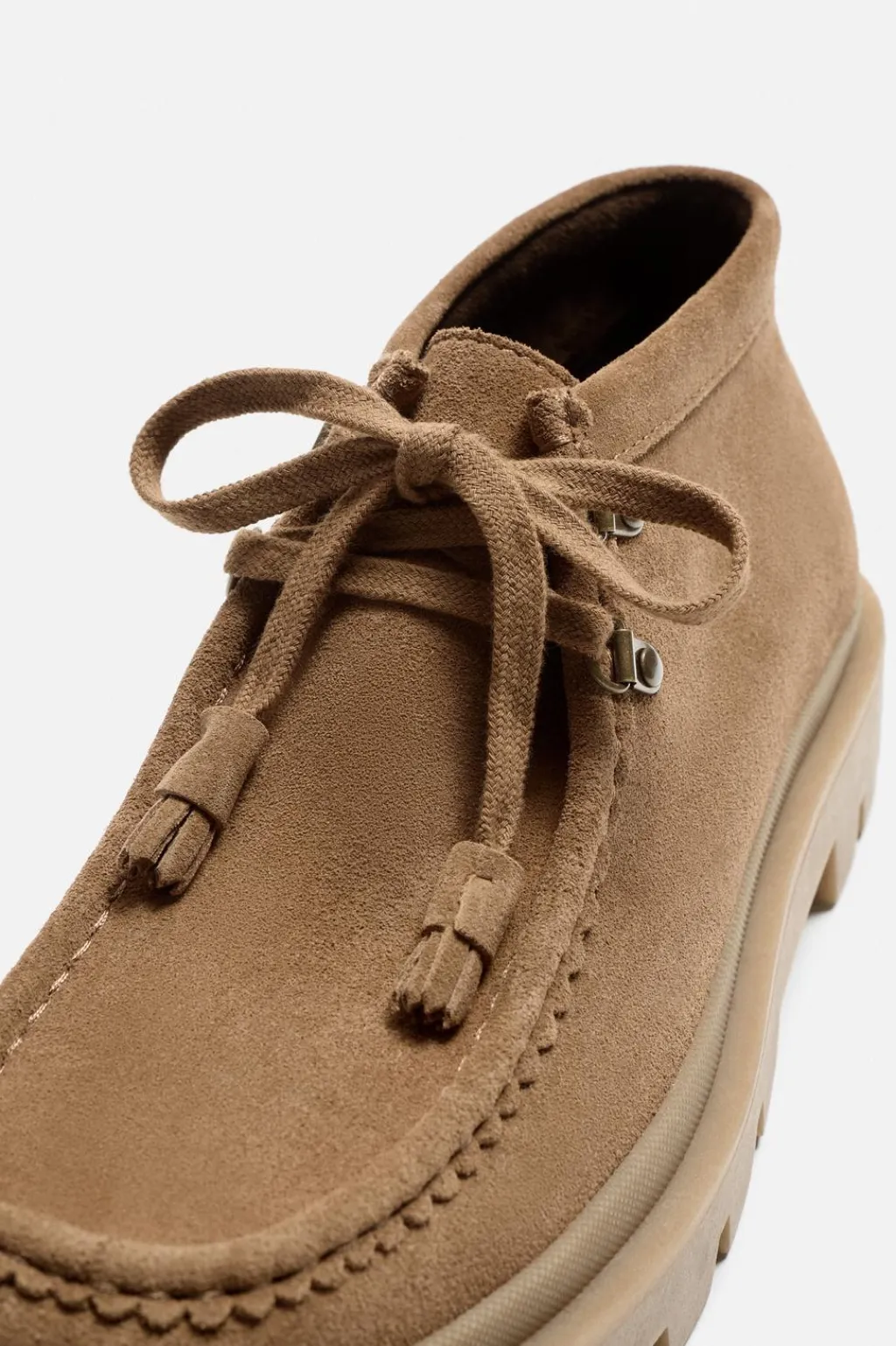 Botín de caña baja. Parte superior fabricada en piel con acabado serraje. Cordonera con dos pasados. Piso con volumen y suela track.