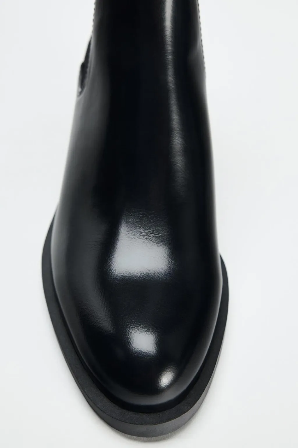 Zapato tipo botín efecto acharolado. Tacón ancho. Caña en tejido. Punta redonda. Tirador trasero.