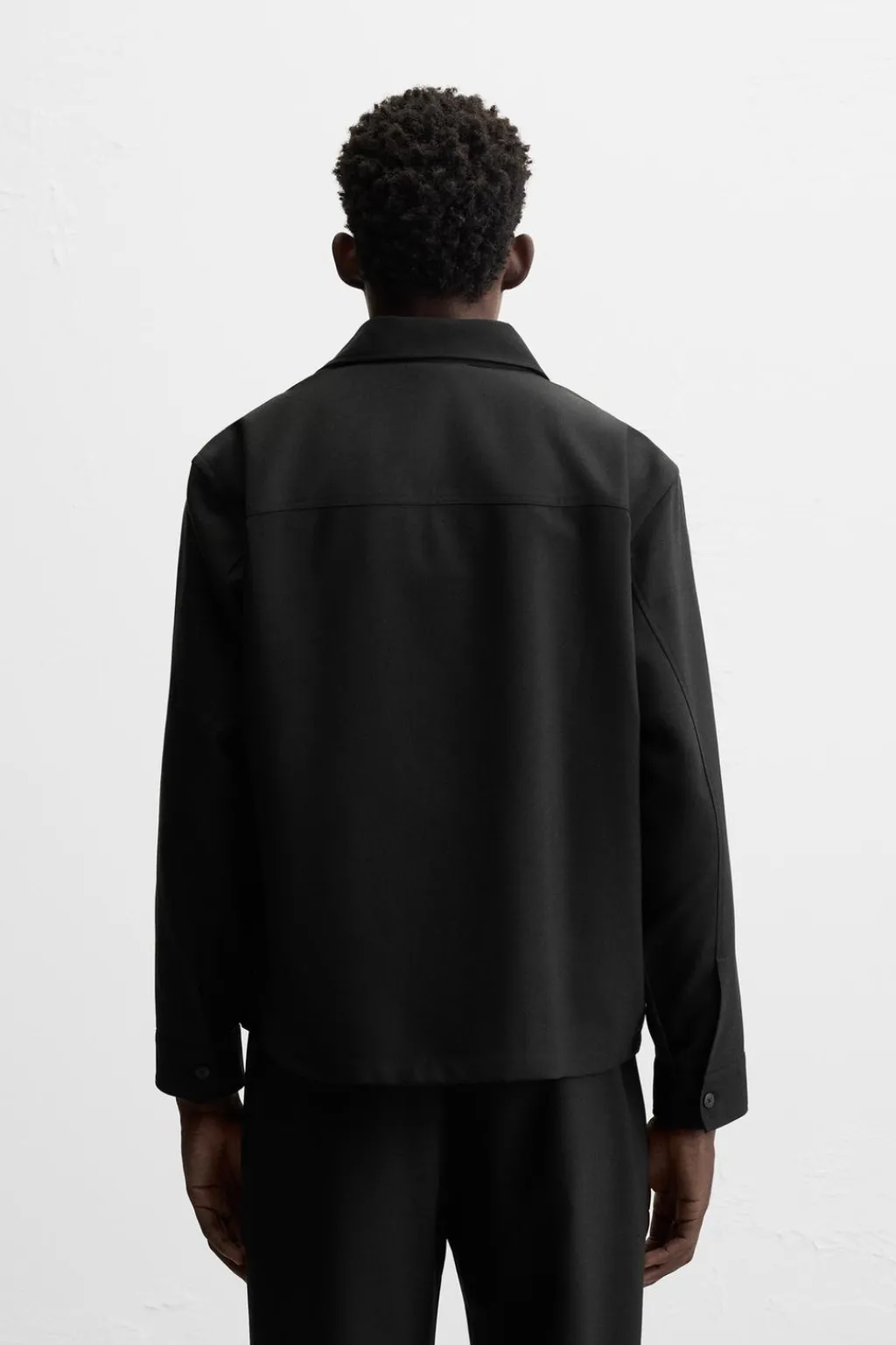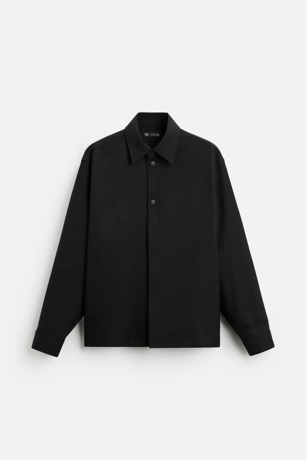 Camisa boxy fit. Cuello solapa y manga larga acabada en puño con botón. Cierre frontal de botonadura parcialmente oculta por solapa.