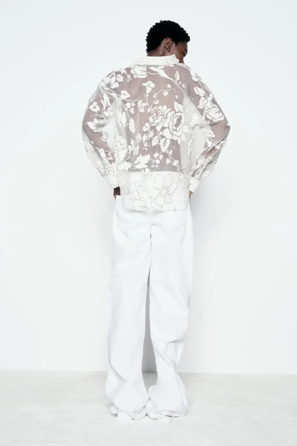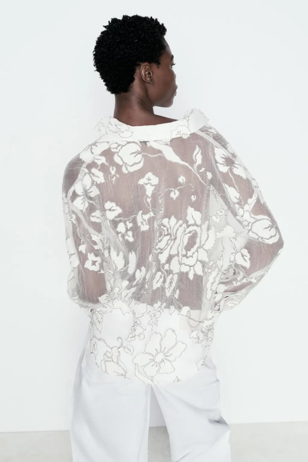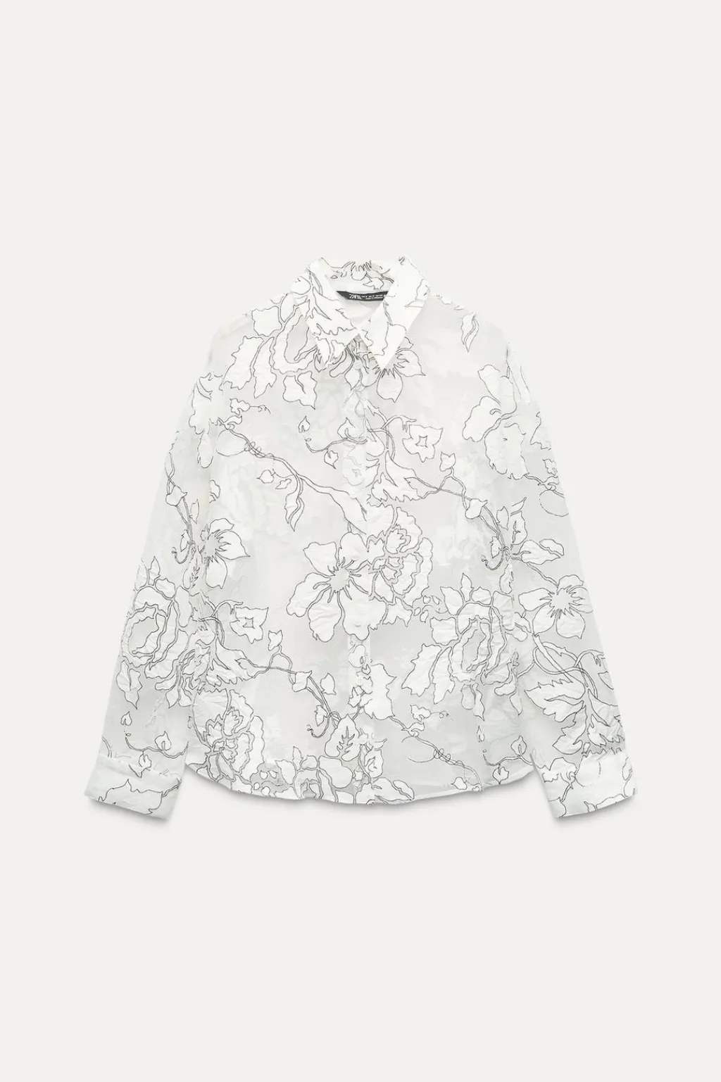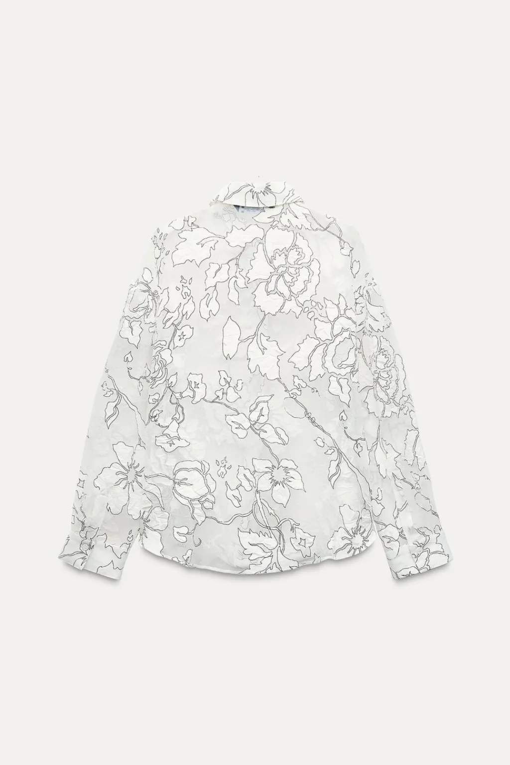 Camisa con tejido semitransparente combinado en devoré. Cuello solapa y manga larga. Cierre frontal con botones.