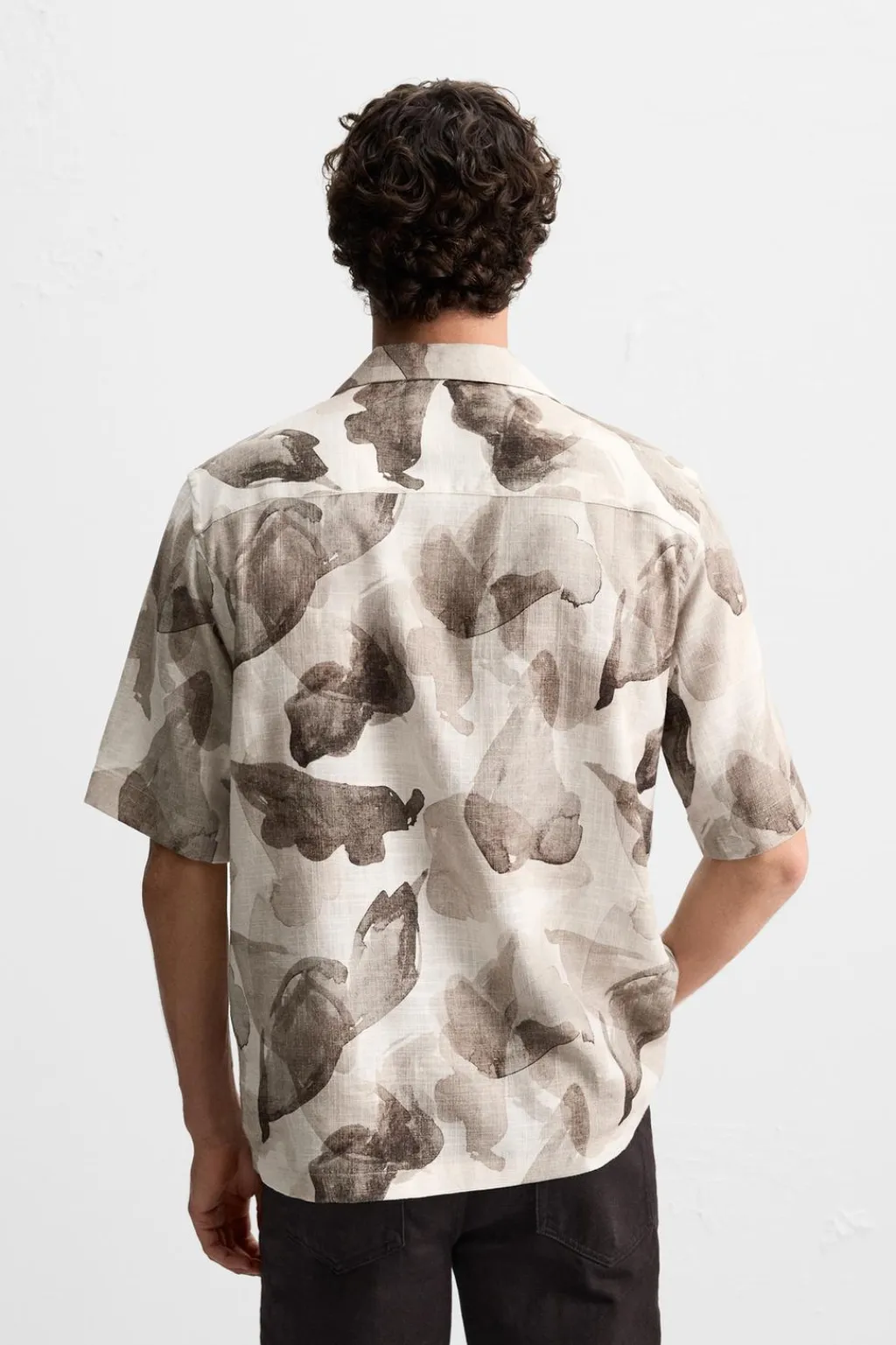 Camisa regular fit confeccionada en tejido con mezcla de viscosa, lyocell y lino. Cuello bowling y manga corta. Bajo con aberturas laterales. Cierre frontal de botonadura.