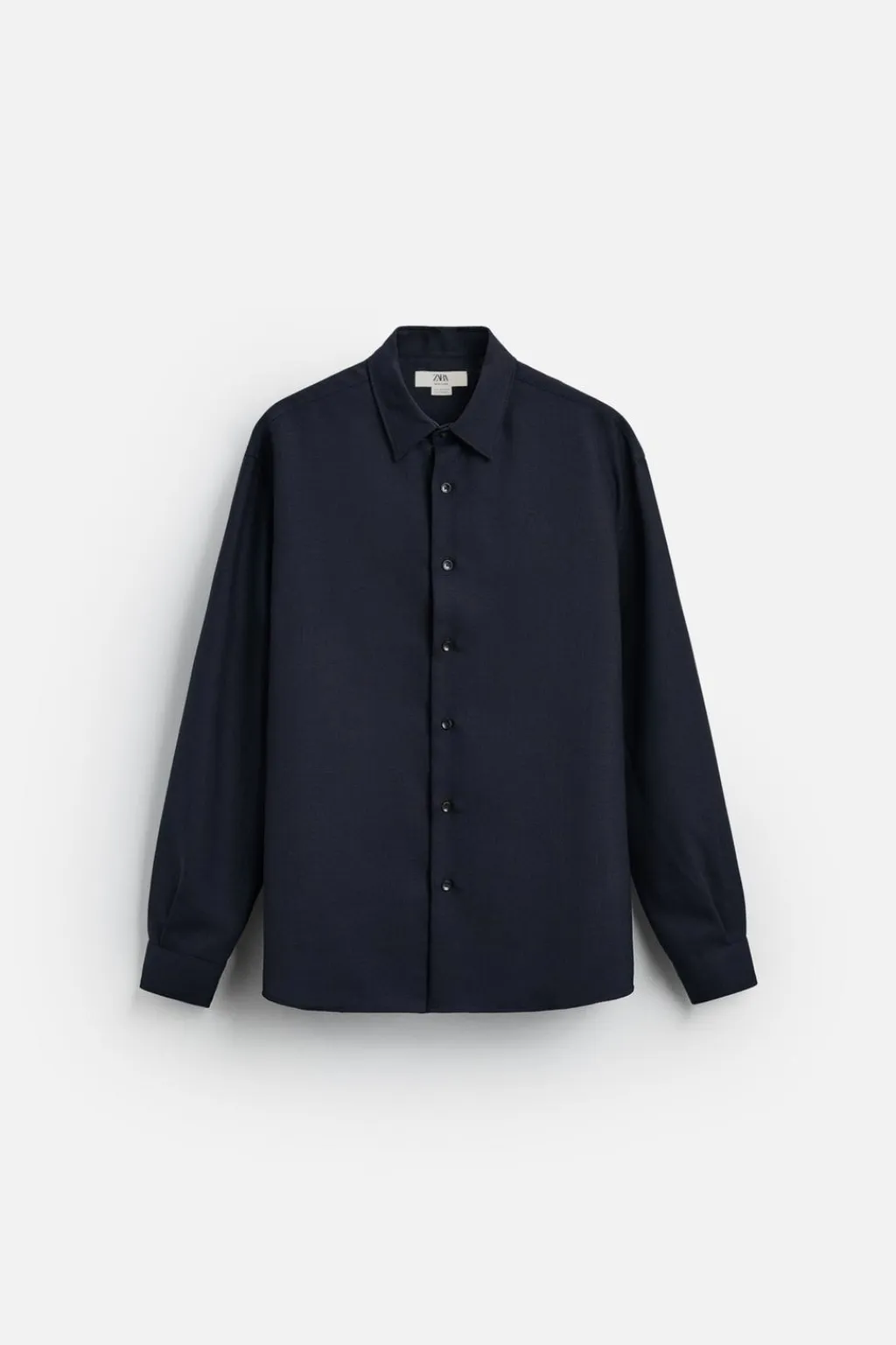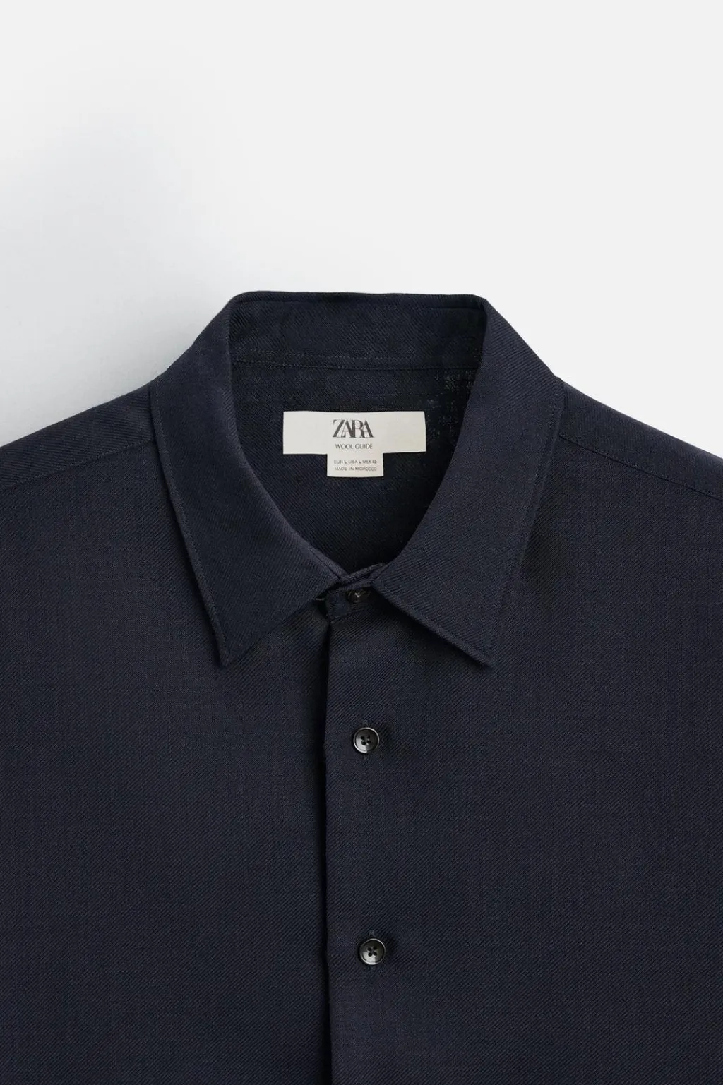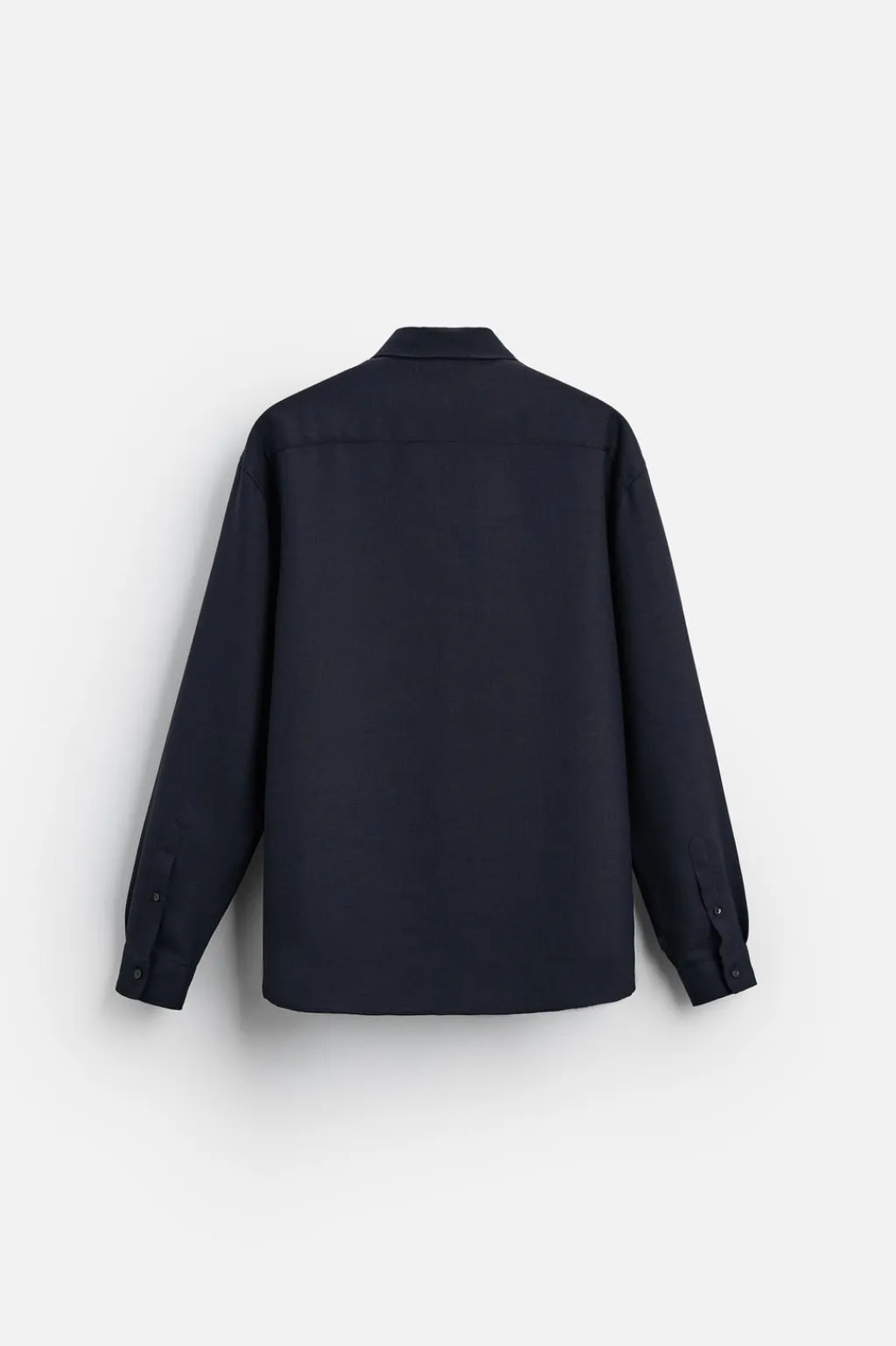Camisa relaxed fit confeccionada en tejido ligero con lana. Cuello italiano y manga larga acabada en puño con botón. Cierre frontal de botonadura.